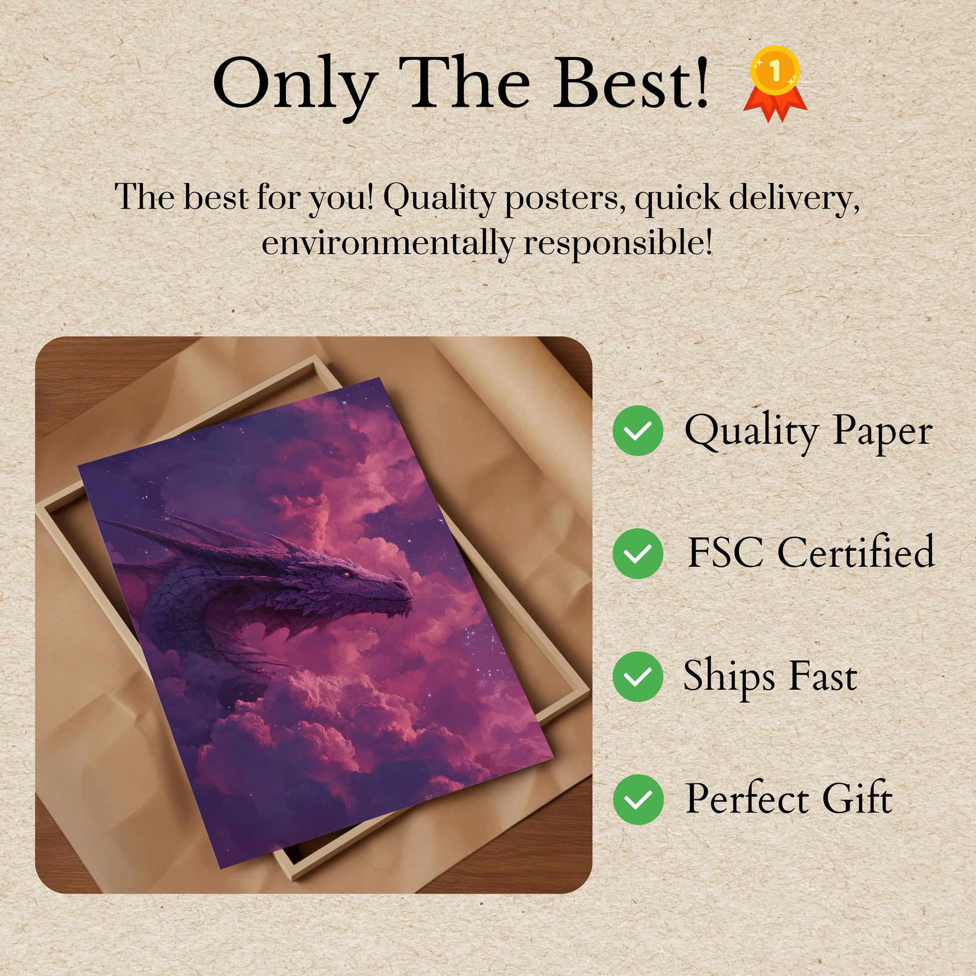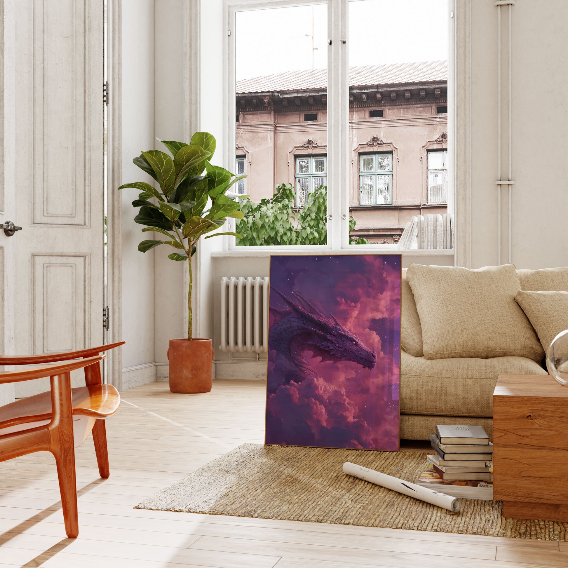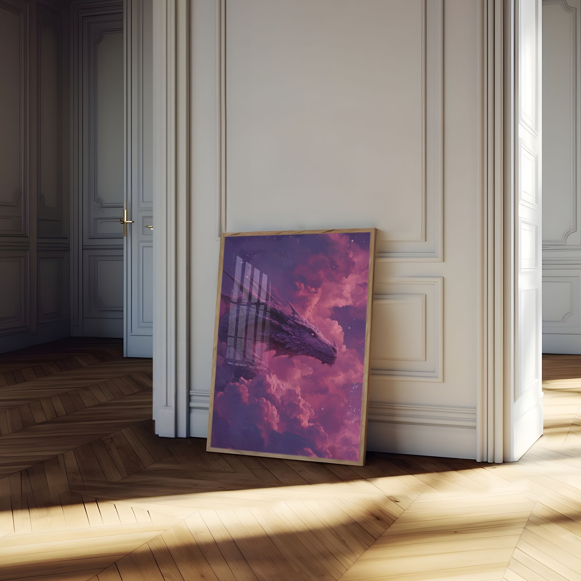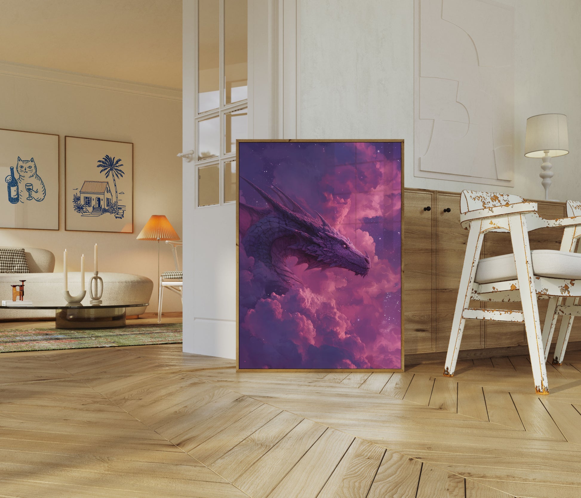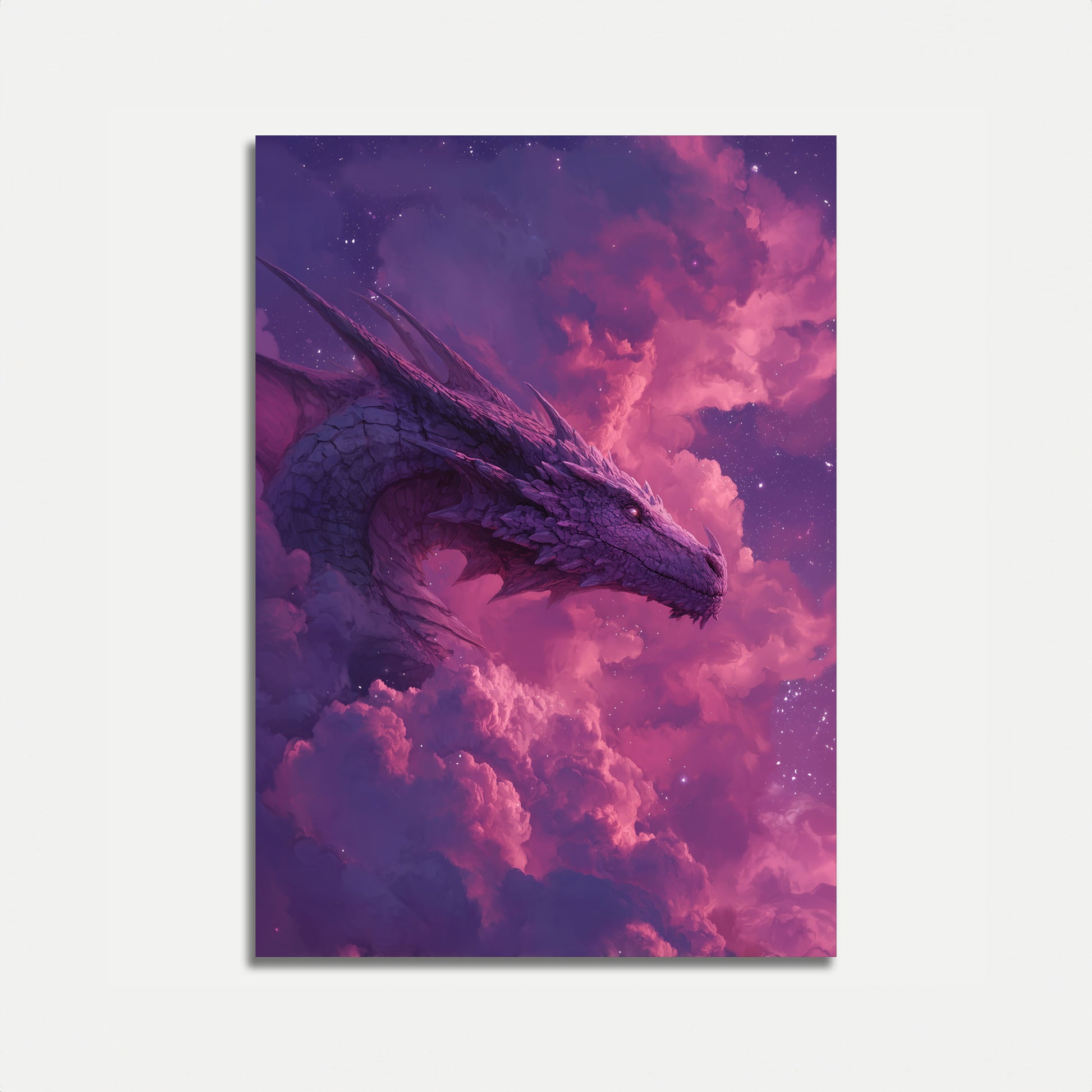 Sumérgete en un mundo fascinante de belleza etérea con esta impresionante obra de arte de dragón sobre un onírico paisaje de nubes en tonos lavanda y rosa. La majestuosa criatura emerge de entre las nubes celestiales, y su intrincado cuerpo escamoso se funde a la perfección con el fondo cósmico estrellado. Los intensos tonos púrpura y rosa crean una atmósfera sobrenatural que cautiva la imaginación y transporta al espectador a un reino de fantasía y asombro.