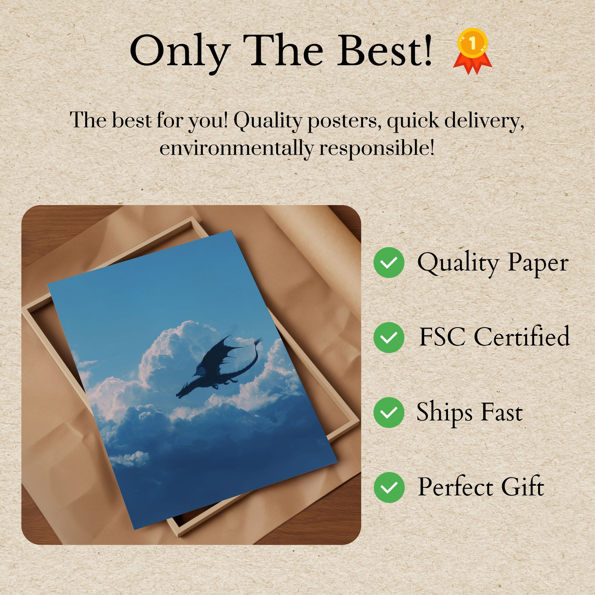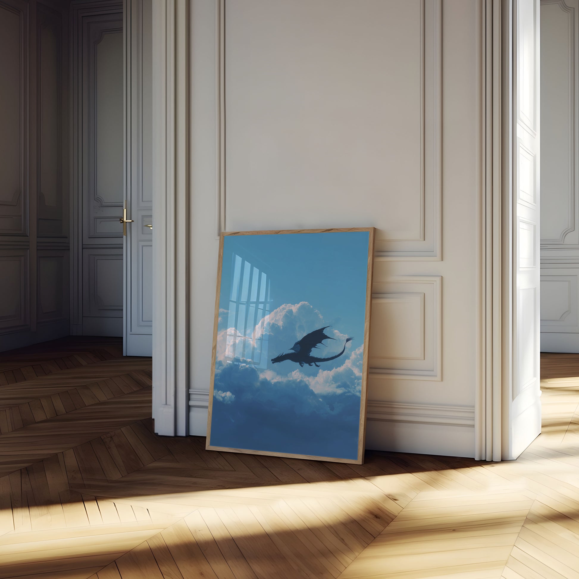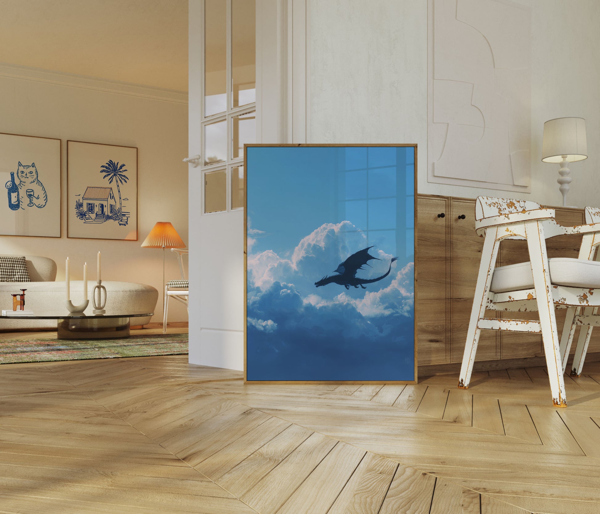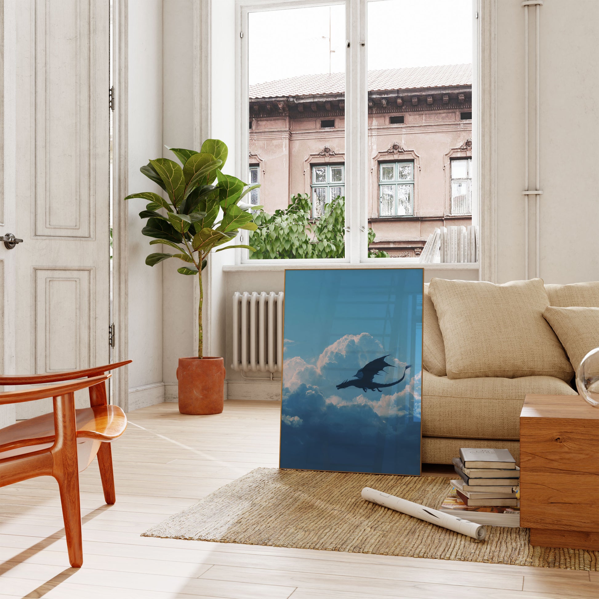 Vuela sobre un impresionante paisaje de nubes con este fascinante póster de dragón que captura la esencia de la libertad mítica. Un elegante y oscuro dragón se desliza majestuosamente sobre un fondo de imponentes cúmulos, creando un impresionante contraste de azules profundos y blanco brillante. La imagen evoca asombro, aventura y la imaginación desbordante de criaturas legendarias que exploran cielos infinitos.