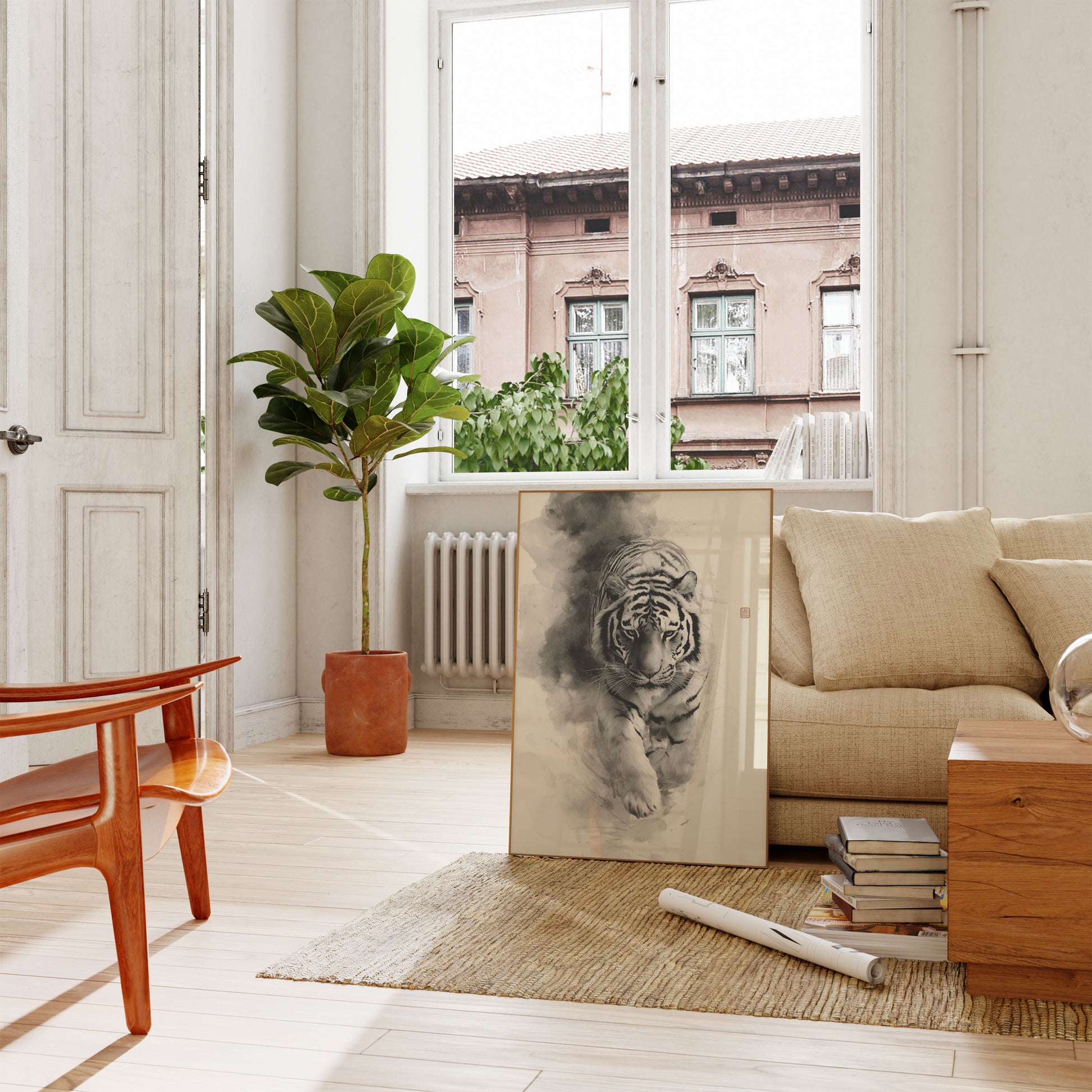 Immerse yourself in the raw power and ethereal beauty of this stunning black and white tiger portrait. Swirling misty clouds surround the majestic creature, capturing its intense gaze and muscular form in a mesmerizing watercolor style that blends realism with artistic abstraction. The delicate yet powerful rendering showcases the tiger's strength and grace, creating a breathtaking focal point for any room.