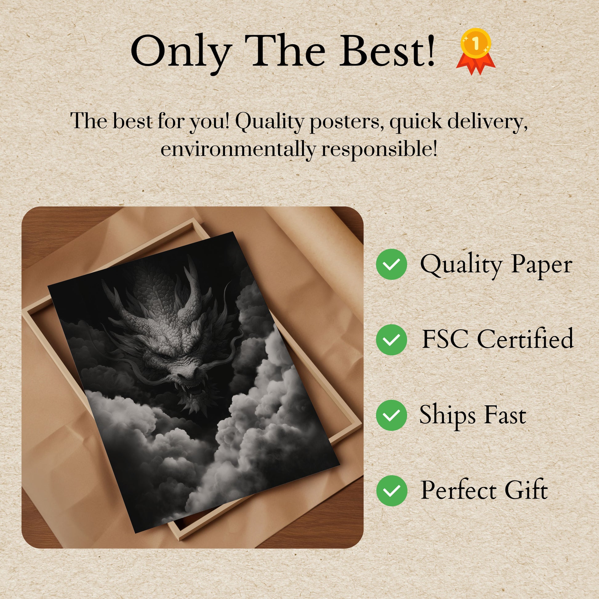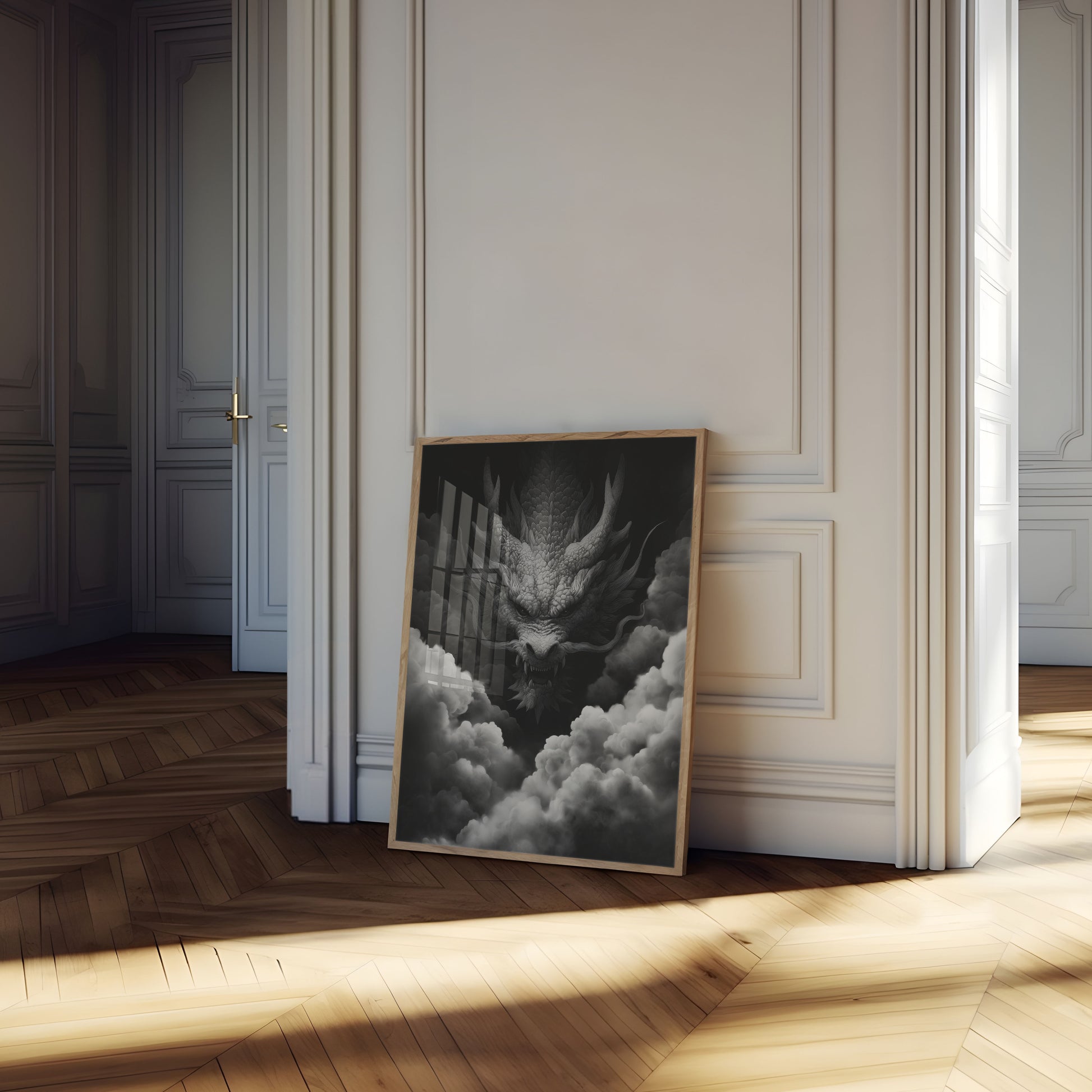 Sumérgete en el reino de la fantasía oscura con esta impresionante obra de arte de un dragón que domina los cielos tormentosos. Sus escamas, detalladas y su expresión feroz, revelan una criatura de inmenso poder, que emerge con dramatismo entre nubes monocromáticas. Esta impactante ilustración en blanco y negro captura la esencia pura y mítica de un antiguo espíritu de dragón, que promete transformar cualquier espacio con su intensa y cautivadora presencia.