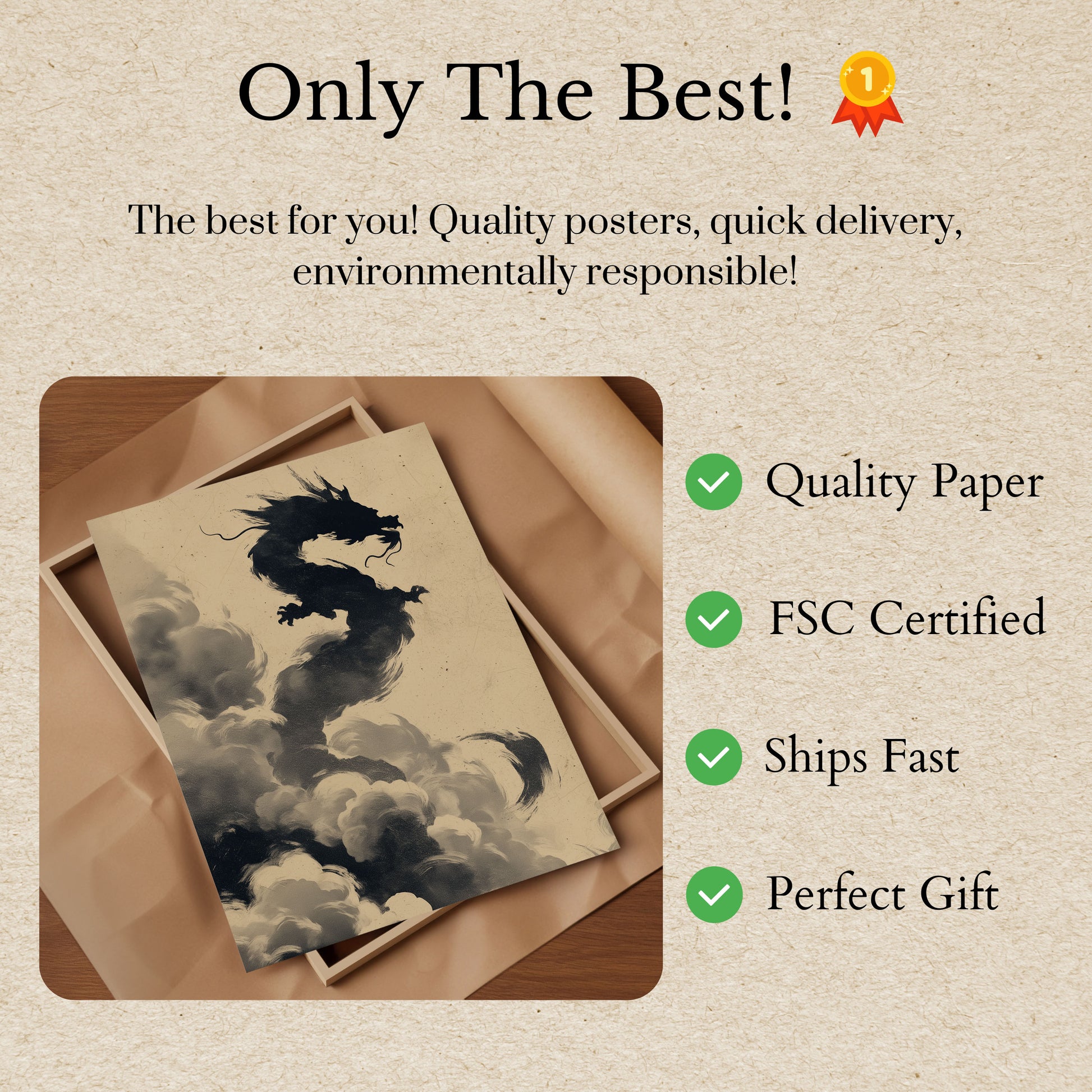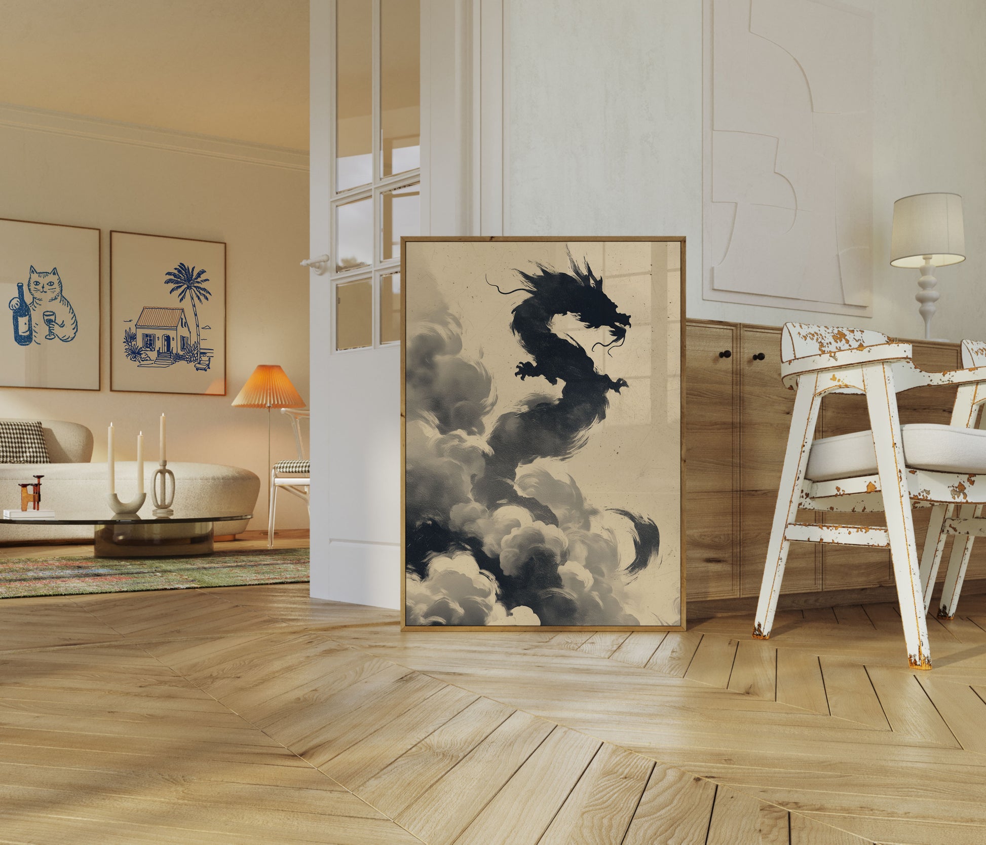 Una impresionante obra monocromática que captura a un poderoso dragón emergiendo de nubes etéreas y arremolinadas. La dramática ilustración en blanco y negro representa a un feroz dragón azotado por el viento, elevándose majestuosamente entre turbulentas formaciones de humo, creando una experiencia visual intensa y cautivadora que parece latir con una energía pura y mítica. Las delicadas pinceladas y el movimiento fluido transforman a esta criatura en una fuerza dinámica, casi viva, de la naturaleza.