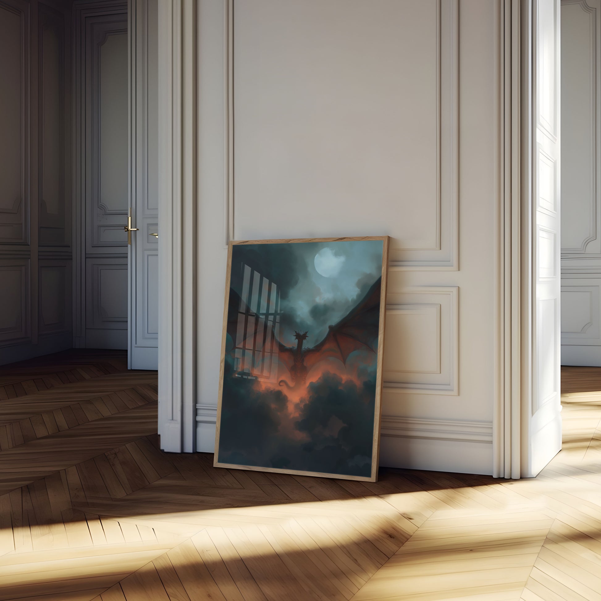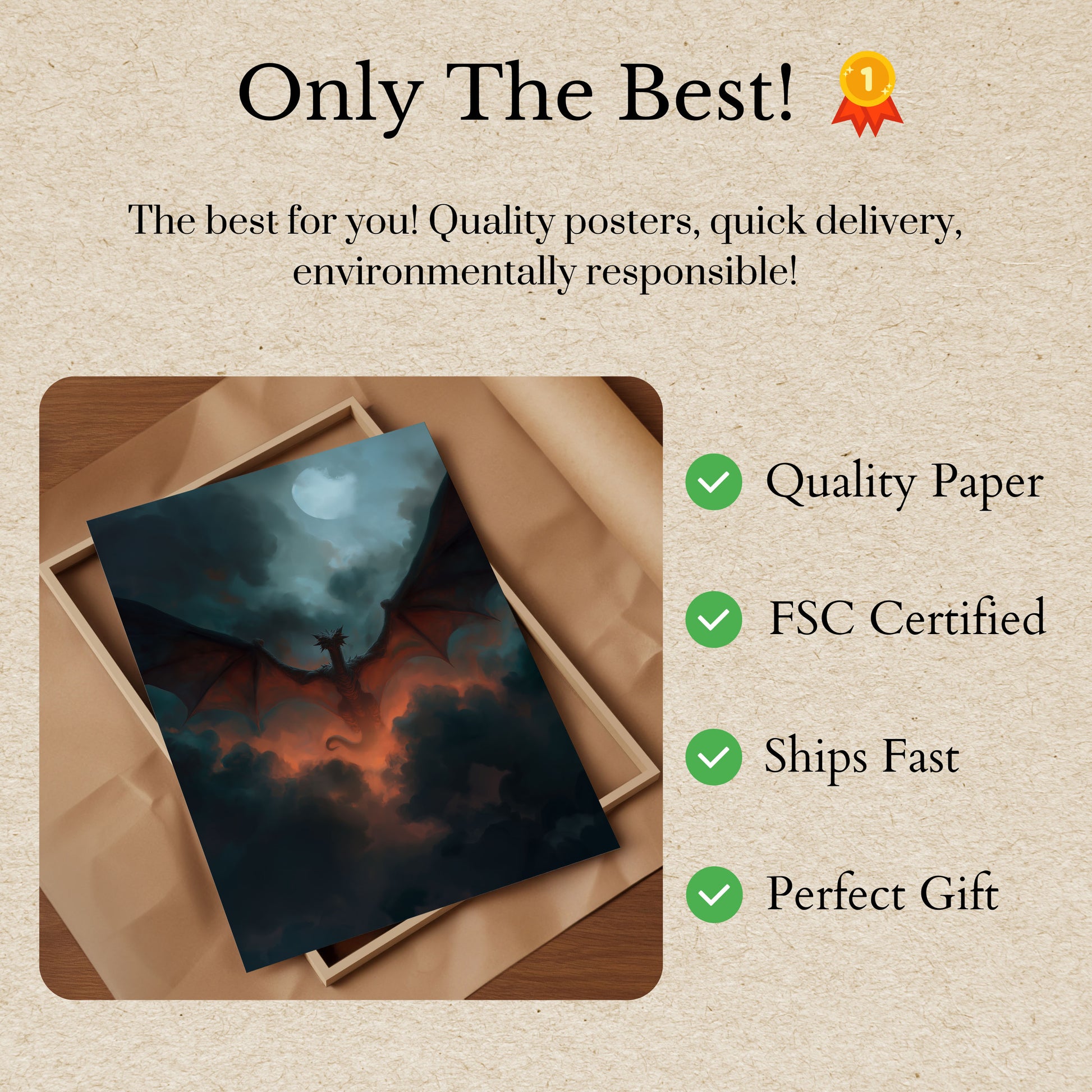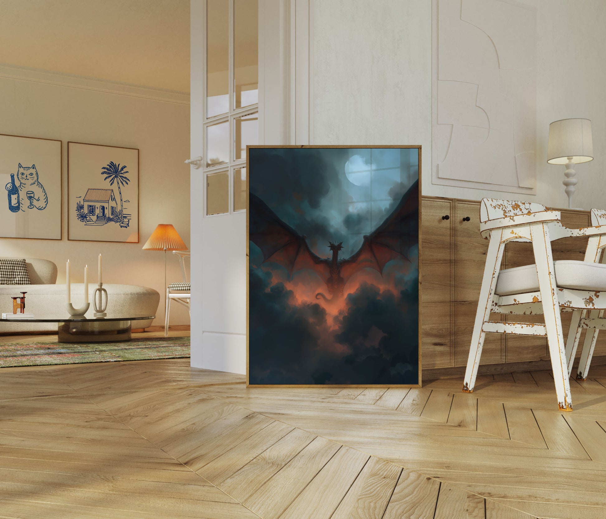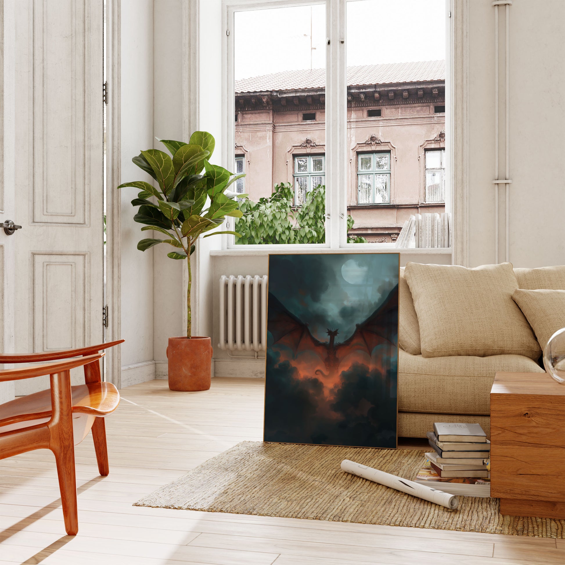 Desata el poder puro de este impresionante póster de dragón, donde la oscuridad y el fuego se fusionan bajo un cielo inquietante iluminado por la luna. Dramáticos tonos naranja y verde azulado crean una atmósfera intensa, capturando las majestuosas alas desplegadas y la imponente silueta de la mítica criatura contra las nubes turbulentas y arremolinadas. Esta fascinante obra de arte transforma cualquier espacio con su visión épica y fantástica de otro mundo.