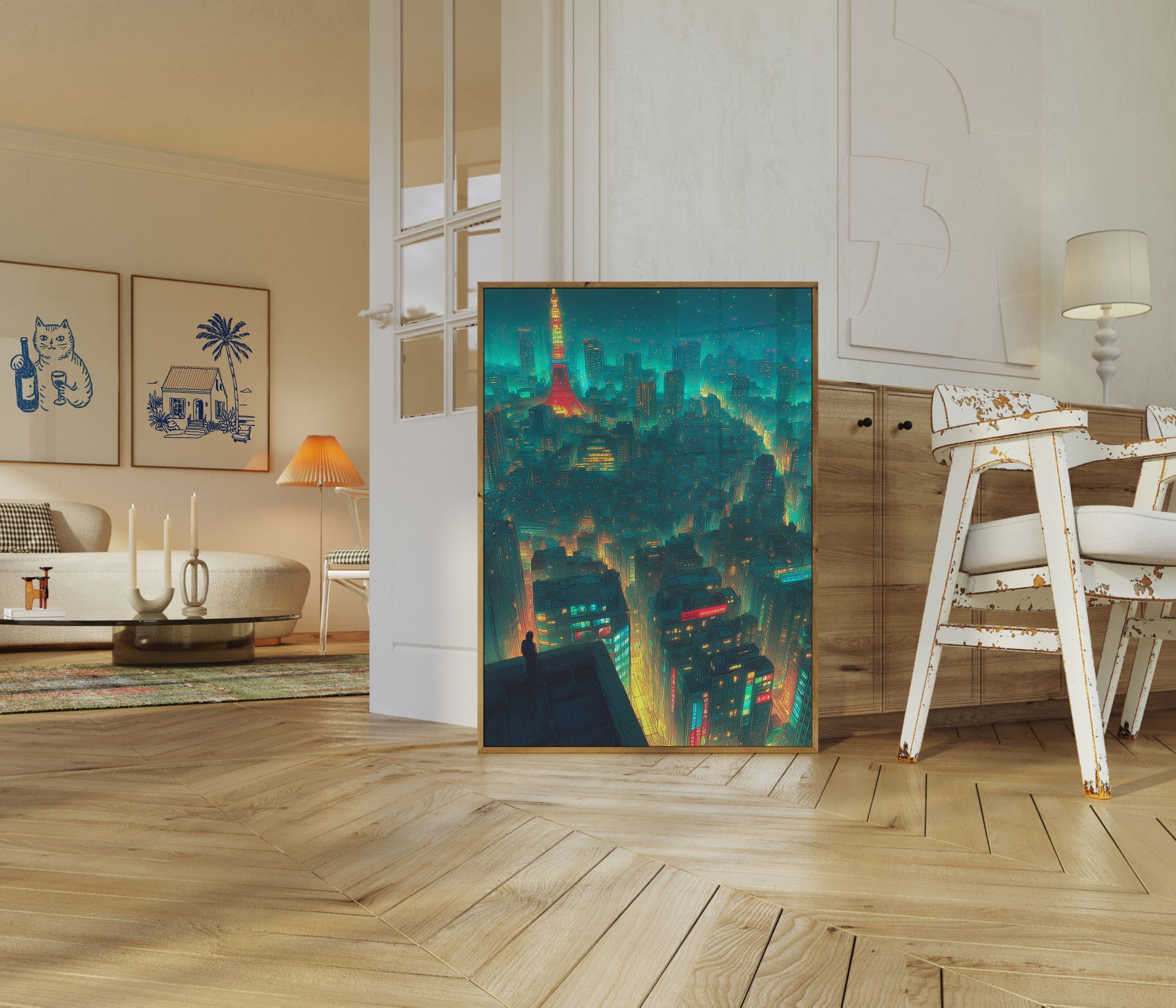 Sumérgete en el electrizante paisaje onírico de un Tokio futurista, donde imponentes rascacielos vibran con una etérea luz verde azulado y ámbar. Este fascinante paisaje urbano ciberpunk captura la impresionante vista desde una azotea, con la icónica Torre de Tokio brillando como un faro carmesí en medio de un mar de luminosa arquitectura urbana. Cada ventana y calle brilla con una intensidad sobrenatural, creando un paisaje hipnótico que fusiona tecnología, aislamiento y belleza urbana natural.