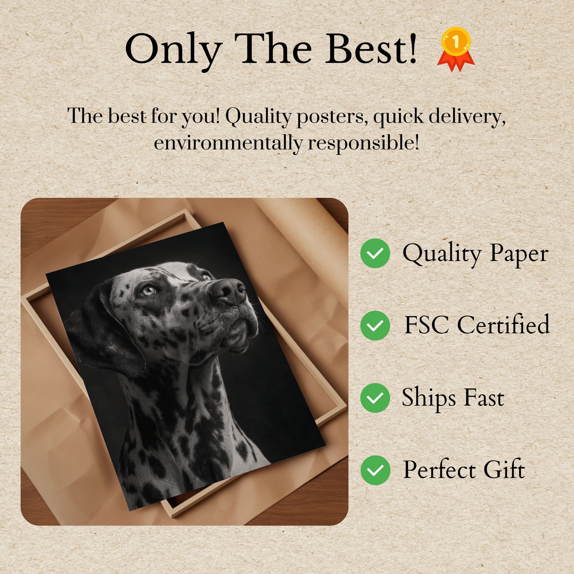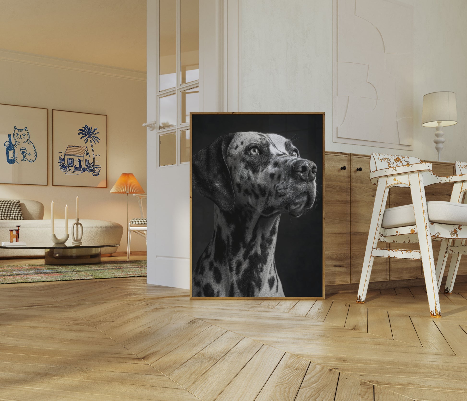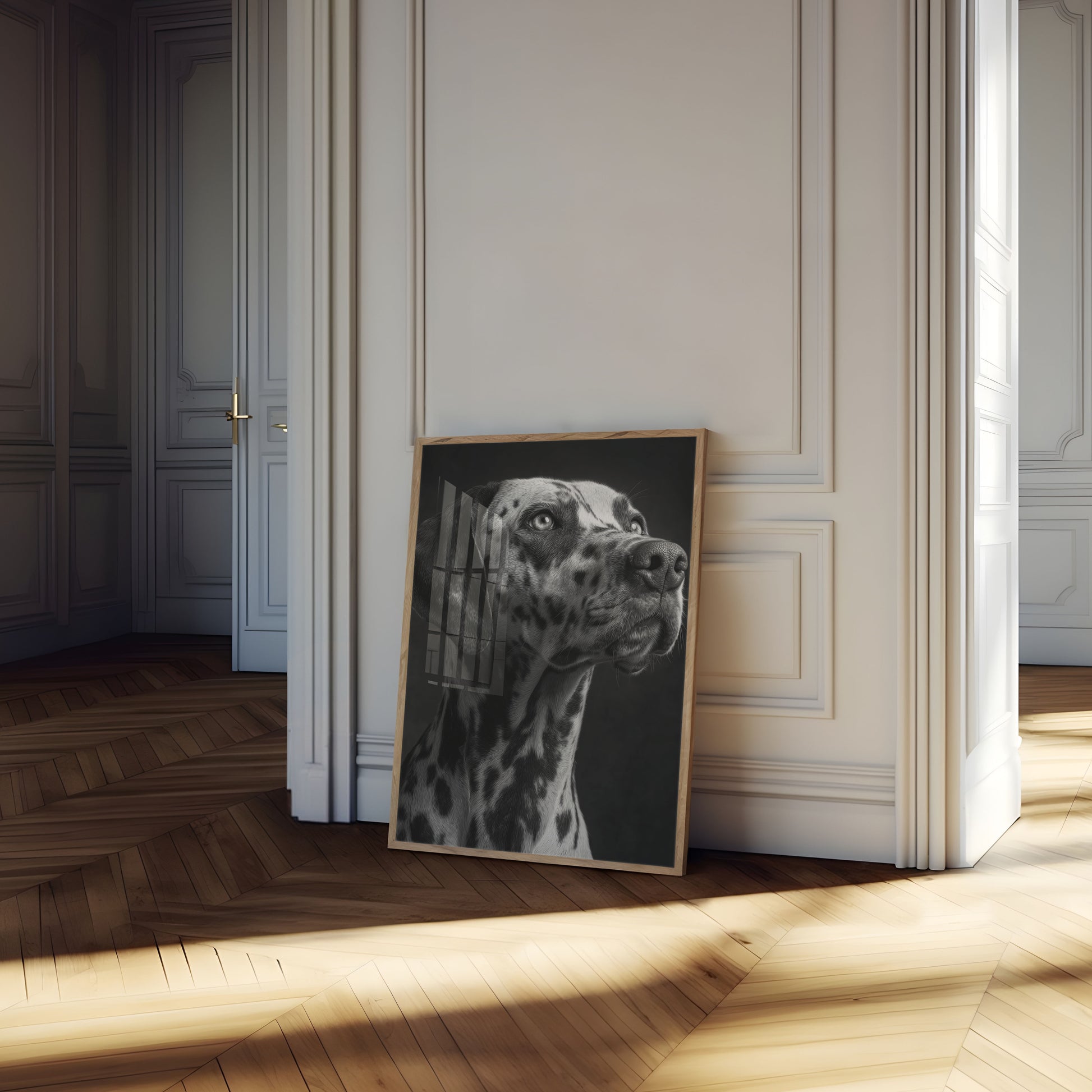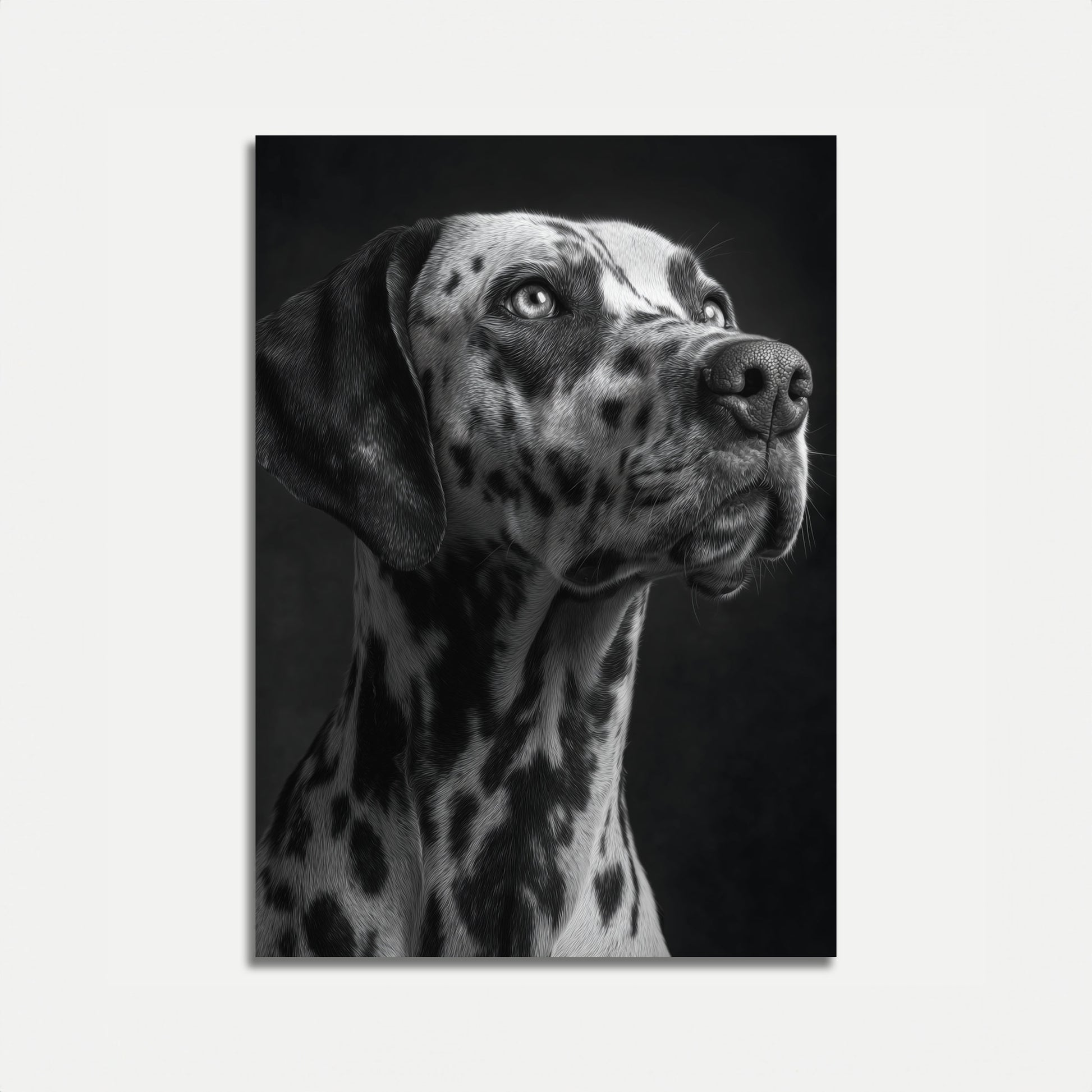 Captura la elegancia de un majestuoso dálmata en este impresionante retrato fotorrealista en blanco y negro. Esta extraordinaria obra de arte muestra el distinguido perfil del perro con increíble detalle, revelando la profunda emoción e inteligencia de su mirada conmovedora. Cada sutil textura y sombreado matizado da vida a este noble canino sobre un dramático fondo oscuro.