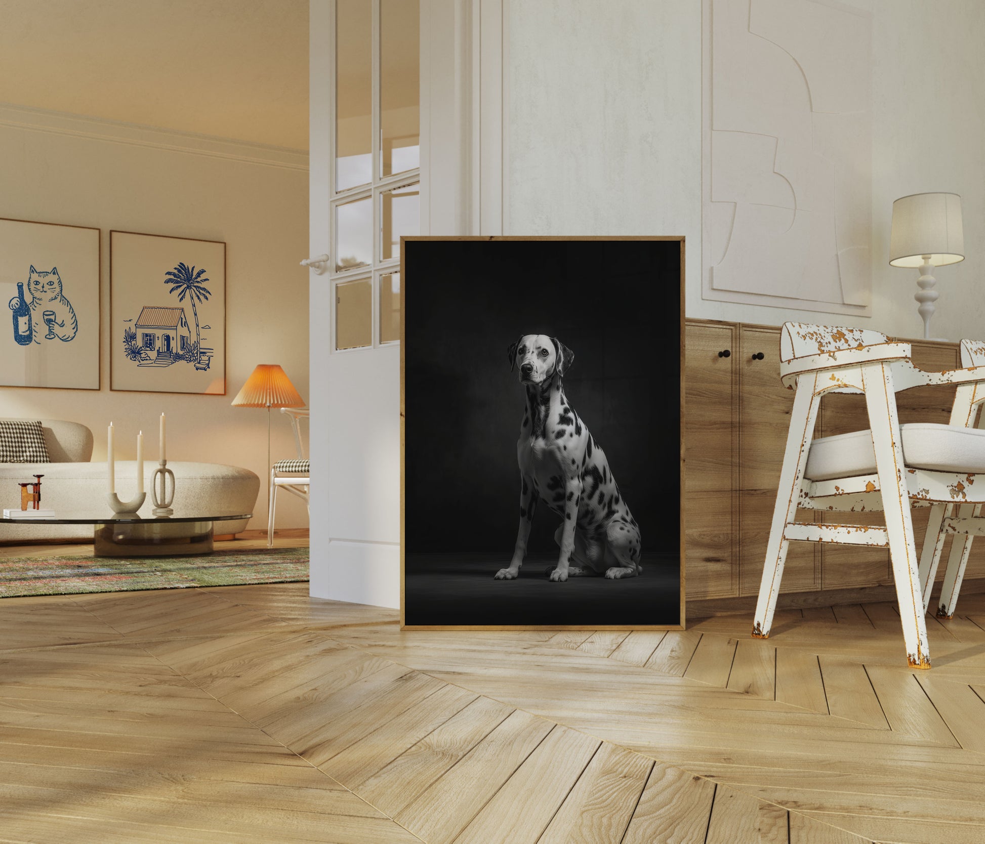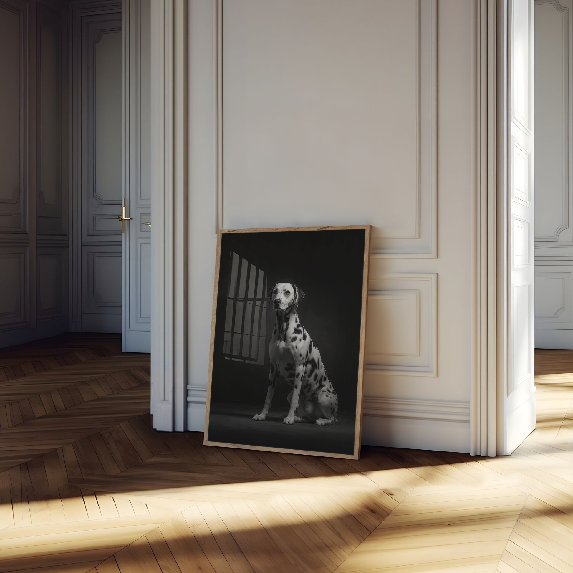 Descubra la elegancia de este impactante retrato en blanco y negro de un dálmata, capturado en un instante de majestuosa quietud. Sobre un fondo oscuro y sombrío, el distintivo pelaje moteado del perro crea un fascinante contraste de luz y oscuridad. Esta sofisticada obra fotográfica captura el noble espíritu y la belleza única de la raza dálmata con una claridad y profundidad impresionantes.