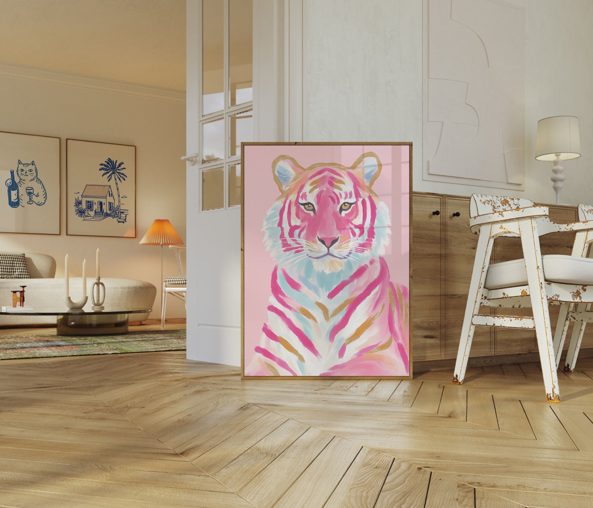 Este retrato impresionante de un tigre rebosa tonos rosa vibrantes y azules suaves, transformando al majestuoso depredador en una obra de arte etérea y onírica. Destellos dorados delicados y pinceladas al estilo acuarela crean una estética hipnótica que combina energía feroz con colores delicados y románticos. Los penetrantes ojos dorados del tigre capturan la atención sobre un fondo rosa suave, convirtiendo este póster en una pieza emblemática para amantes de los animales y el arte.