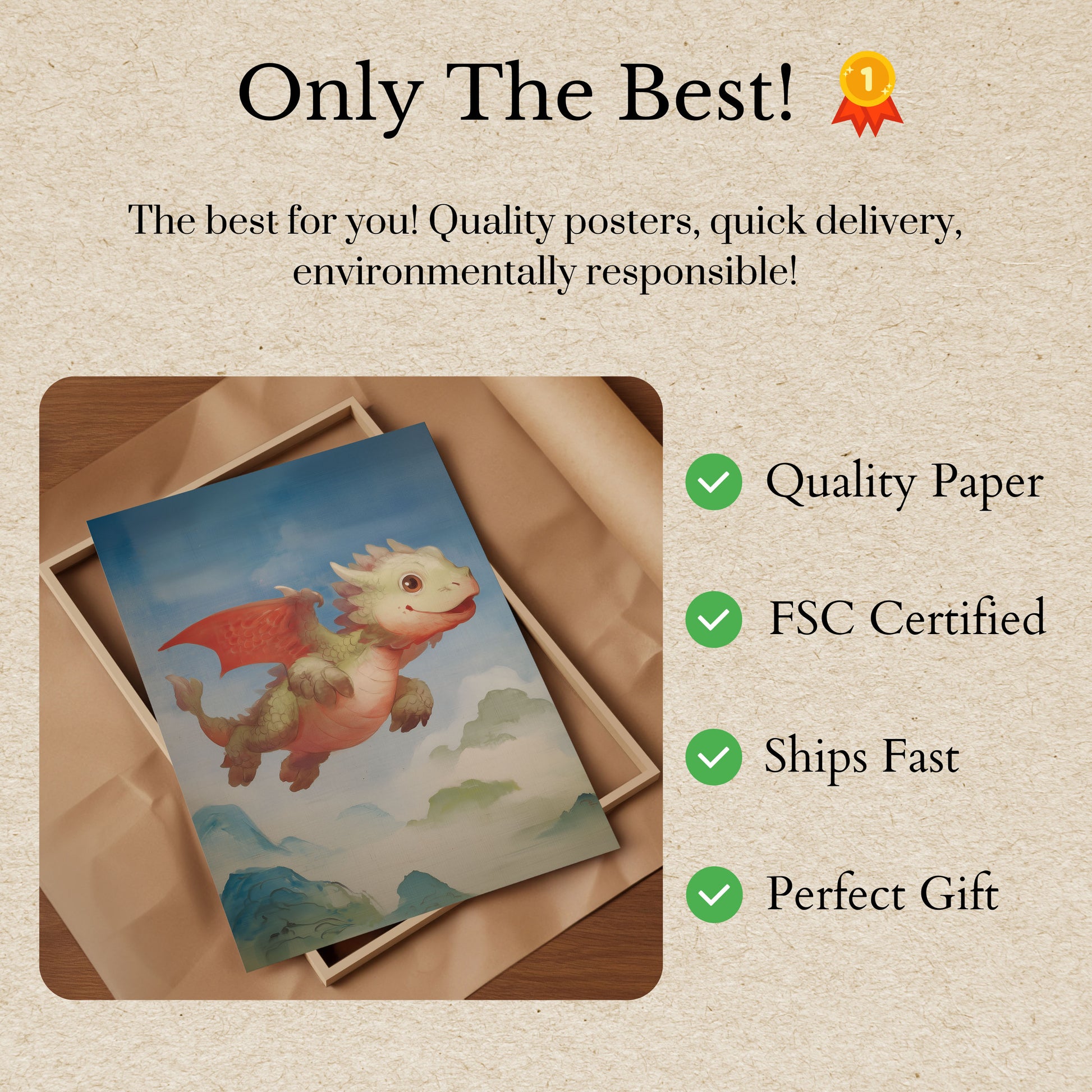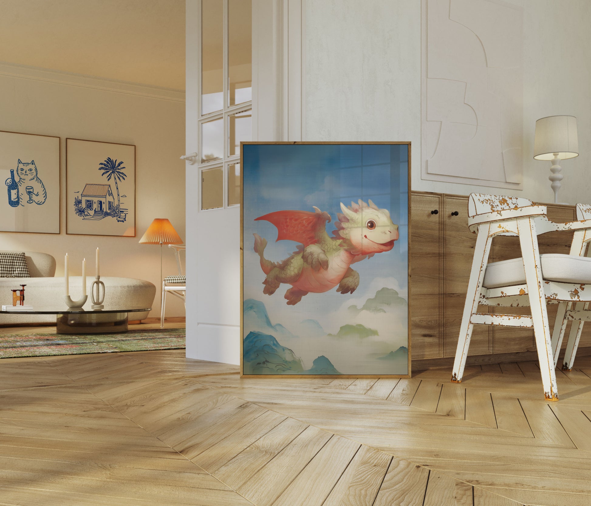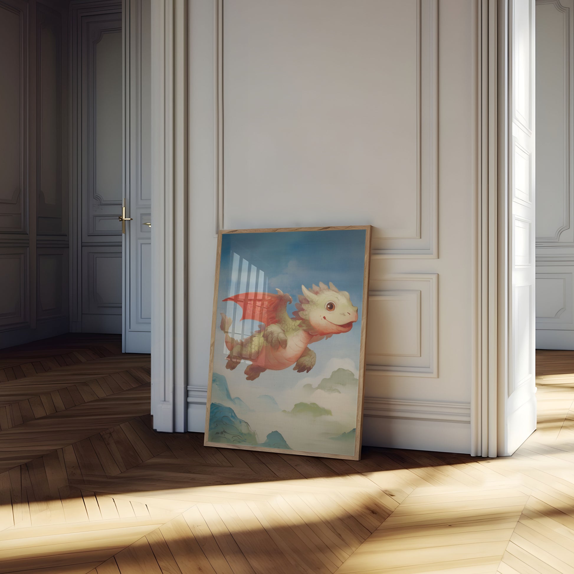 Sumérgete en un mundo mágico con este adorable bebé dragón que se desliza con gracia sobre brumosos paisajes montañosos. Los suaves tonos pastel verde, salmón y azul crean una atmósfera de ensueño, mientras que los expresivos ojos y la alegre sonrisa del adorable dragón invitan a los espectadores a un mundo de maravillas e imaginación.