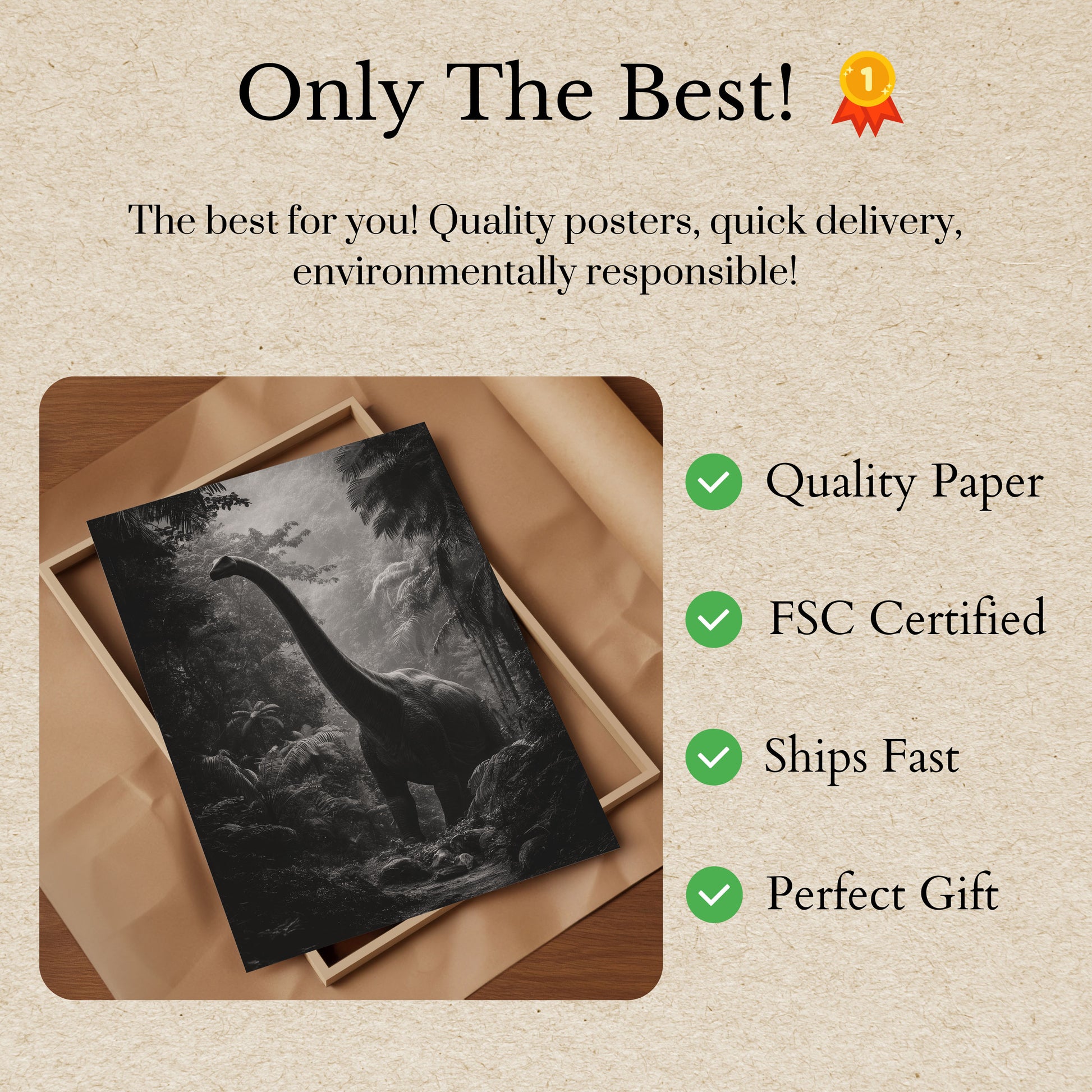 Adéntrese en un brumoso mundo prehistórico donde un majestuoso brontosaurio se alza entre palmeras centenarias y exuberante vegetación. Esta impresionante obra de arte en blanco y negro captura la esencia serena y a la vez poderosa del paisaje prehistórico de la Tierra, con una luz tenue que se filtra a través del denso follaje tropical e ilumina la imponente silueta del gentil gigante. La evocadora escena transporta al espectador a un momento primigenio congelado en el tiempo, evocando asombro y misterio.