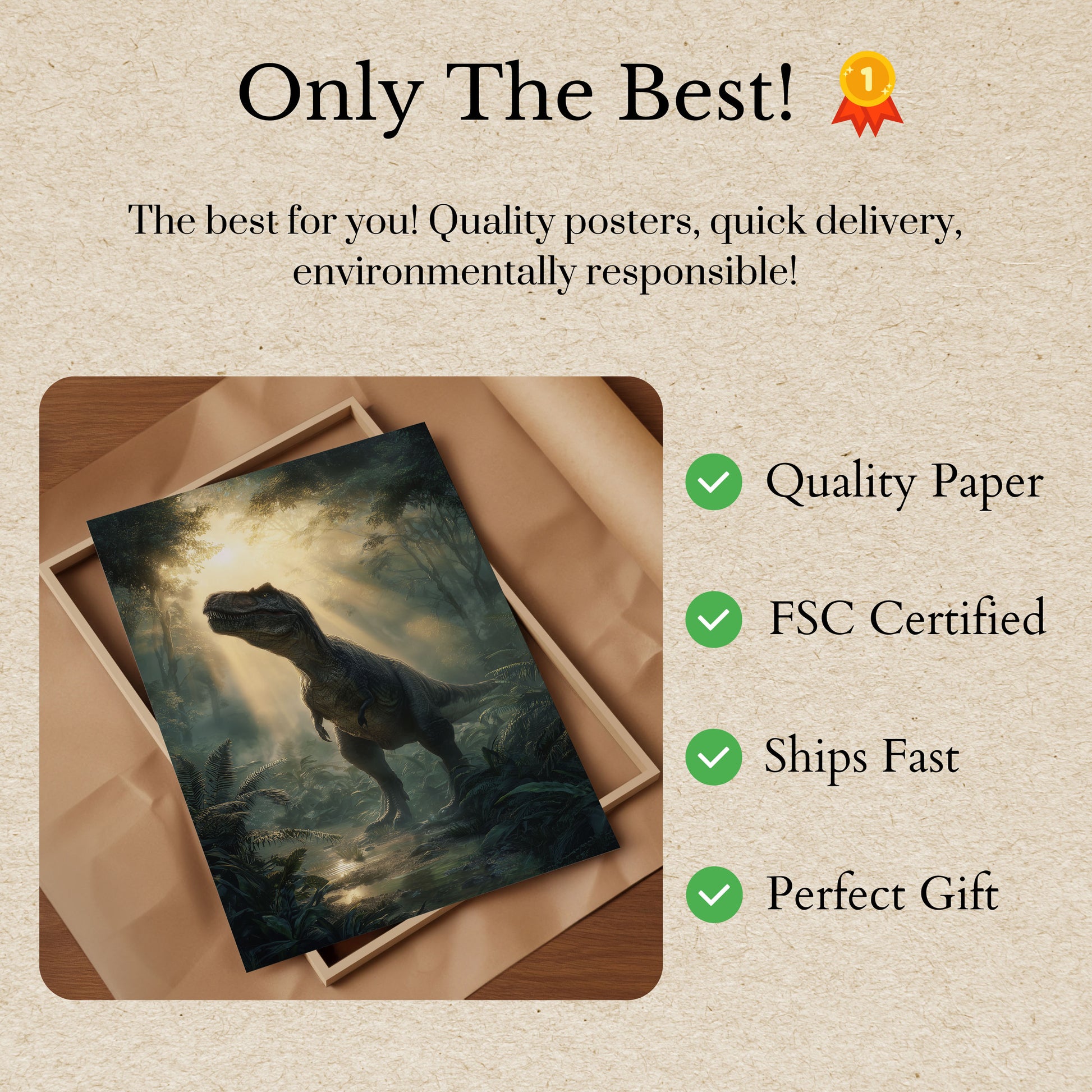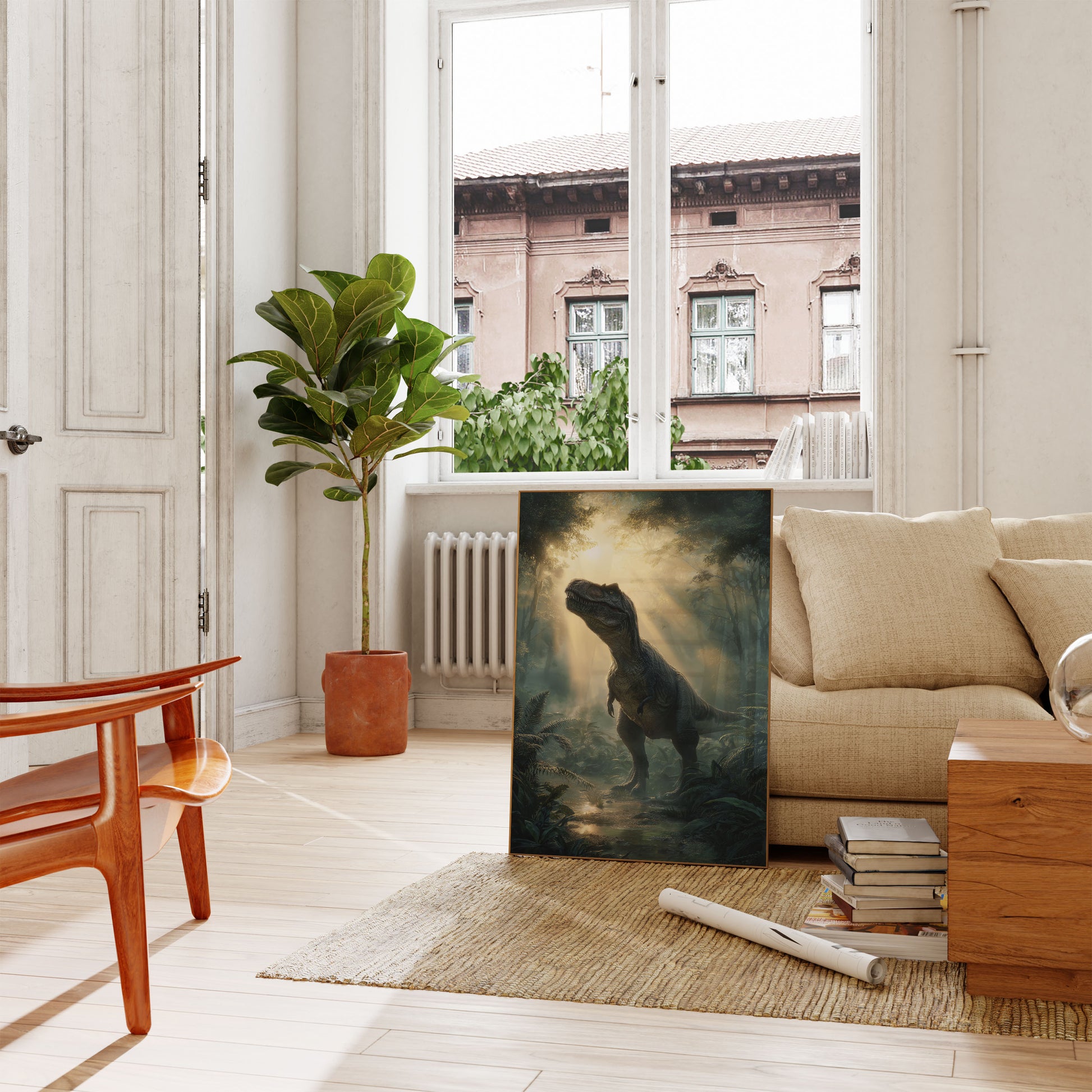 Adéntrate en el mundo primigenio del Tiranosaurio Rex, donde la mística luz del sol penetra a través de las antiguas copas de los árboles. Esta impresionante obra de arte de dinosaurios captura la fuerza bruta y la majestuosa presencia del depredador supremo, entre exuberantes helechos y brumosos paisajes forestales. Cada detalle de la piel texturizada y la feroz postura del T-Rex evocan dominio prehistórico sobre un fondo natural de una belleza cautivadora.