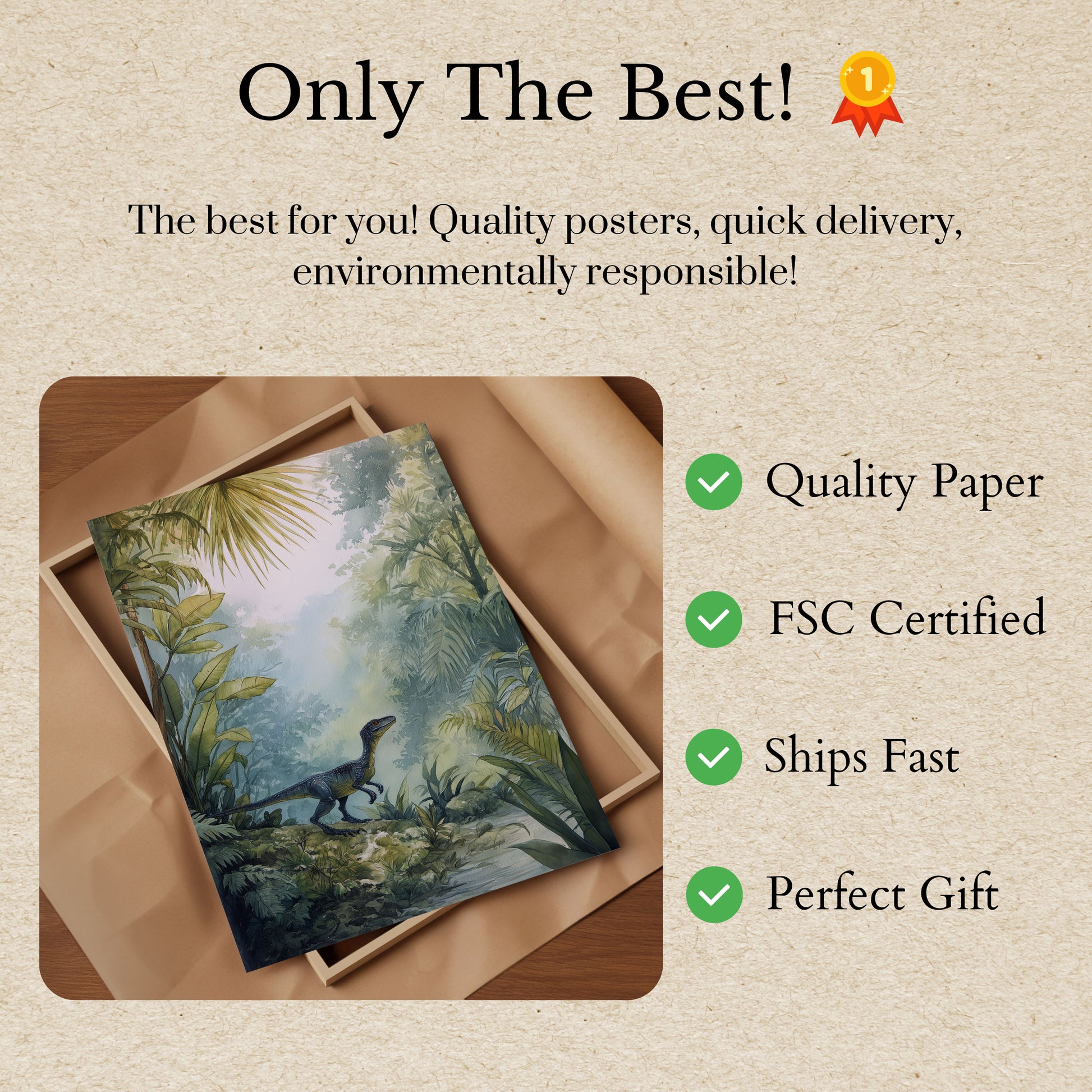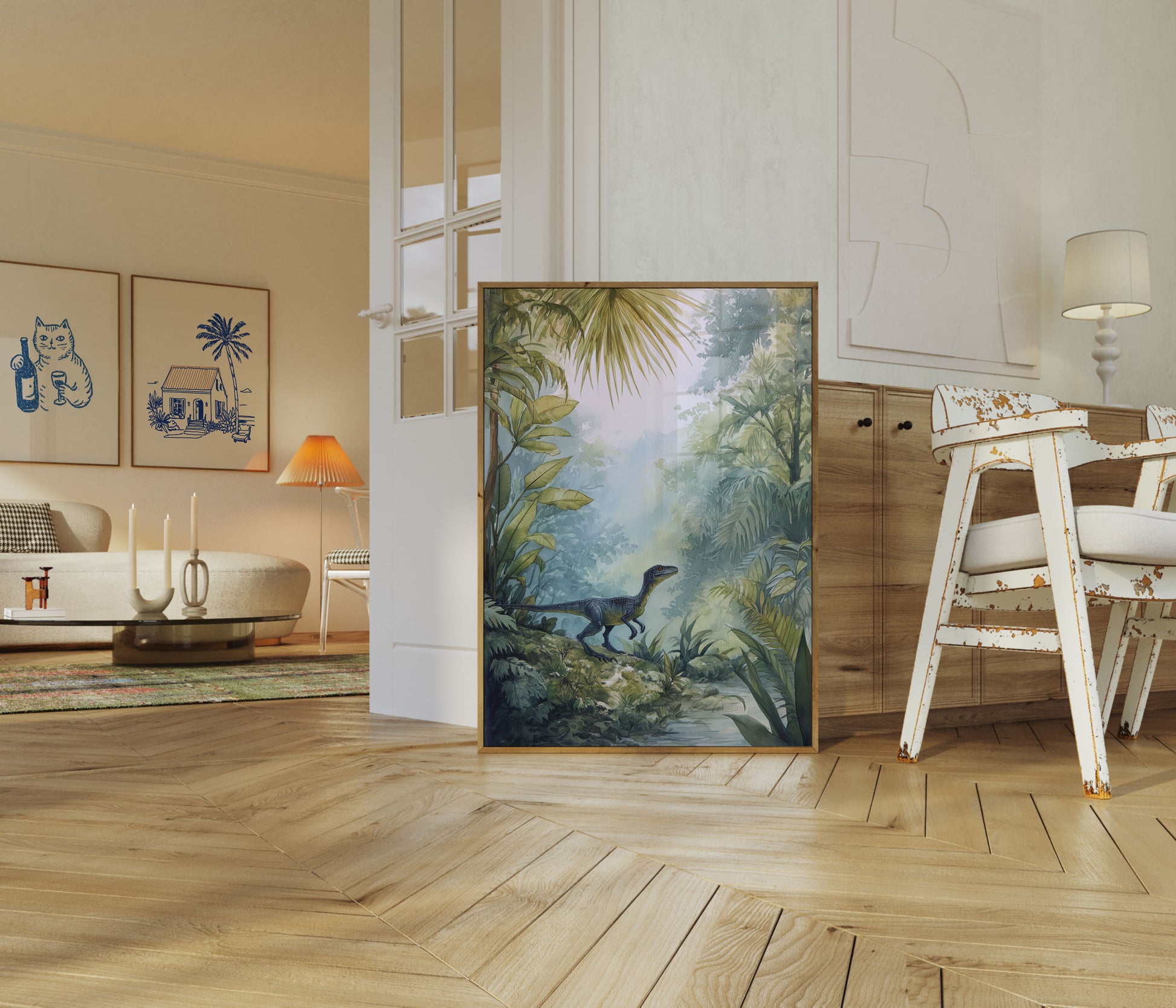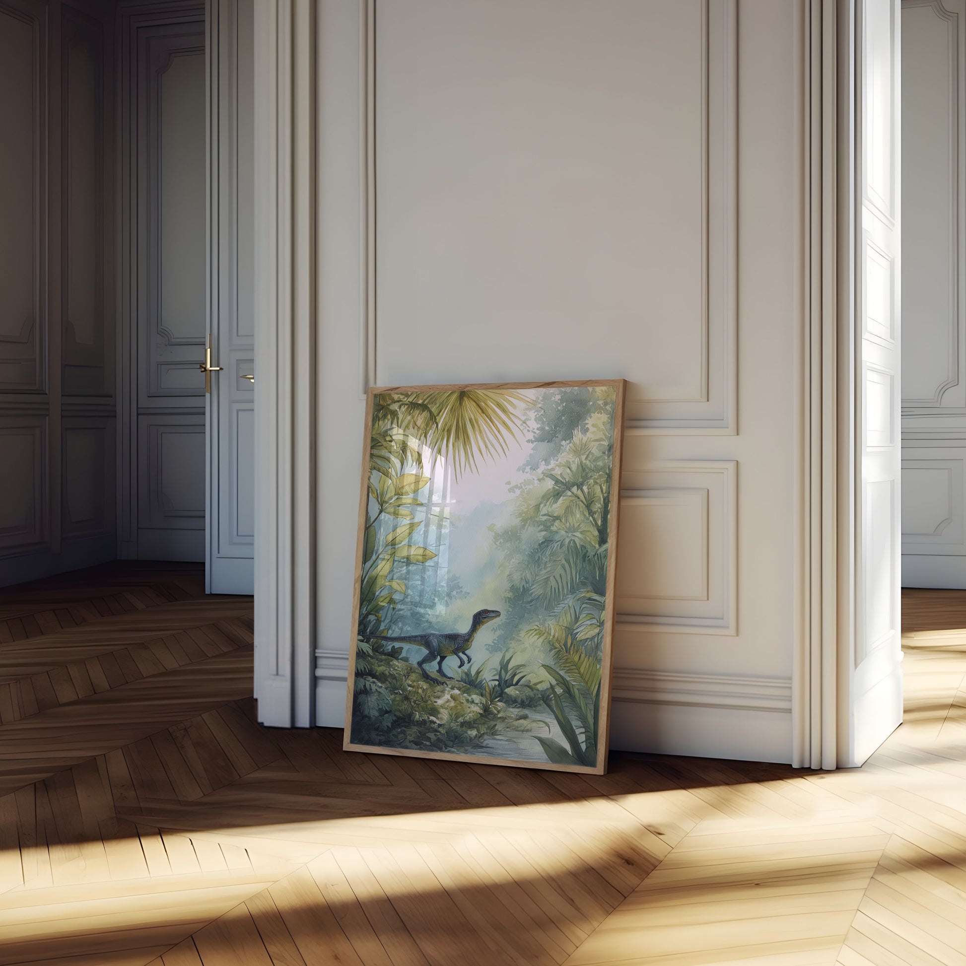 Adéntrate en un brumoso mundo prehistórico donde un elegante velociraptor merodea por un exuberante paisaje selvático de color esmeralda. Esta impresionante acuarela captura la belleza natural y la atmósfera misteriosa de la era de los dinosaurios, con suaves tonos verdes y azules que crean un entorno etéreo y de ensueño. El detallado dinosaurio se yergue en equilibrio entre delicadas hojas de palmera y vegetación neblinosa, invitando al espectador a un momento congelado en la prehistoria.
