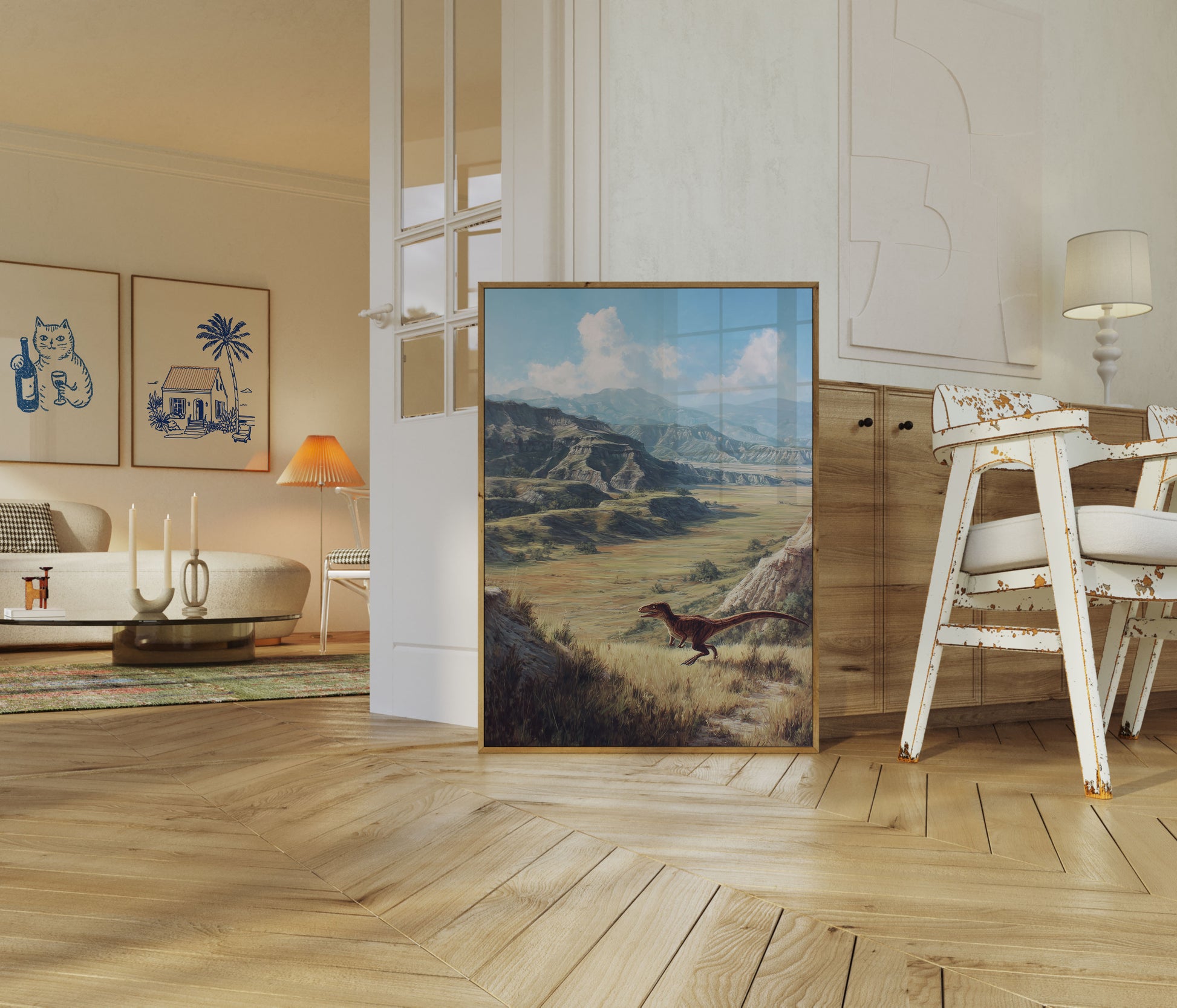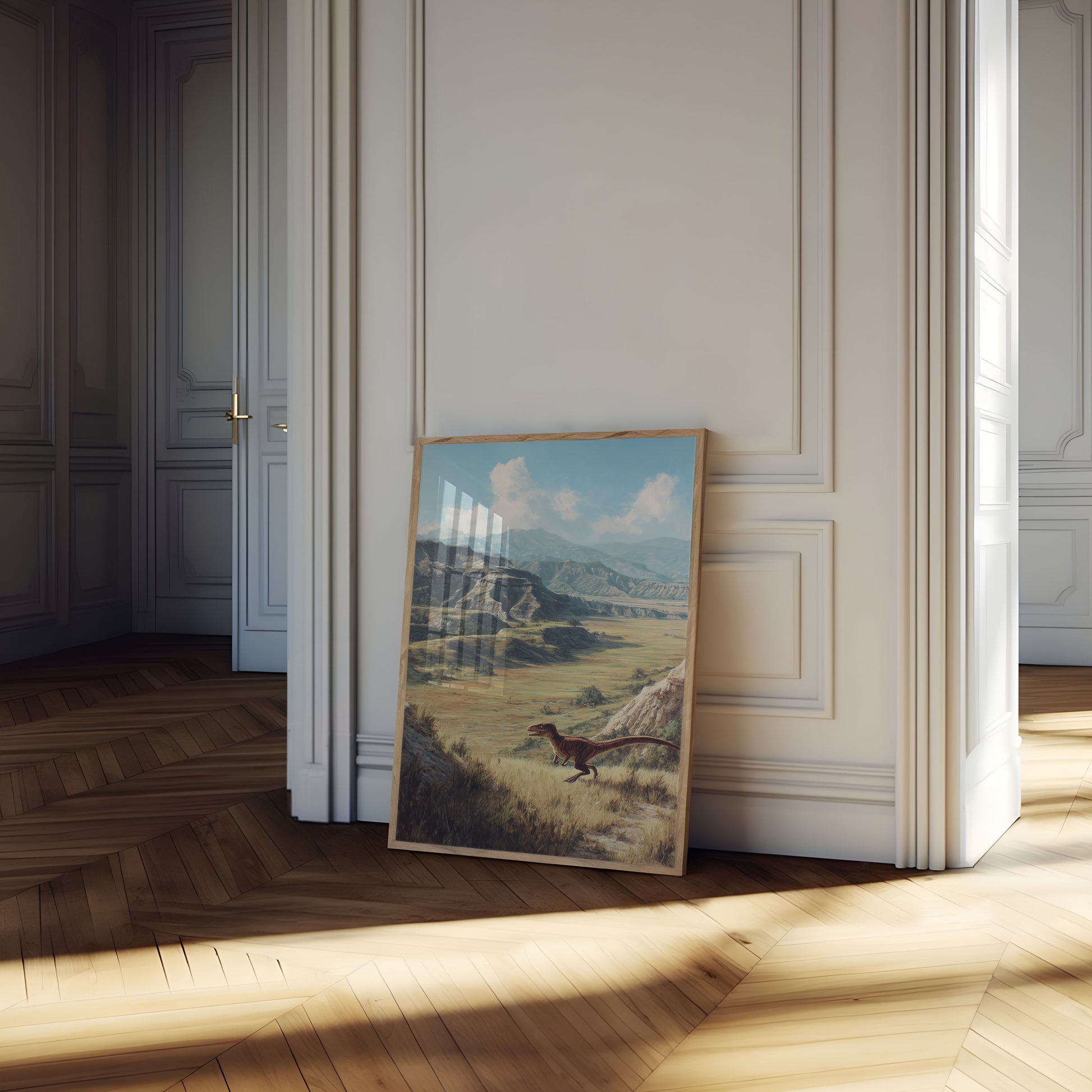 Viaja al pasado con este impresionante paisaje prehistórico que presenta un velociraptor realista que recorre una pradera dorada. Impresionantes montañas rocosas y ondulantes nubes blancas crean un impresionante telón de fondo que captura la belleza natural y la naturaleza salvaje de la era de los dinosaurios. Esta obra de arte, meticulosamente detallada, transporta al espectador a un mundo de millones de años atrás, invitando a la imaginación y la admiración.