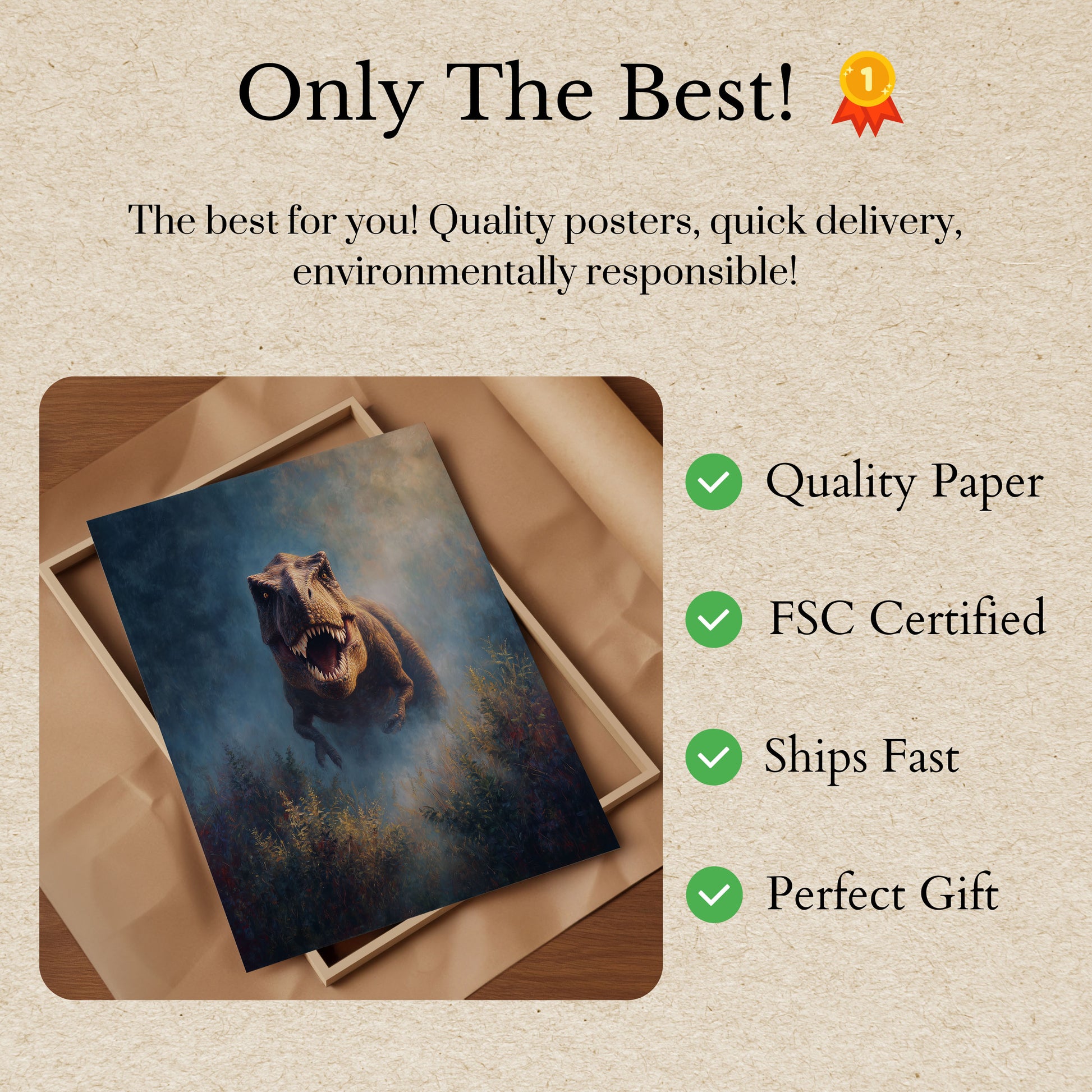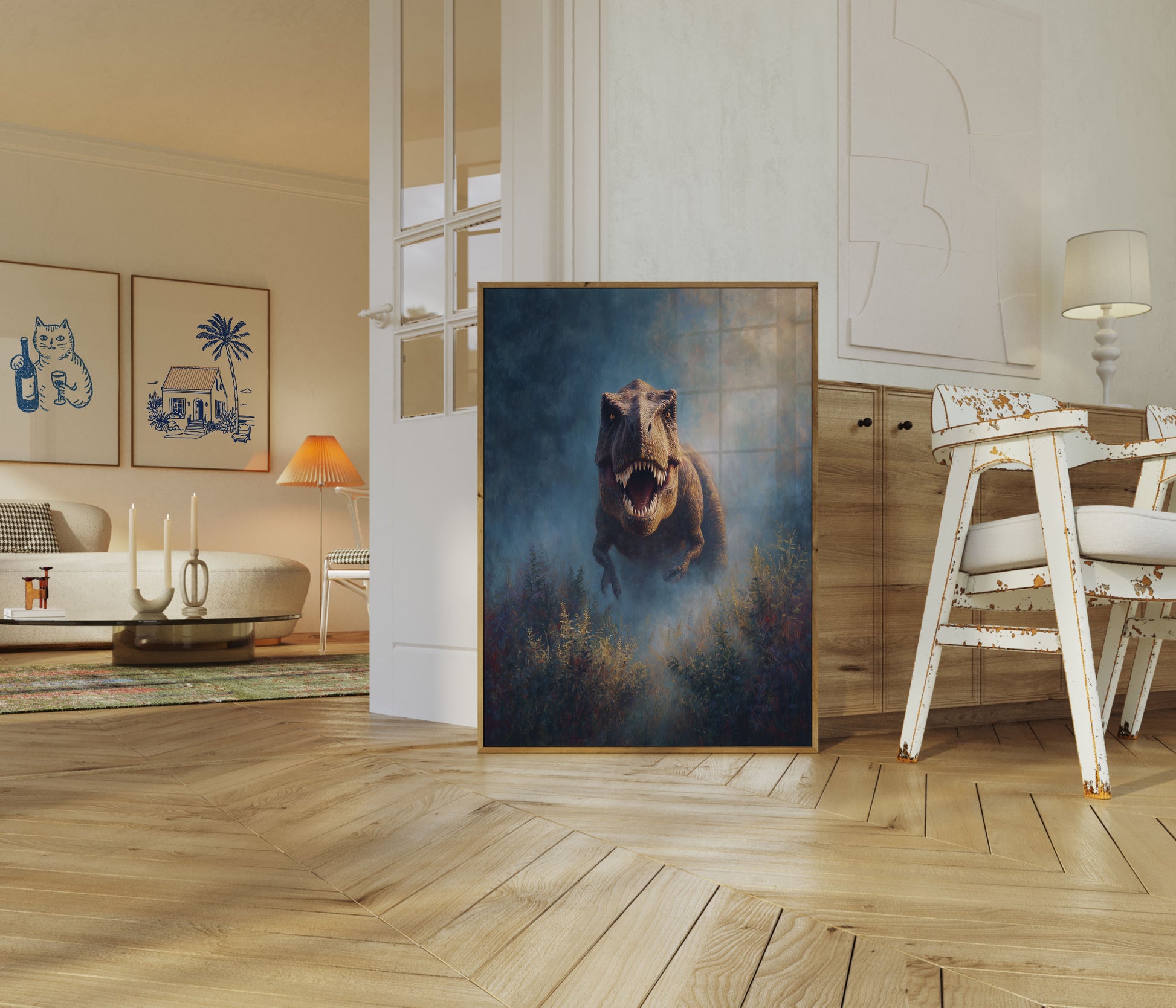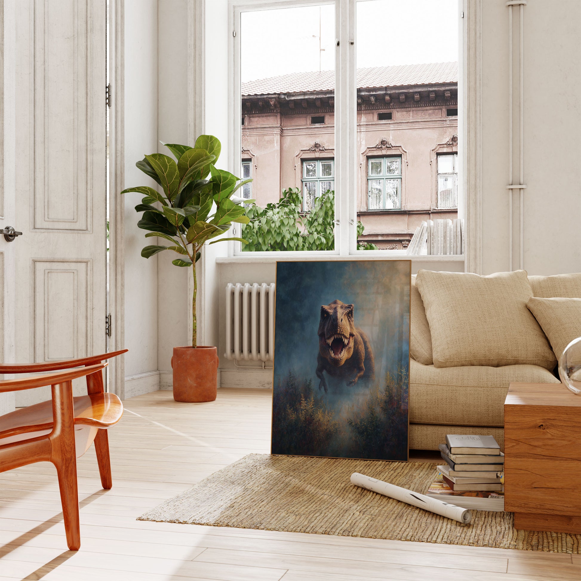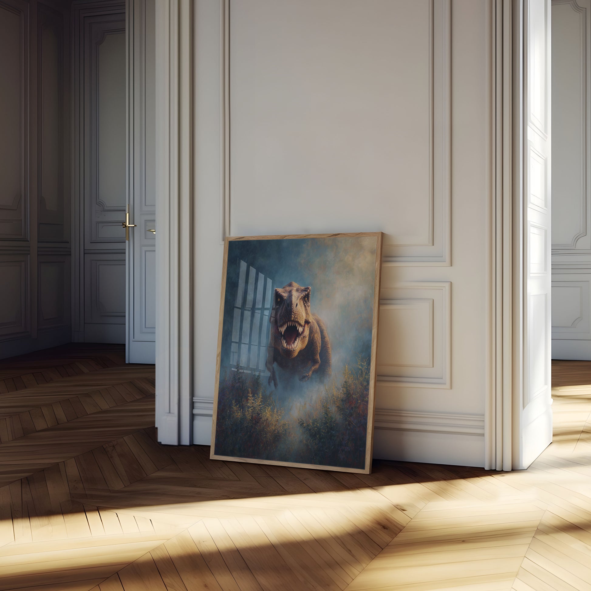 Sumérgete en la fuerza pura y primigenia de este impresionante retrato de T-Rex, donde el poder prehistórico se fusiona con la maestría evocadora. El enorme carnívoro emerge entre brumosos tonos azules y dorados, con sus afilados dientes y su intensa mirada creando una escena electrizante de drama prehistórico. Cada pincelada captura la musculosa figura del dinosaurio en un paisaje onírico de suave vegetación y luz etérea.