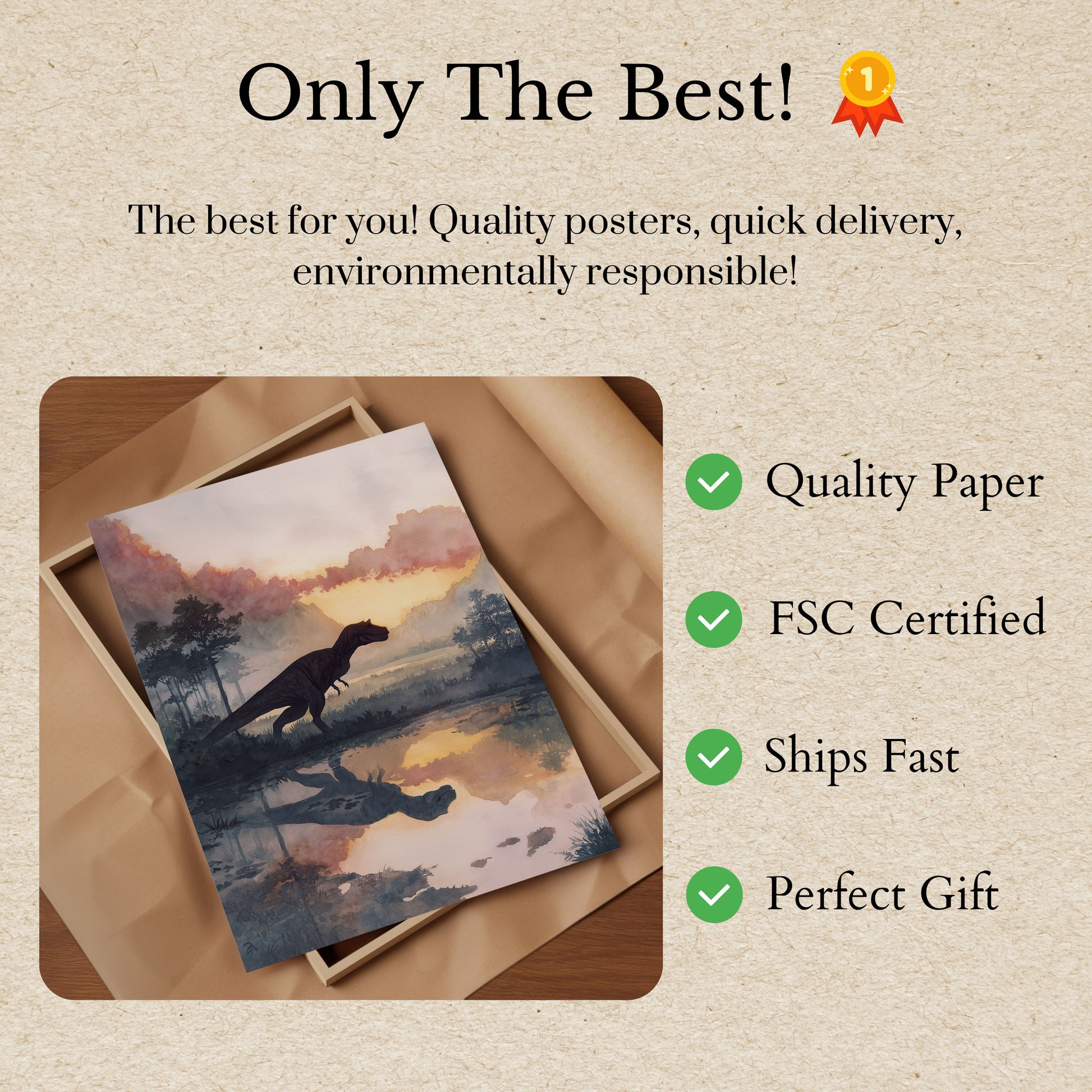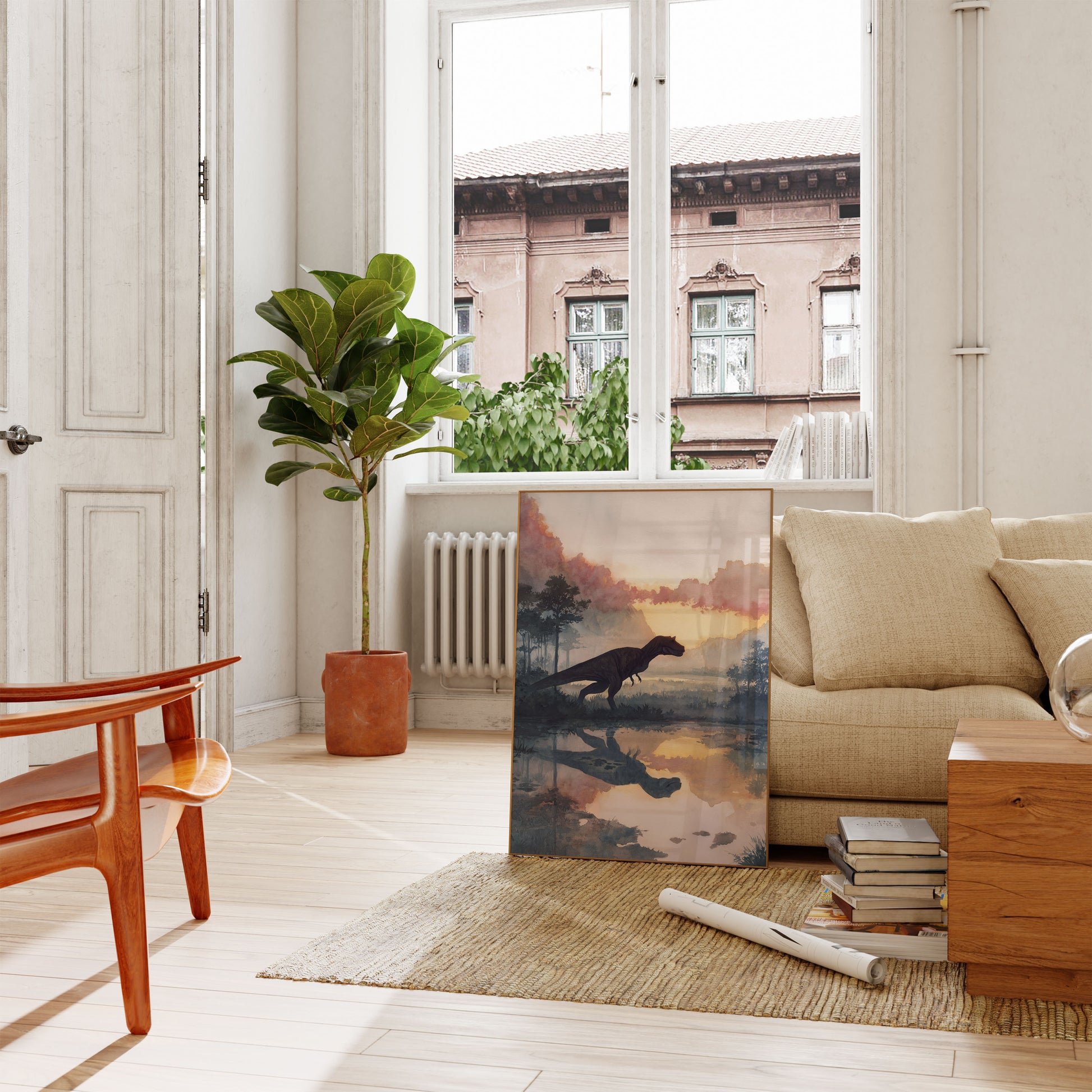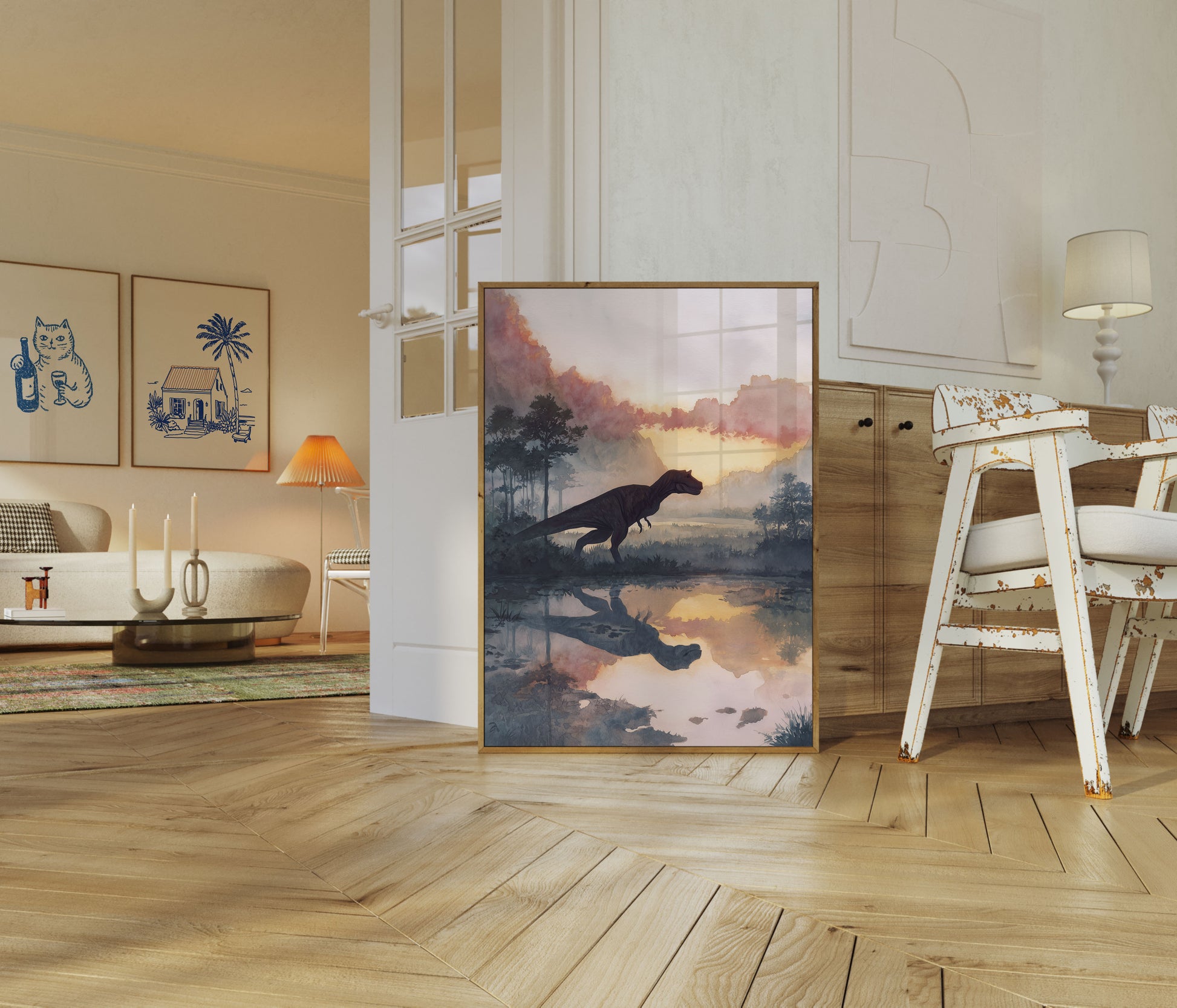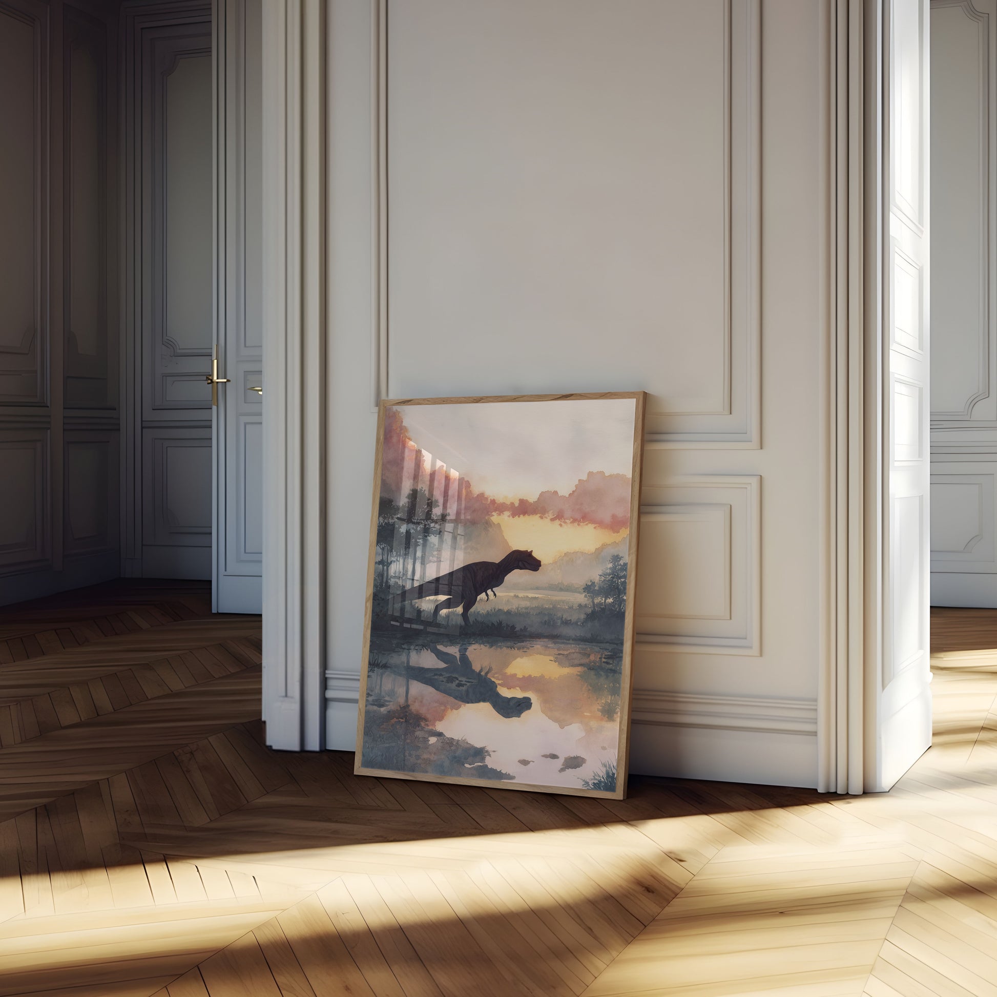 Viaja a la era de los dinosaurios con este impresionante paisaje de acuarela que presenta la silueta de un majestuoso tiranosaurio contra un atardecer de ensueño y tonos suaves. La pintura captura una tranquila escena prehistórica, con montañas brumosas, árboles sombríos y una superficie de agua reflectante que refleja a la perfección el cielo dramático y la poderosa forma del dinosaurio. Rica en naranjas cálidos, azules fríos y grises etéreos, esta obra evoca una sensación de asombro ancestral y belleza misteriosa.