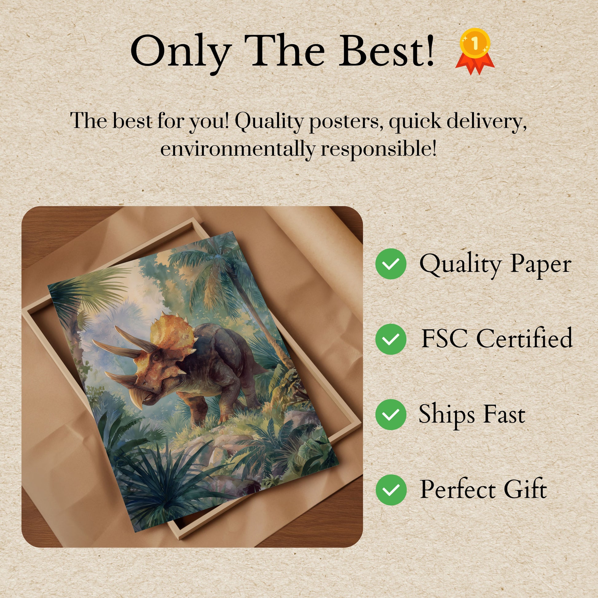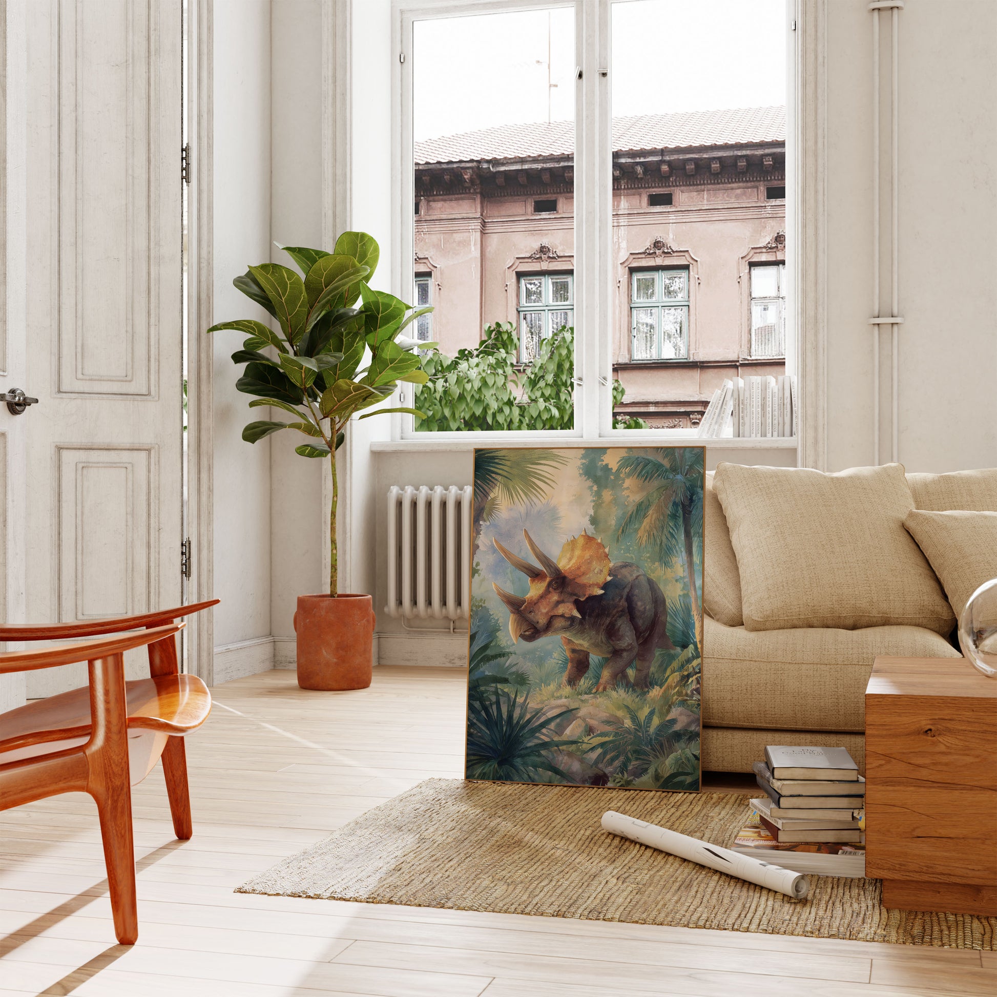 Adéntrate en un exuberante mundo prehistórico con esta impresionante ilustración en acuarela de un majestuoso triceratops. Rodeado de vibrantes palmeras y exótico follaje, el dinosaurio se yergue poderoso y alerta, con su volante dorado anaranjado y sus afilados cuernos creando un impactante contraste con el suave y onírico fondo. Esta cautivadora obra de arte da vida al mundo antiguo con increíble detalle y una atmósfera profunda, invitando al espectador a explorar el misterioso paisaje del pasado remoto de la Tierra.