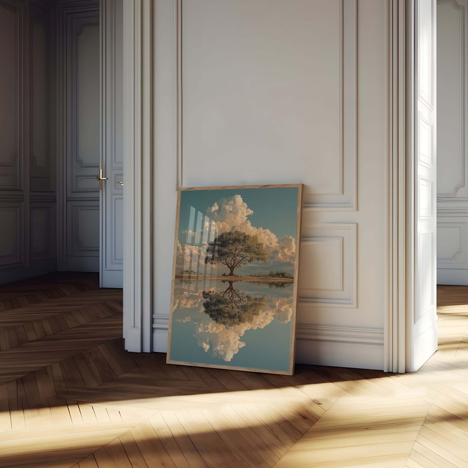 Sumérgete en un paisaje impresionante donde un árbol solitario se yergue como testimonio de quietud y simetría. Majestuosos cúmulos ondean tras el árbol, creando una impresionante imagen especular que refleja tanto el árbol como las nubes sobre la tranquila superficie del agua. Los tonos verde dorado y el suave fondo azul evocan una sensación de tranquila contemplación, invitando al espectador a sumergirse en esta fascinante escena de equilibrio natural y serenidad.
