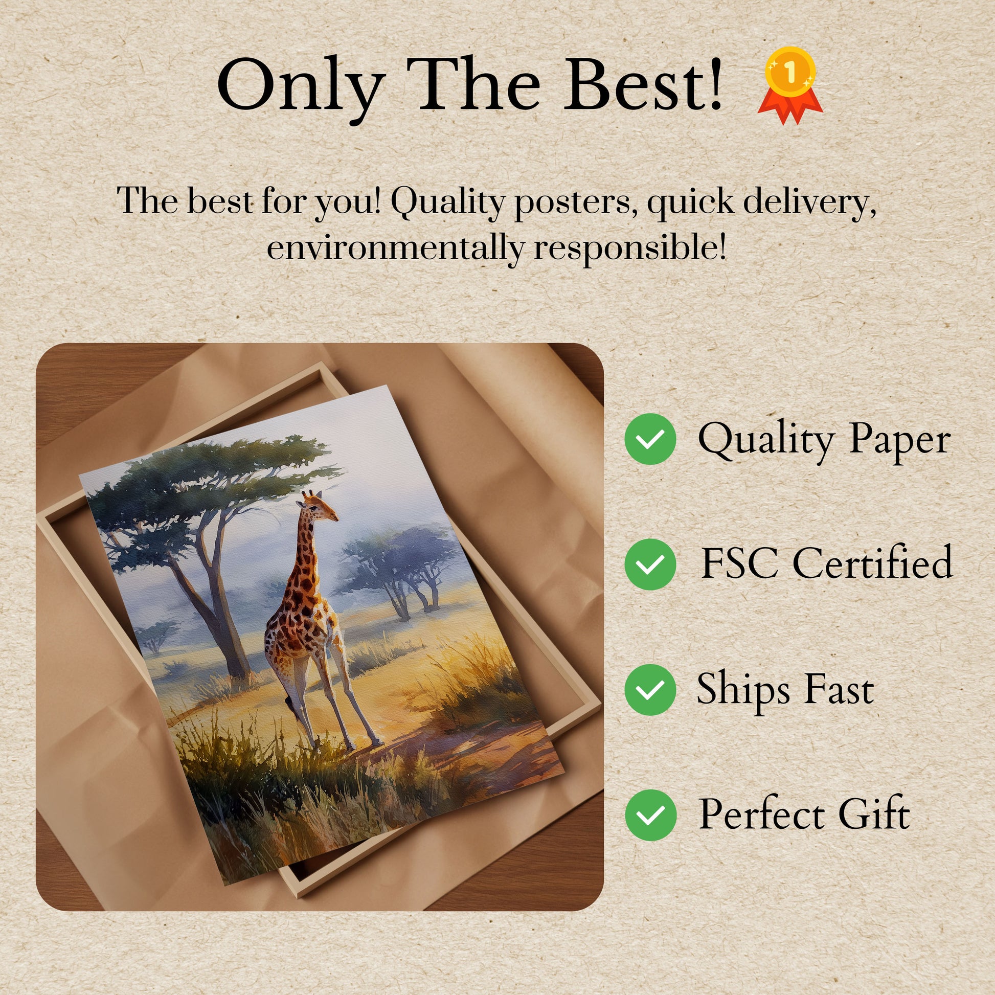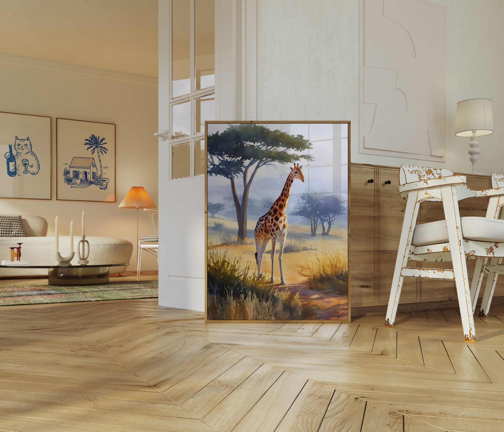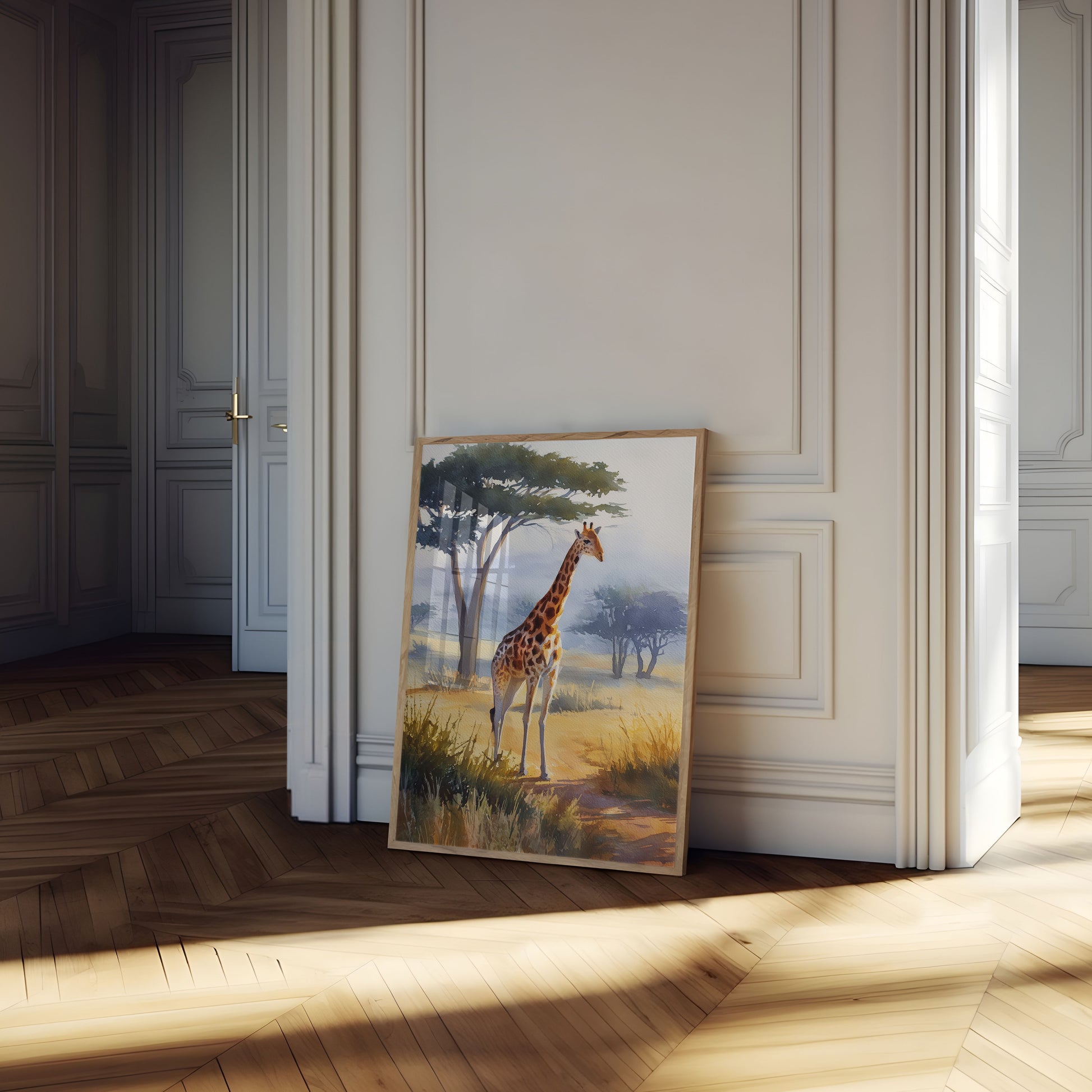 Sumérgete en la serena belleza de la sabana africana con esta impresionante acuarela de una jirafa solitaria. La delicada obra captura a la majestuosa criatura, erguida con gracia bajo una acacia, rodeada de praderas doradas y horizontes azules y brumosos. Los tonos suaves y cálidos y las delicadas pinceladas crean una atmósfera de ensueño que te transporta al corazón de la naturaleza.