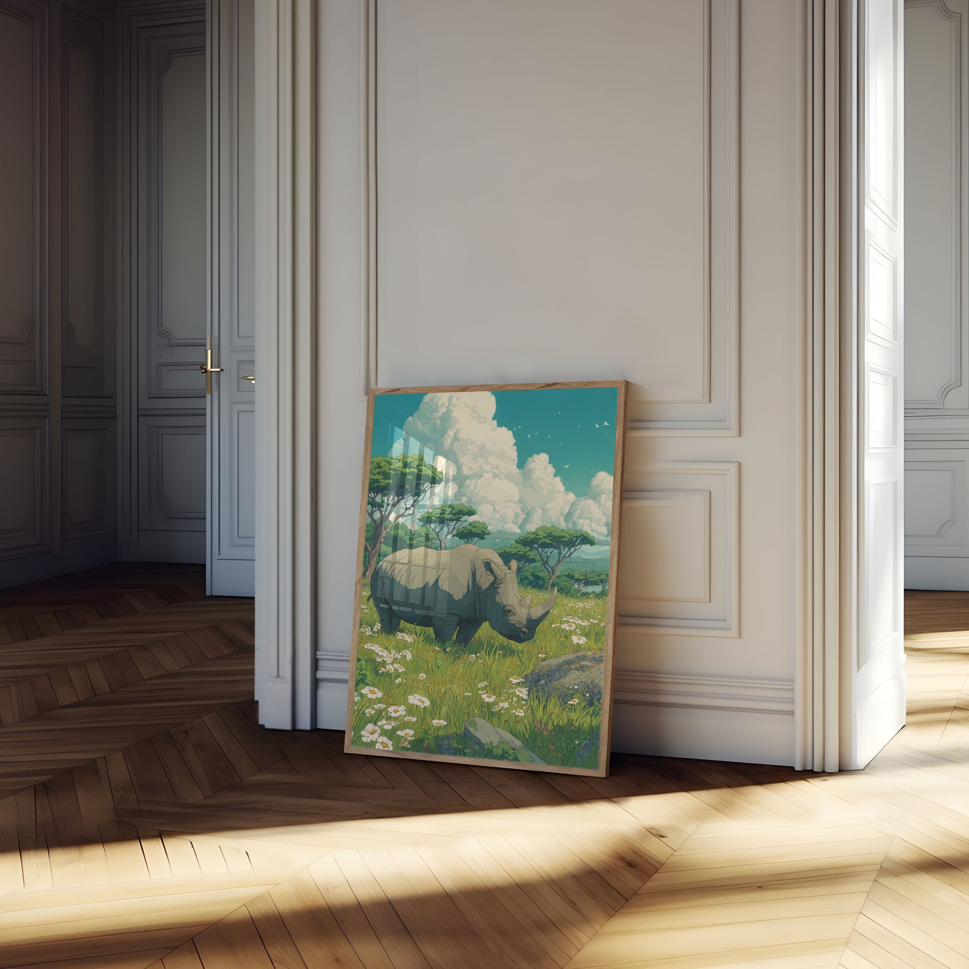 Adéntrese en un impresionante paisaje africano donde un majestuoso rinoceronte descansa plácidamente entre un mar de margaritas blancas y acacias. Los imponentes cúmulos ondean contra un cielo turquesa suave, creando una escena de pura tranquilidad y maravilla natural. Esta impresionante ilustración captura el espíritu apacible del rinoceronte en su vibrante y exuberante hábitat, invitando al espectador a detenerse y maravillarse con la belleza de la vida silvestre en su momento más sereno.