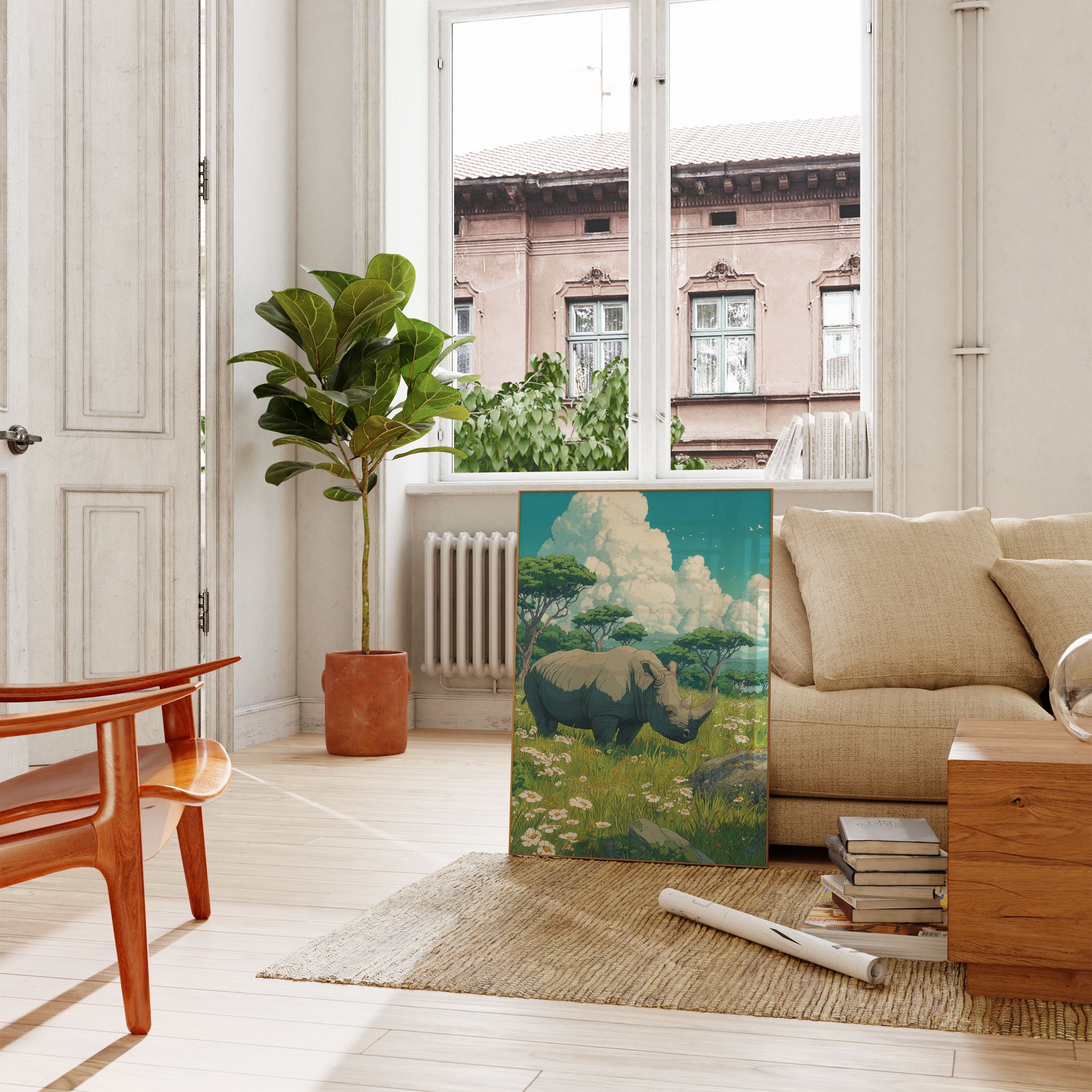 Póster de la tranquila pradera de rinocerontes