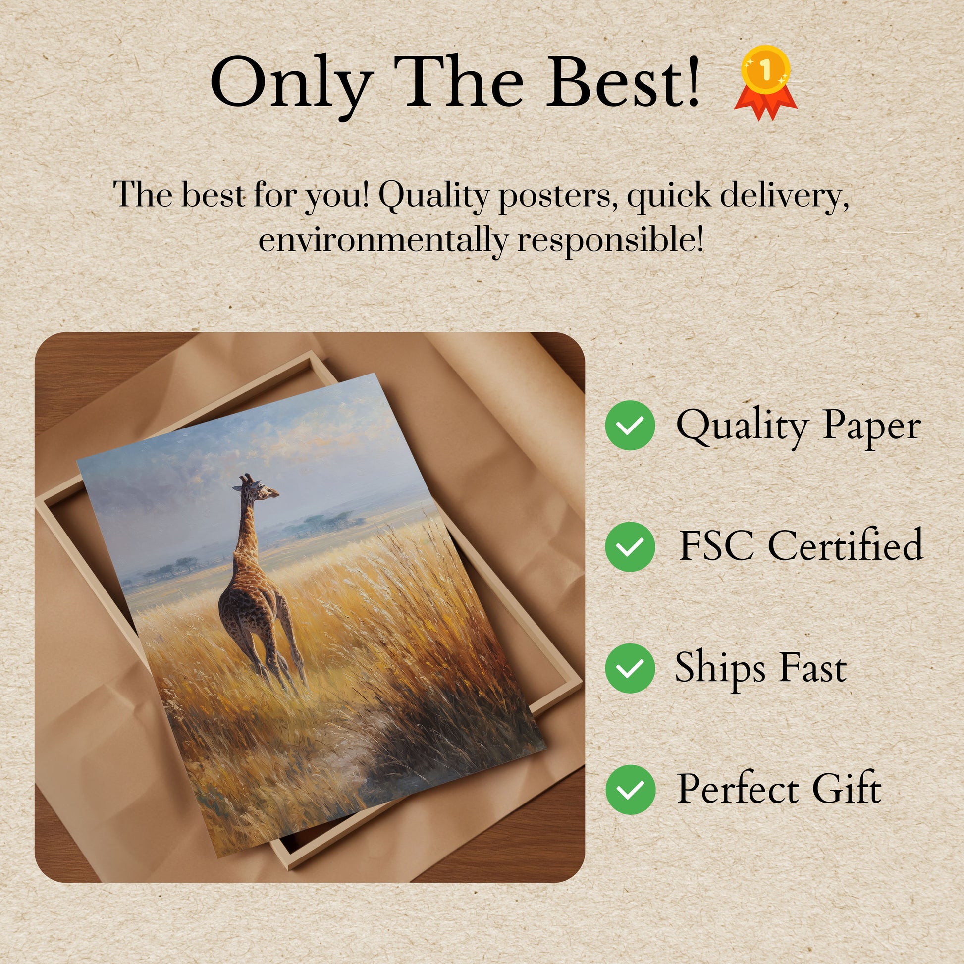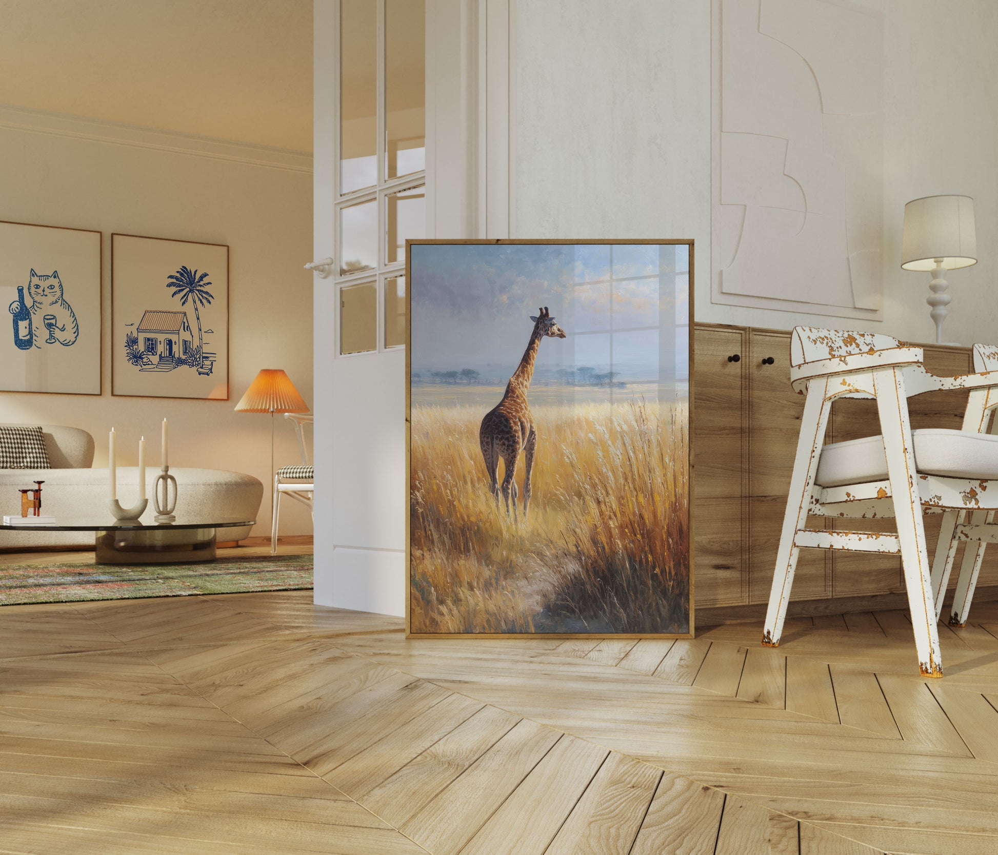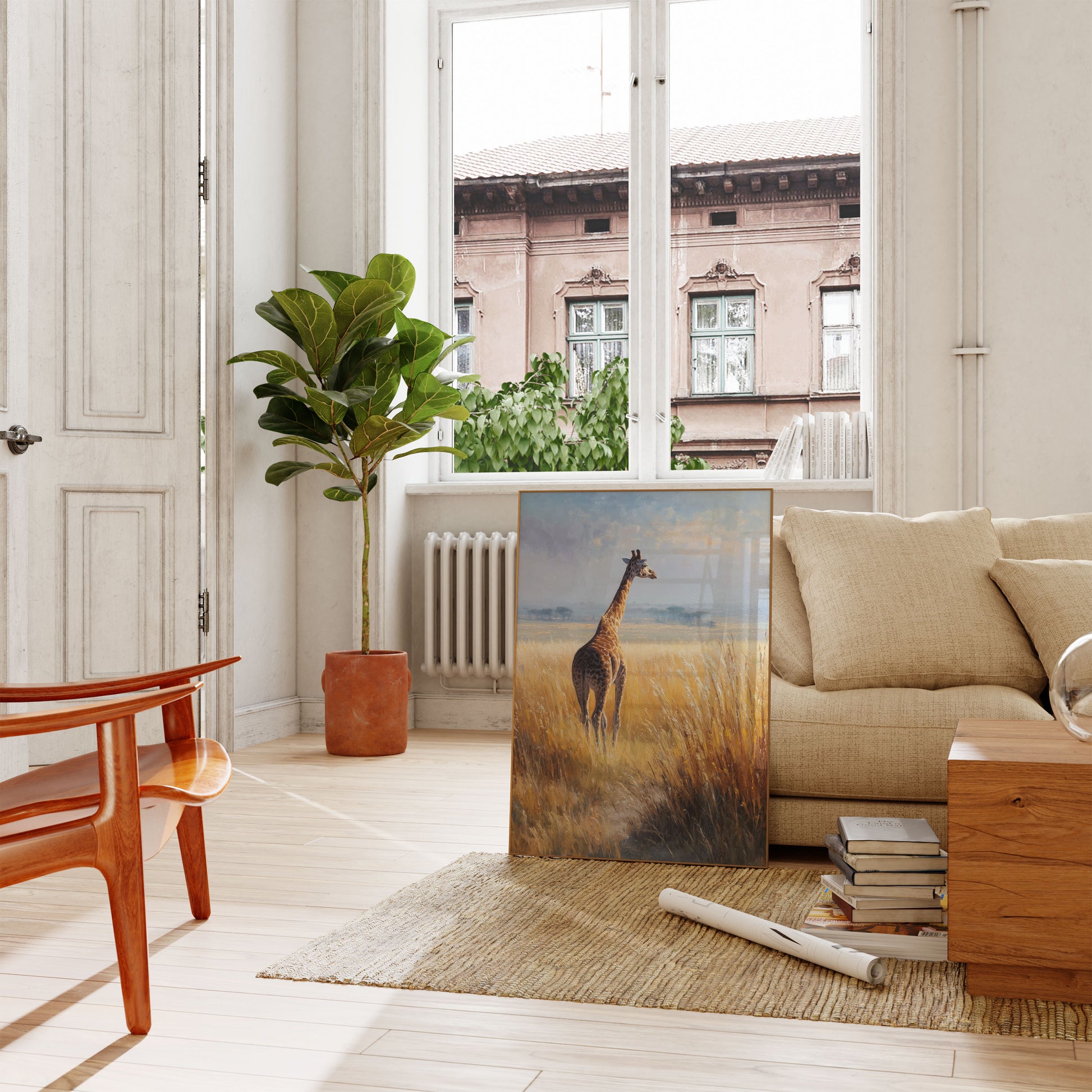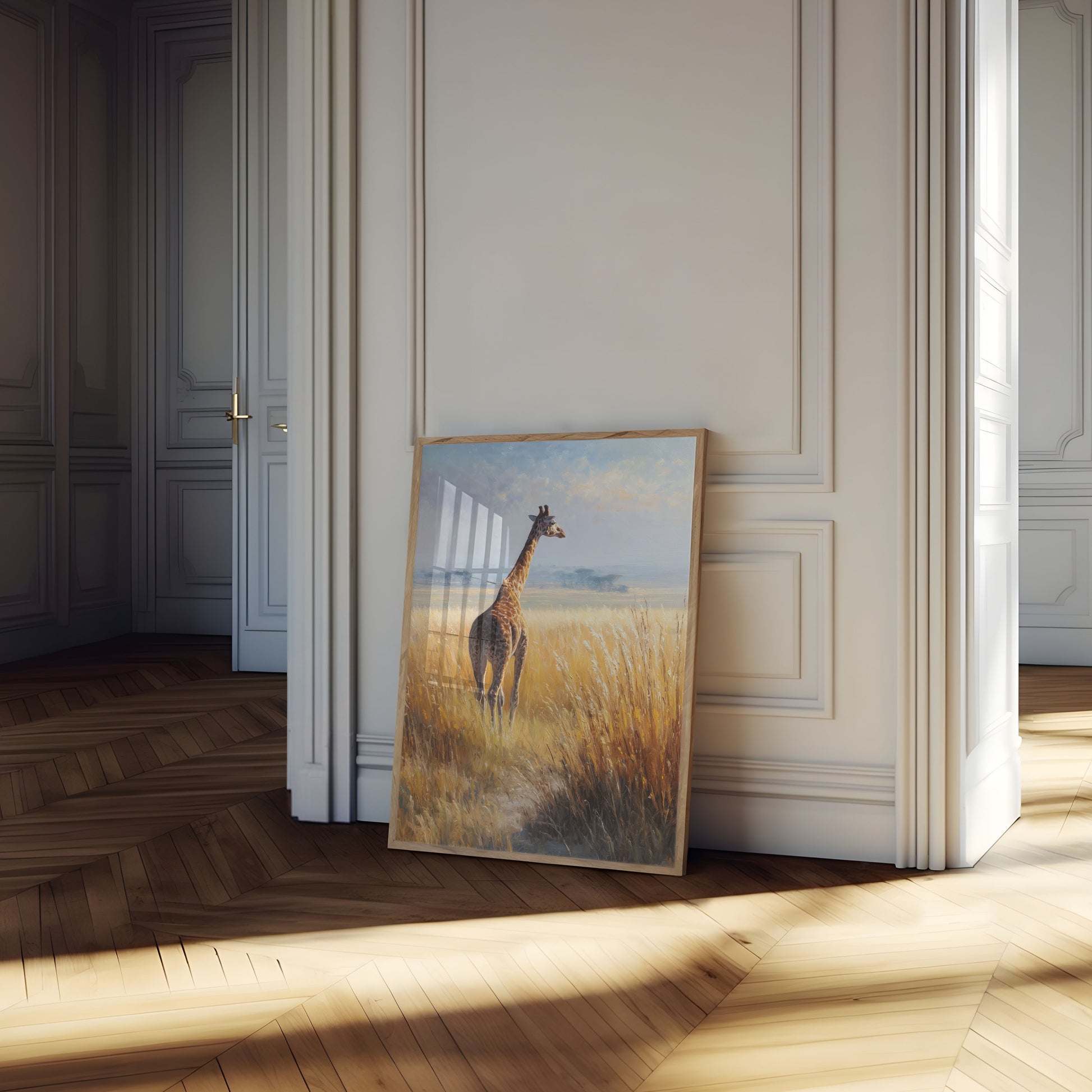 Un lienzo impresionante de praderas doradas y horizontes brumosos, este póster captura una majestuosa jirafa que se yergue imponente en medio de las extensas llanuras africanas. Los suaves y cálidos tonos ámbar y ocre se funden a la perfección con el sereno cielo azul, creando un paisaje cautivador que invita al espectador a adentrarse en la naturaleza. Las pinceladas detalladas y la luz etérea evocan una sensación de serena dignidad y la belleza atemporal de la naturaleza.