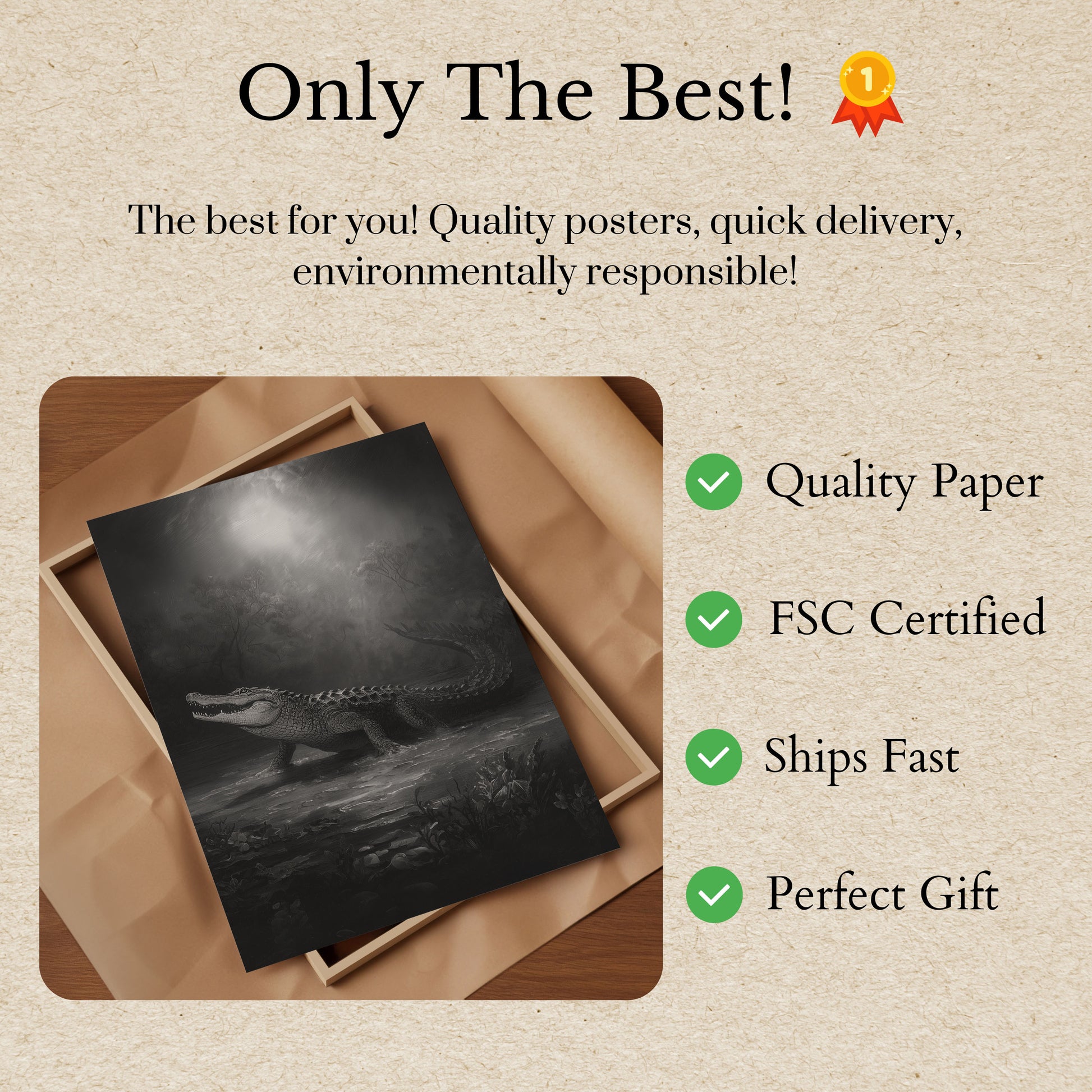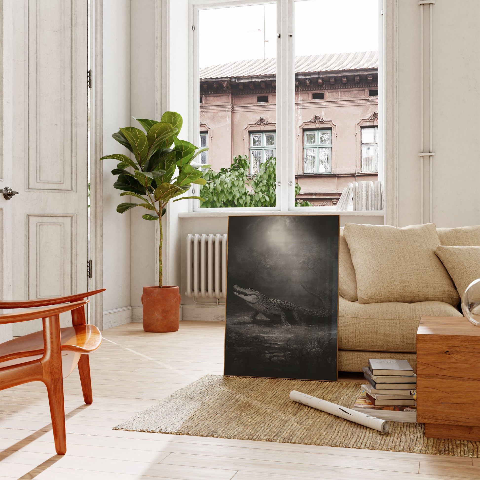 Sumérgete en el mundo primigenio de un cocodrilo ancestral, recortado contra un paisaje brumoso y etéreo. Esta dramática obra de arte en escala de grises captura la fuerza bruta y la esencia prehistórica de un enorme reptil. Su cuerpo escamoso resplandece con una amenaza prehistórica en medio de un fondo evocador y sombrío de árboles sombríos y luz difusa. Cada detalle intrincado de la piel texturizada y la poderosa forma del cocodrilo evoca la fuerza imperecedera de los cazadores más resistentes de la naturaleza.