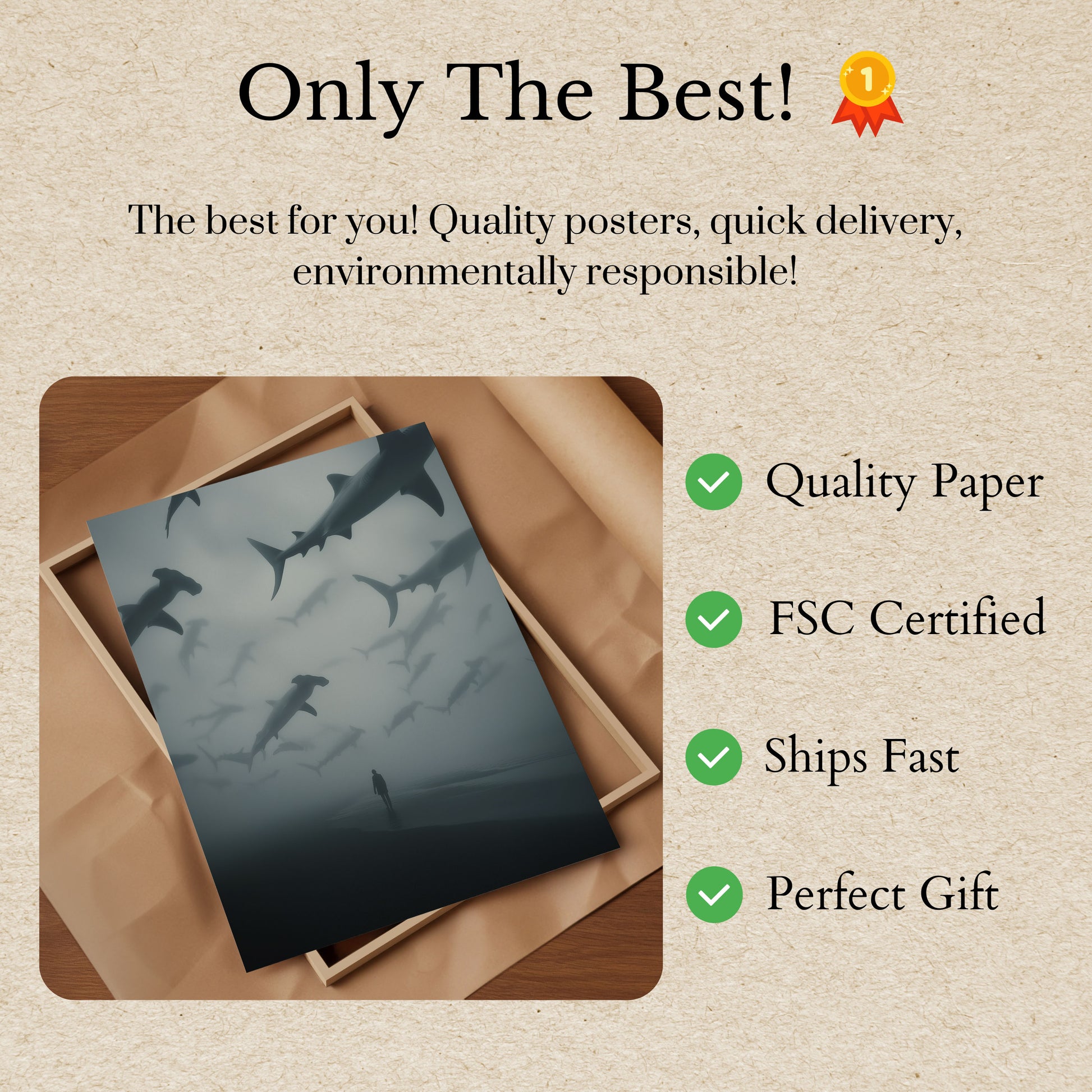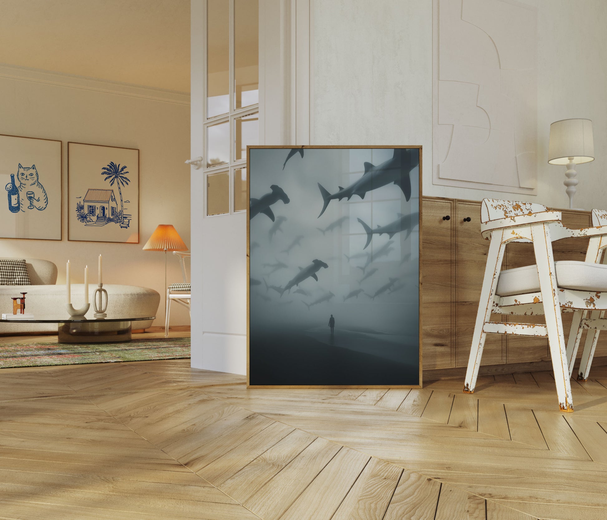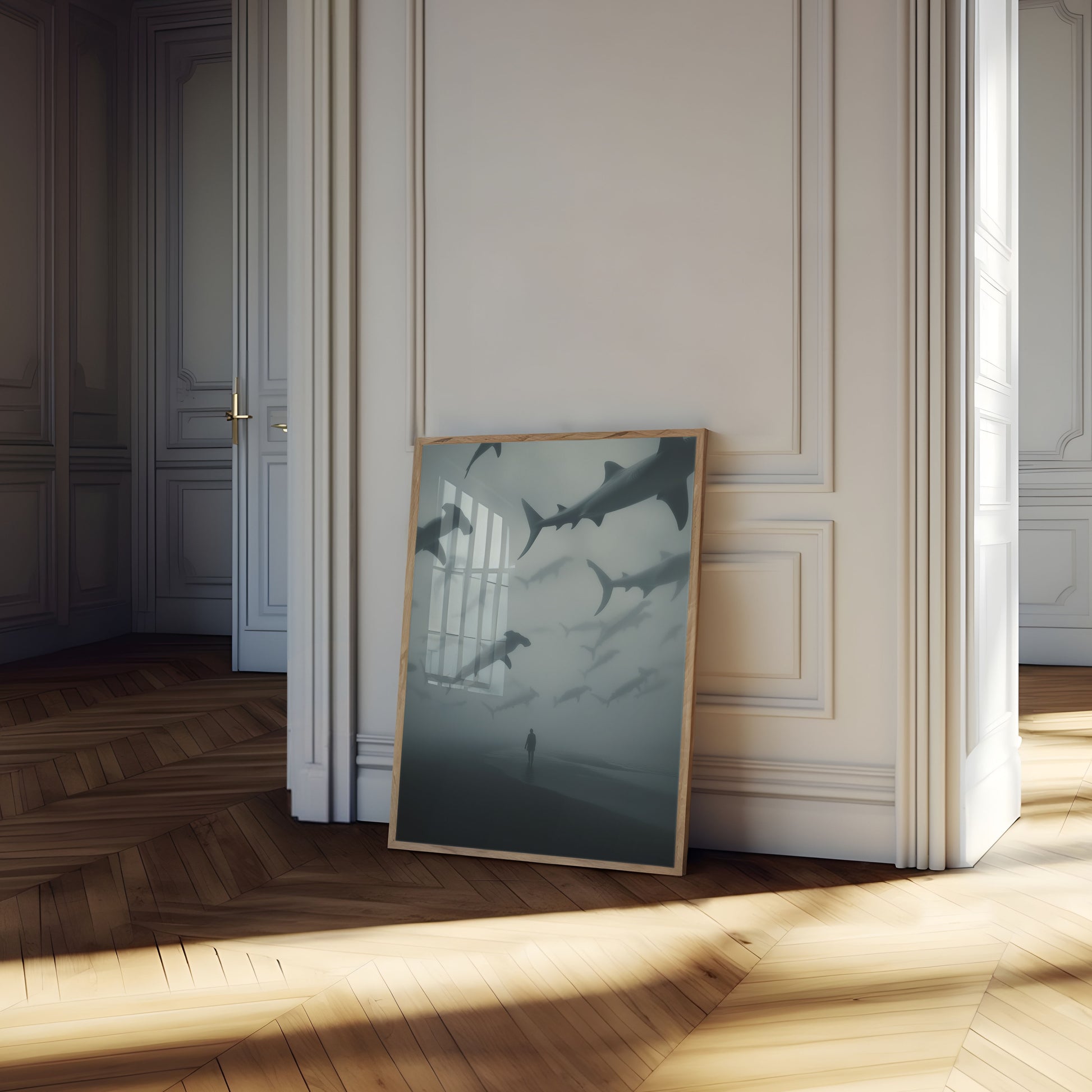 Una escena submarina inquietante y surrealista muestra numerosas siluetas de tiburones que se arremolinan amenazantes sobre una figura solitaria en un paisaje monocromático y brumoso. La imagen captura una sensación de aislamiento, vulnerabilidad y peligro etéreo, con los tiburones flotando como depredadores espectrales en un entorno gris onírico. El marcado contraste entre la pequeña figura humana y los depredadores marinos circundantes crea una narrativa poderosa y atmosférica de la pequeñez humana frente al poder de la naturaleza.