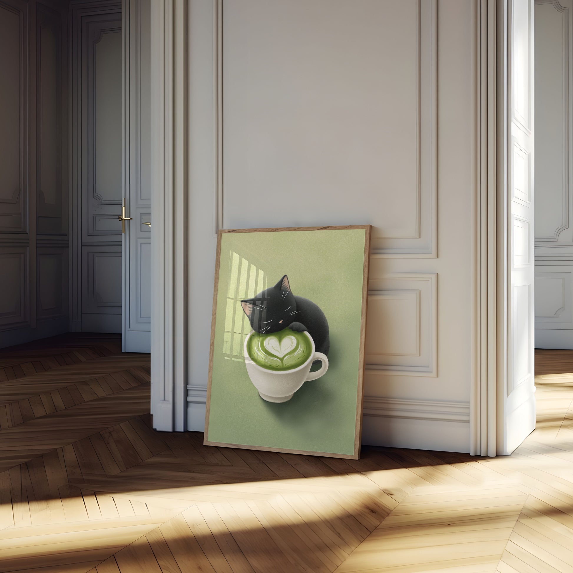 Sumérgete en el adorable mundo de esta encantadora ilustración que presenta a un gato negro dormilón acurrucado junto a un matcha latte en forma de corazón. El suave fondo verde y el delicado estilo artístico crean una atmósfera relajante y acogedora que captura la alegría pura de un momento de paz. Esta encantadora obra de arte combina la ternura de un gato mimoso con el atractivo moderno de una bebida de matcha perfectamente elaborada.