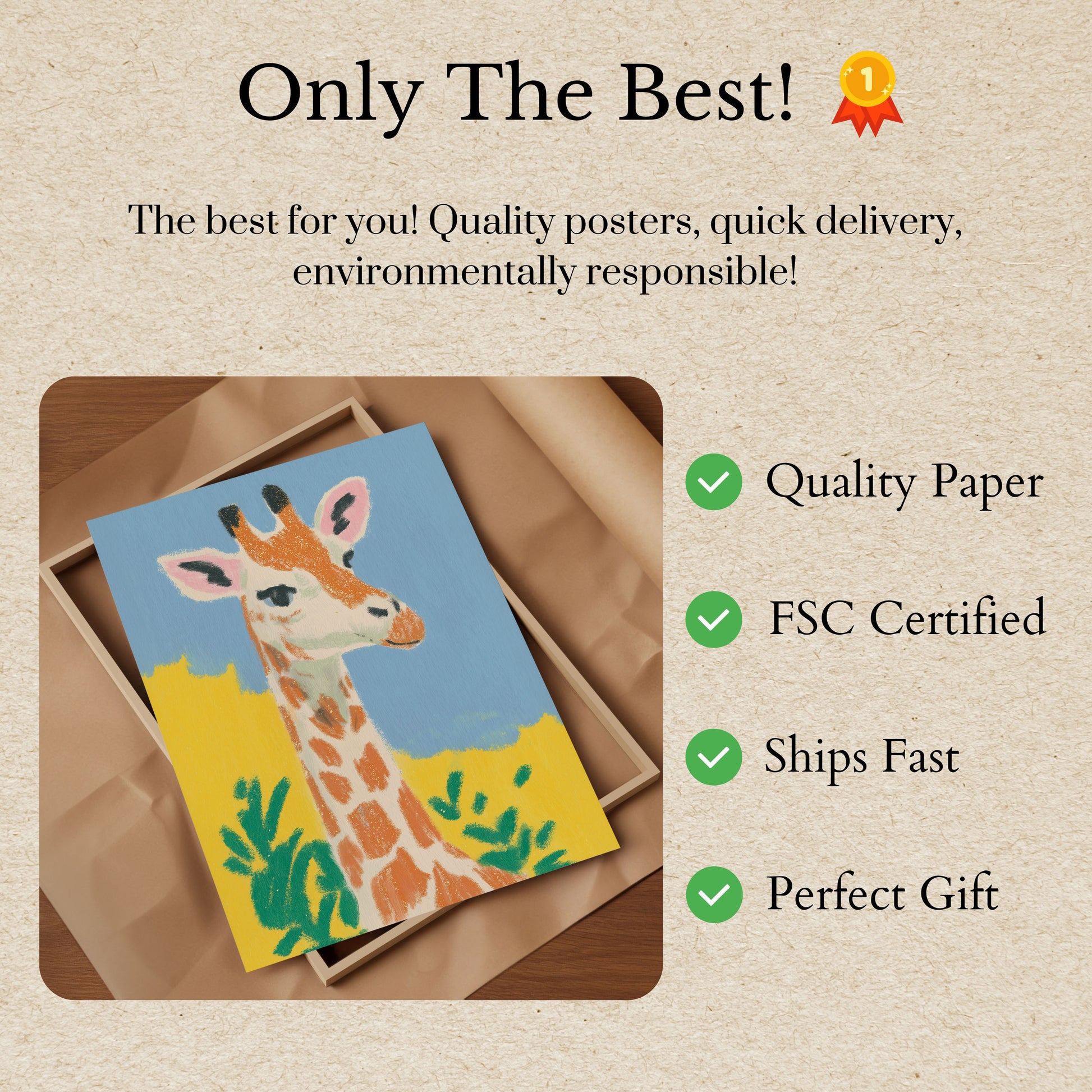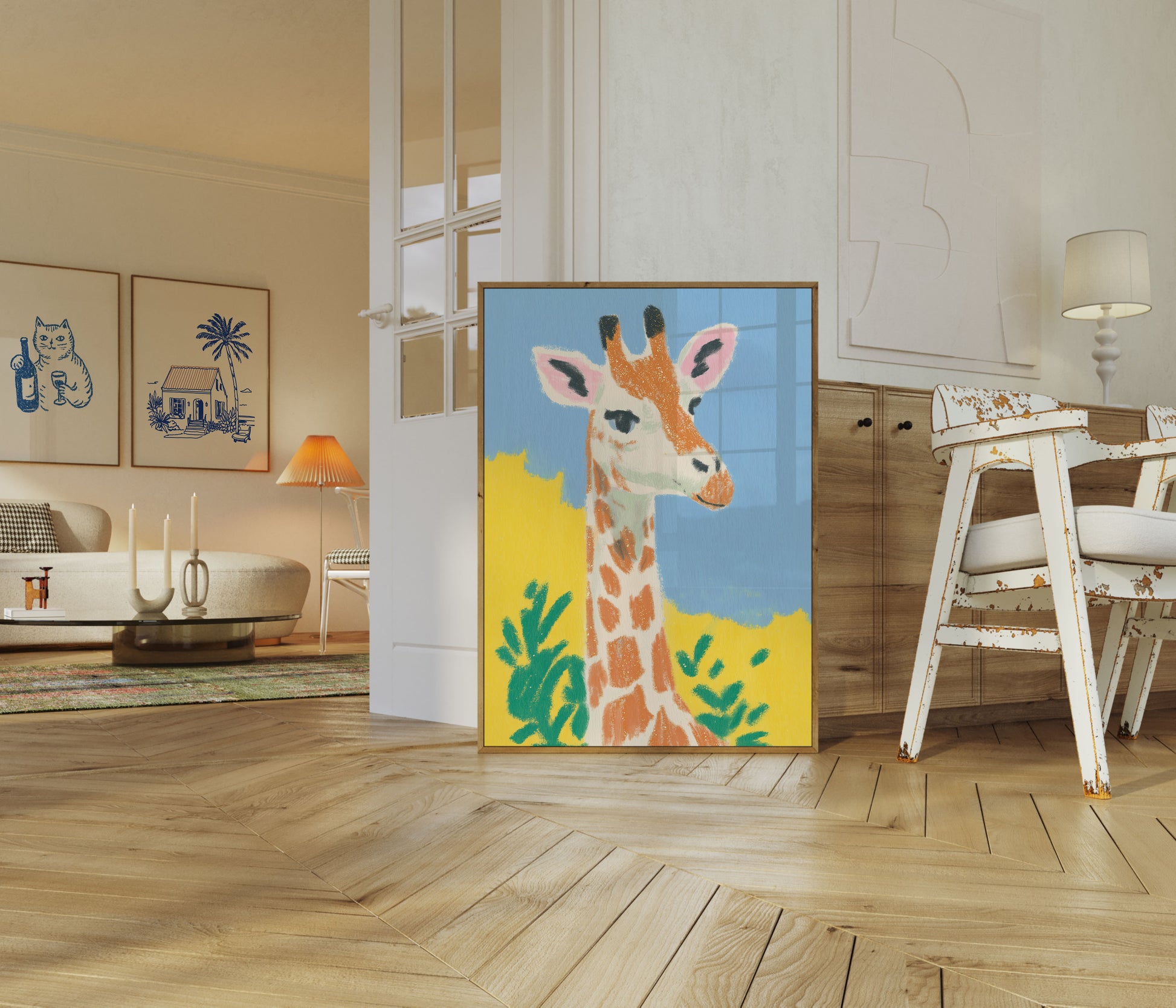 Descubre el encanto de esta encantadora ilustración de una jirafa, con un personaje juguetón sobre un vibrante fondo amarillo y azul. Las suaves texturas pastel aportan calidez y personalidad a este adorable retrato animal, con un exuberante follaje verde que enmarca la encantadora expresión de la gentil criatura. La alegre paleta de colores y el estilo caprichoso hacen de este póster el complemento perfecto para cualquier habitación que busque un toque de alegría y naturaleza.