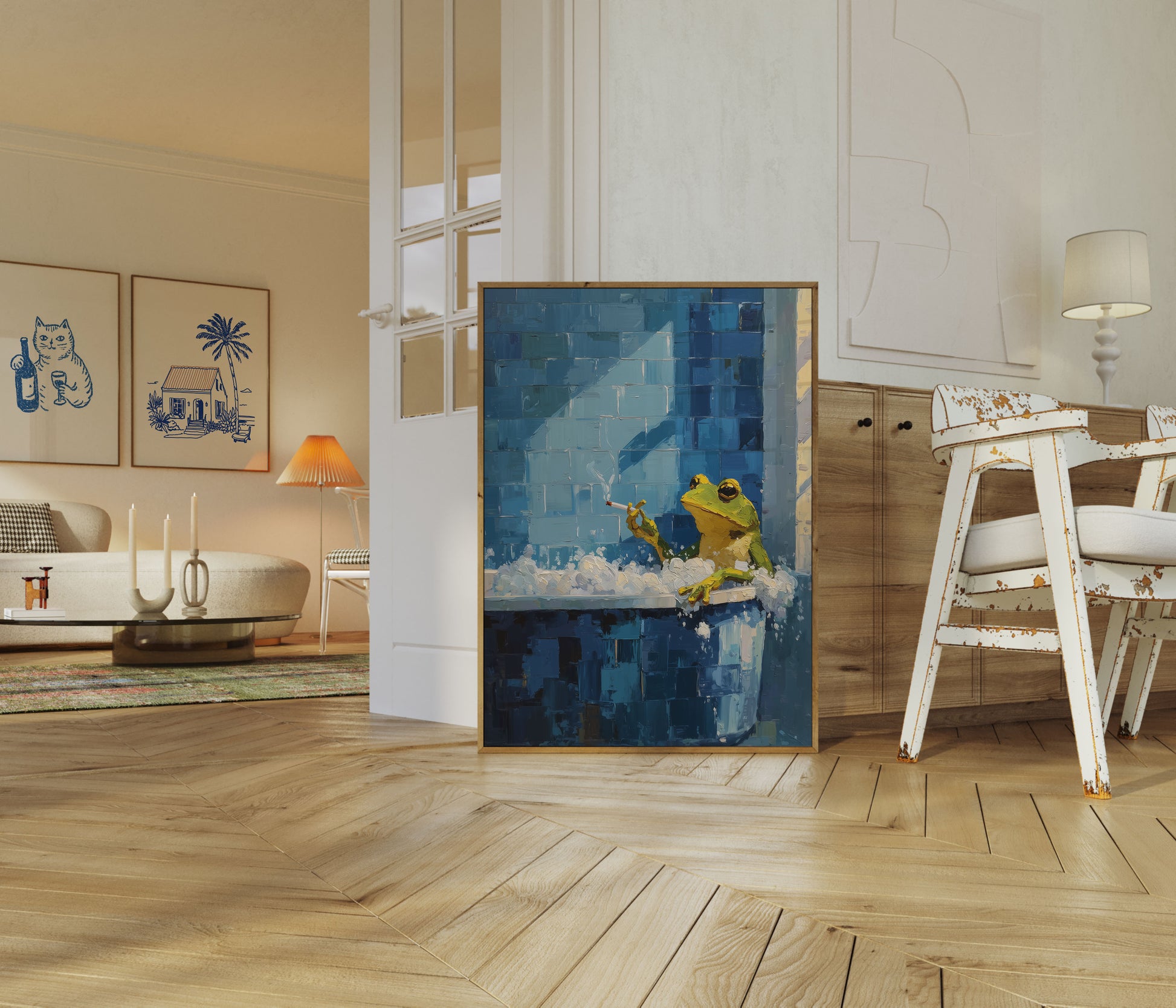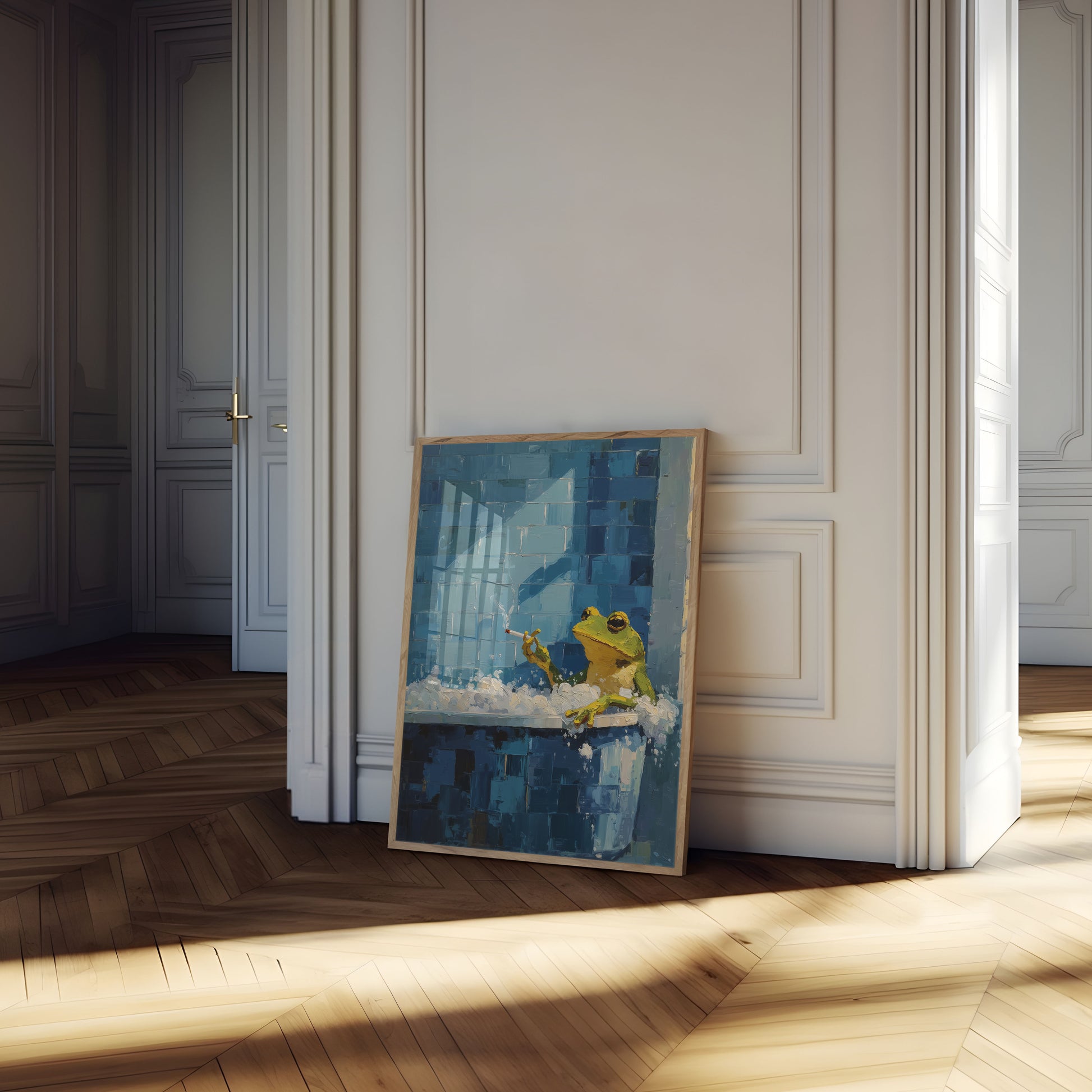 Un cuadro de óleo surrealista captura a una rana verde fumando un cigarrillo, posada sobre una superficie blanca brumosa contra una pared de ladrillos azul profundo. La obra combina humor y melancolía con sus pinceladas ricas y texturizadas y su materia temática inesperada.