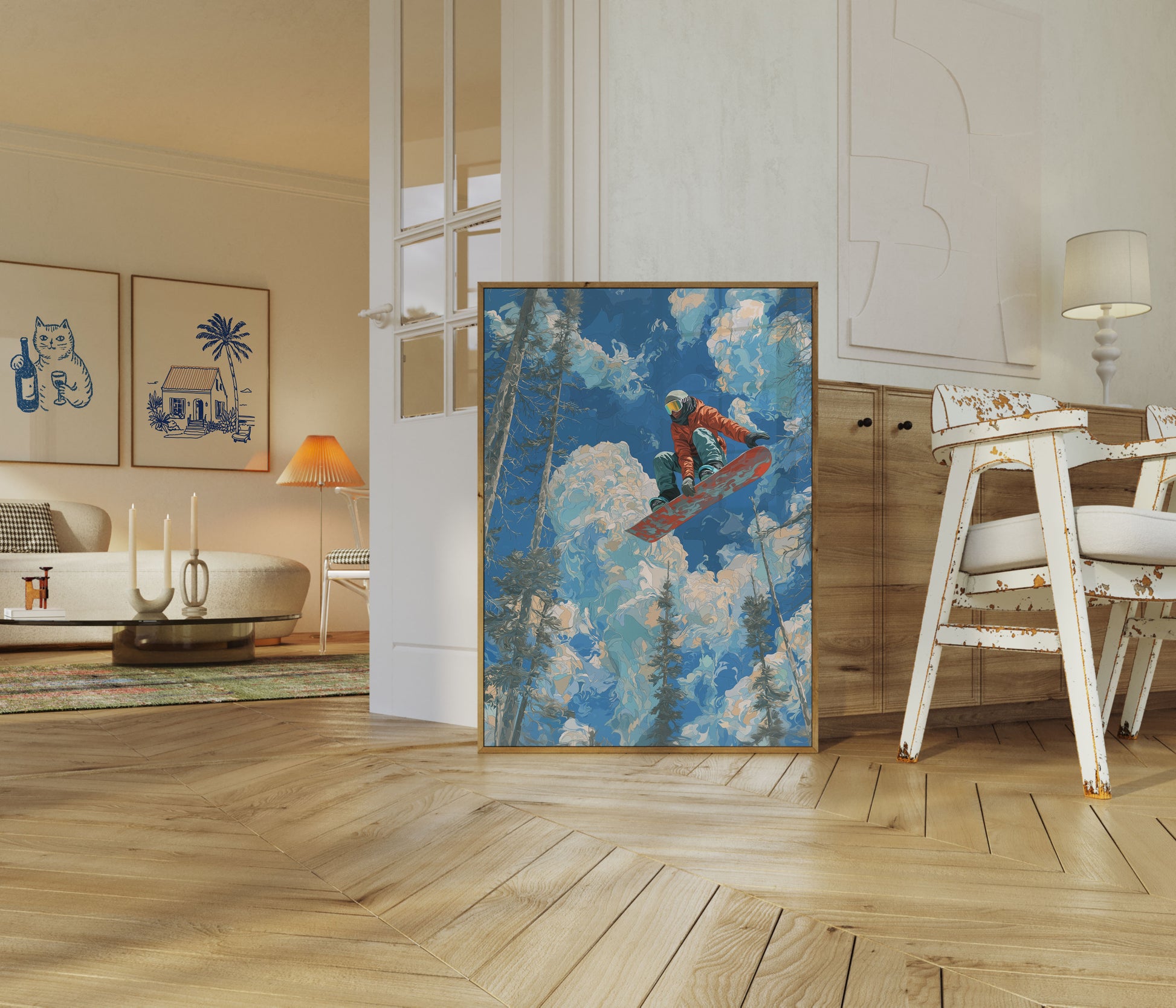 Vuela a través de un paisaje invernal de ensueño donde vibrantes tonos naranja y verde azulado se combinan con remolinos de nubes azules. Esta impresionante obra de snowboard captura la euforia de la suspensión en el aire, rodeada de estilizados árboles perennes y un cautivador telón de fondo atmosférico. La dinámica composición celebra la libertad y la gracia de los deportes de invierno, invitando al espectador a sentir la adrenalina de la aventura alpina.