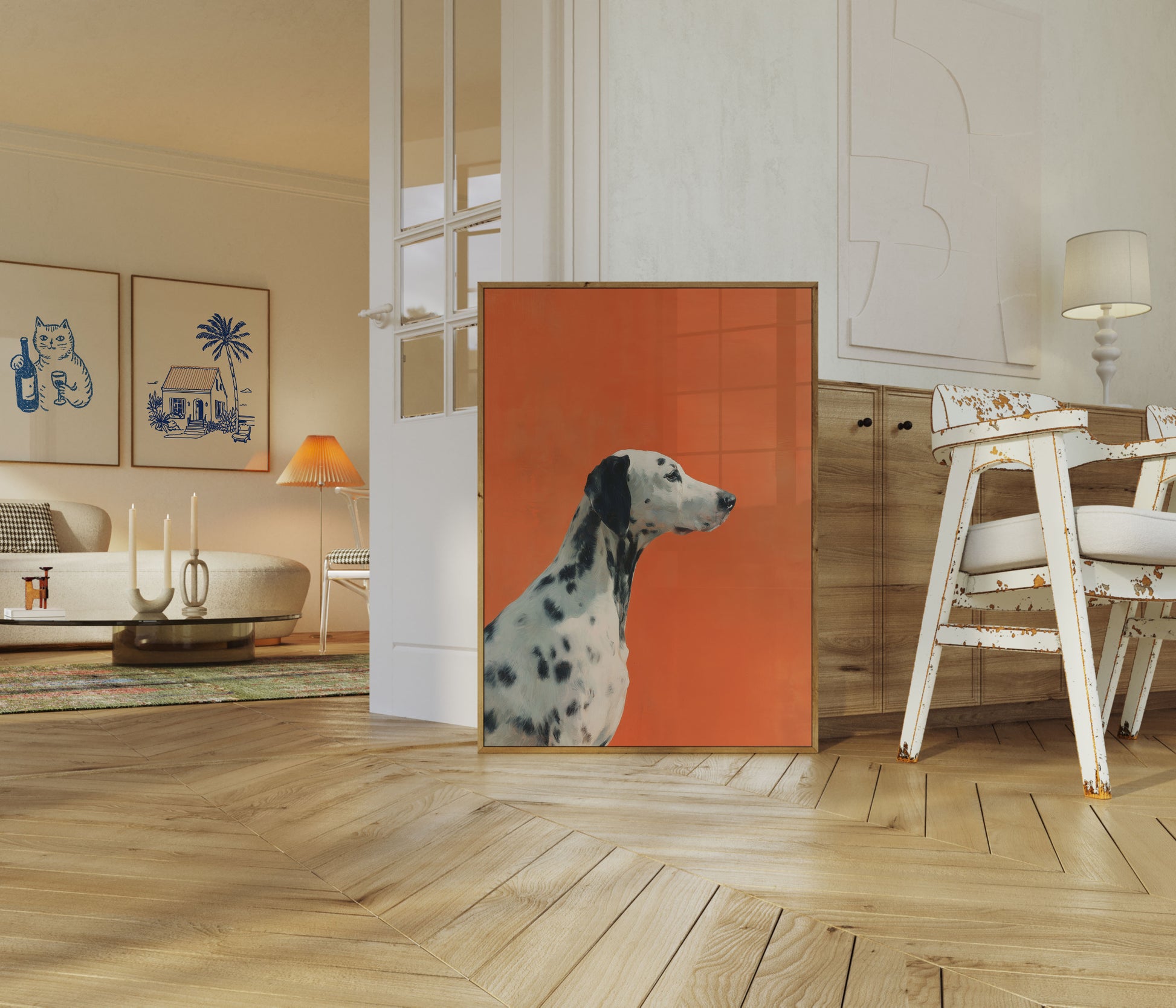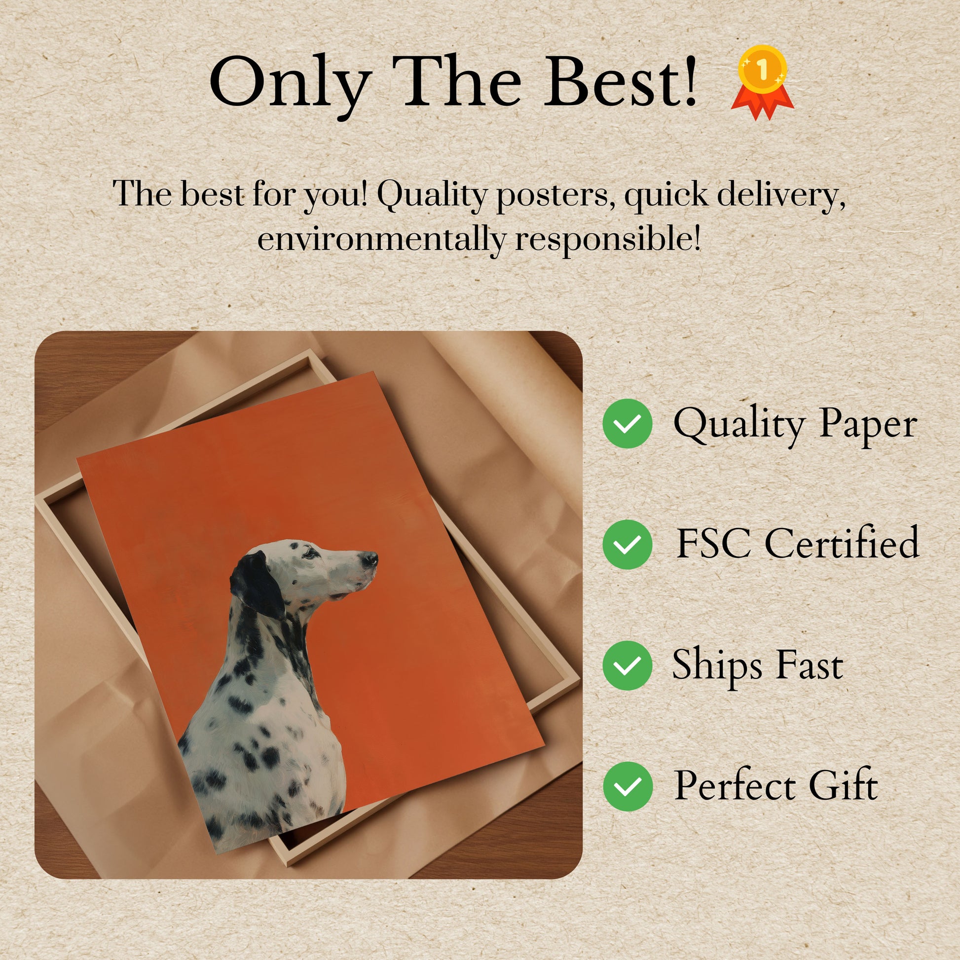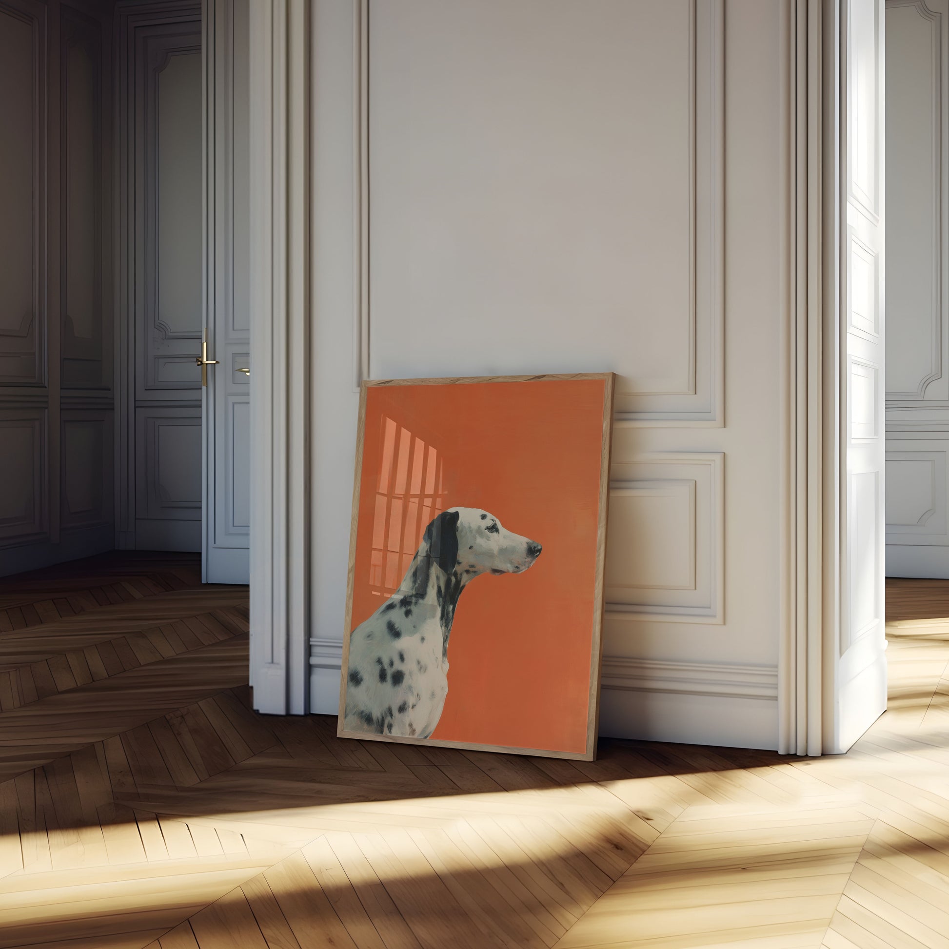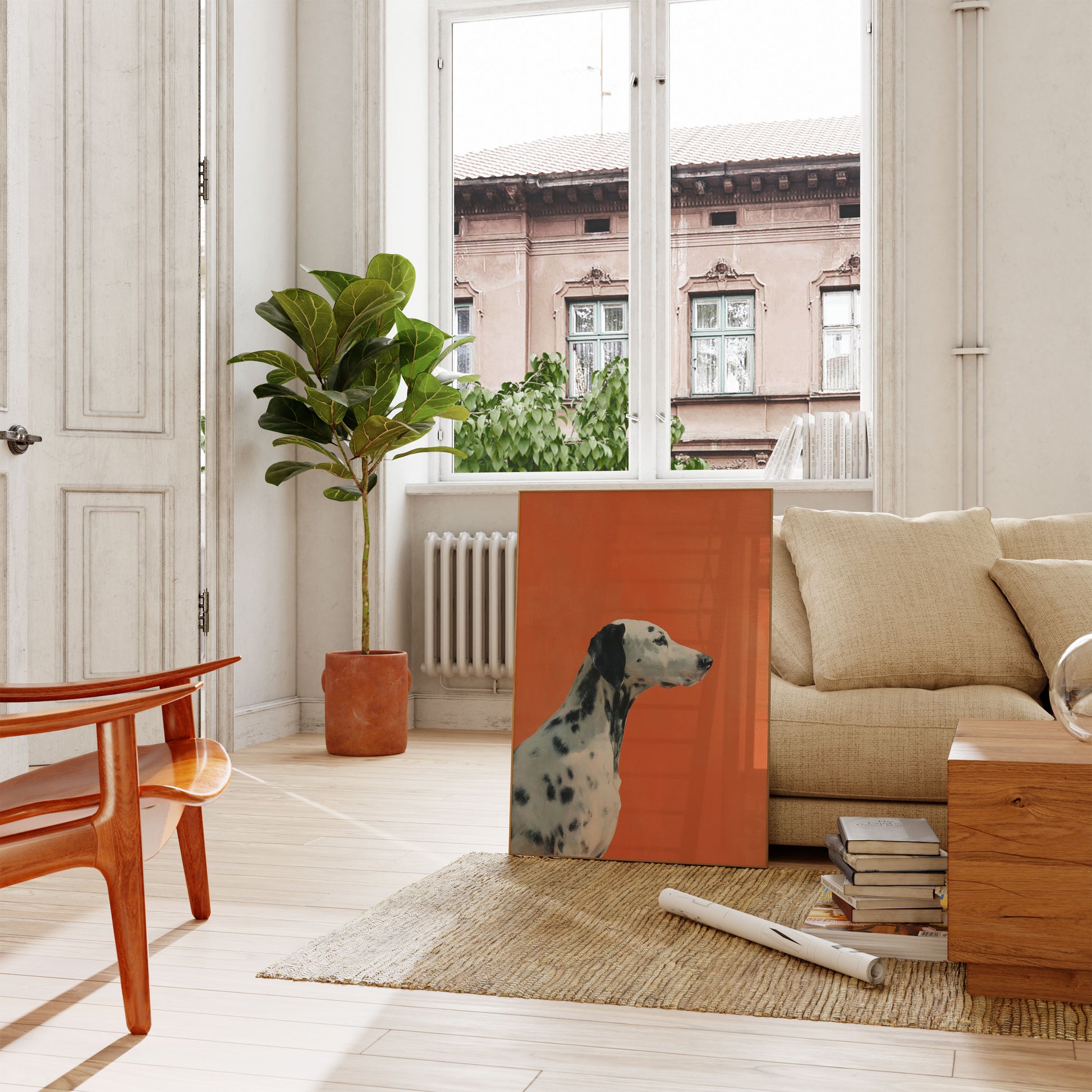 Descubra la belleza atemporal de este impresionante retrato de dálmata, capturado sobre un vibrante fondo naranja que irradia calidez y energía. Su distintivo pelaje moteado en blanco y negro resalta con una claridad excepcional, mostrando el perfil clásico y la postura majestuosa de la raza. Esta obra de arte contemporáneo transforma al querido dálmata en una impactante pieza visual que realzará cualquier espacio con sus colores vibrantes y su sofisticado diseño.