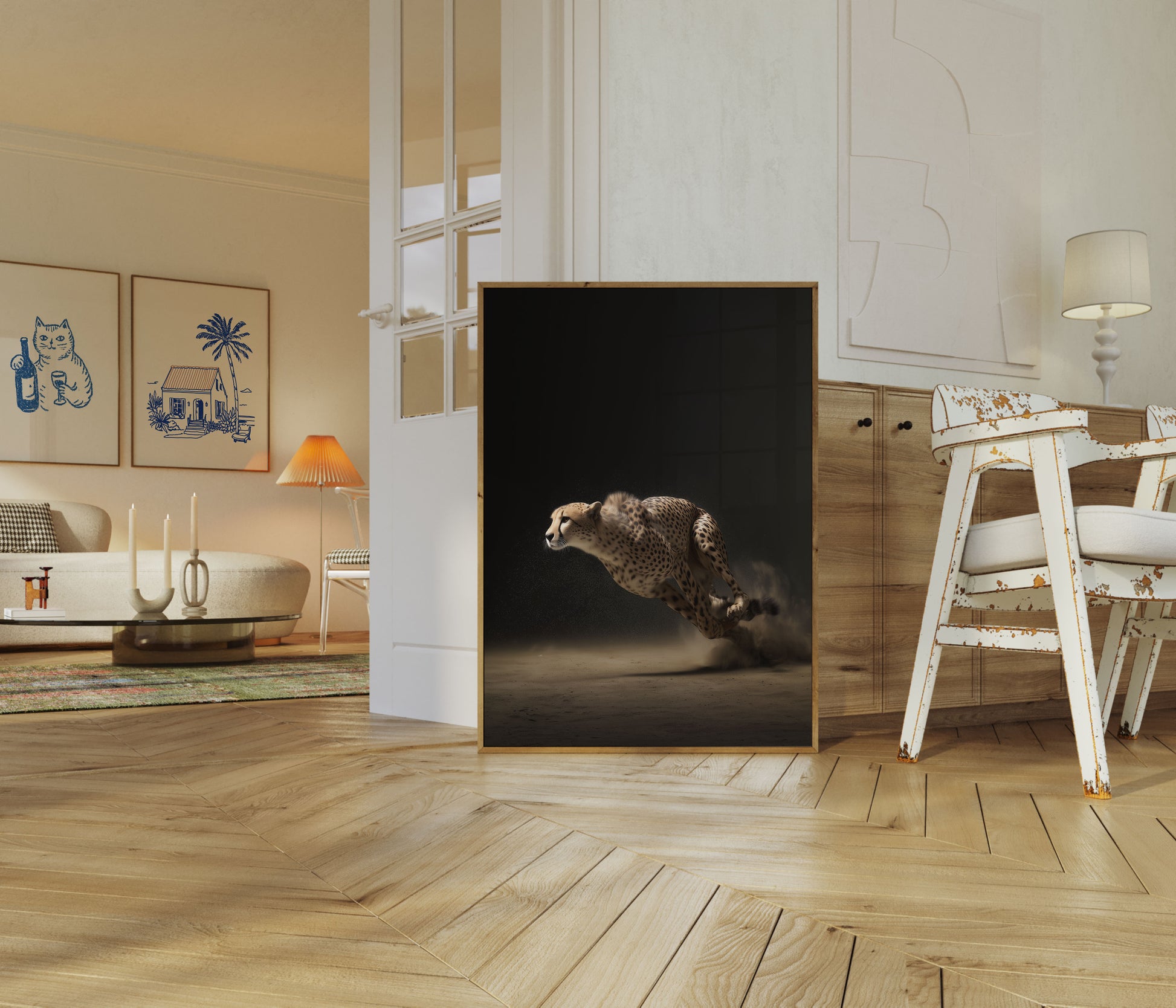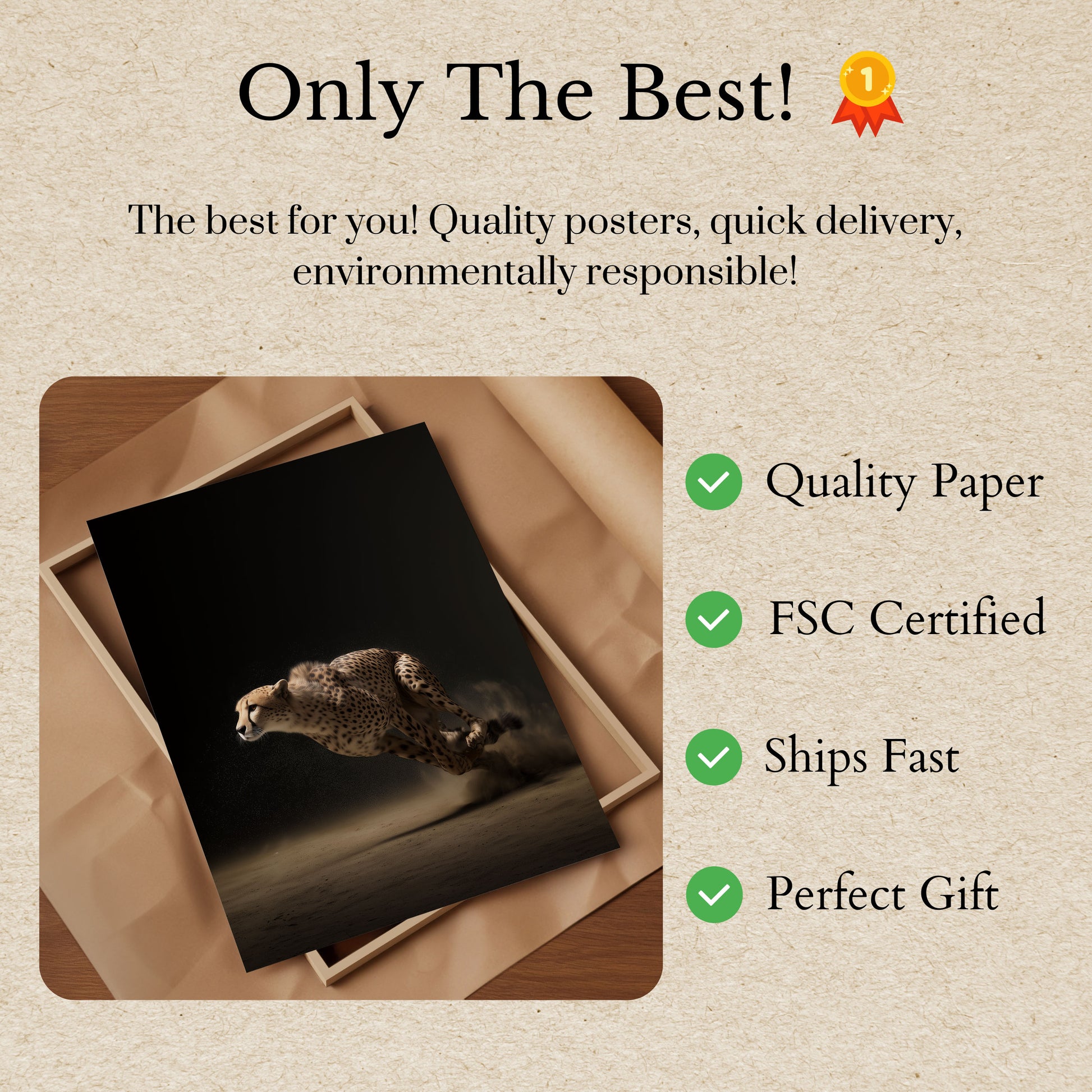 Captura la potencia bruta y la impresionante velocidad del depredador más increíble de la naturaleza con este impresionante póster de guepardo. Suspendido en pleno salto sobre un dramático fondo oscuro, la musculosa figura del guepardo y su pelaje moteado se iluminan con increíble detalle, creando un momento de energía pura e intensa, congelado en el tiempo. El polvo en espiral y la pose dinámica muestran la increíble agilidad y gracia de esta magnífica criatura.