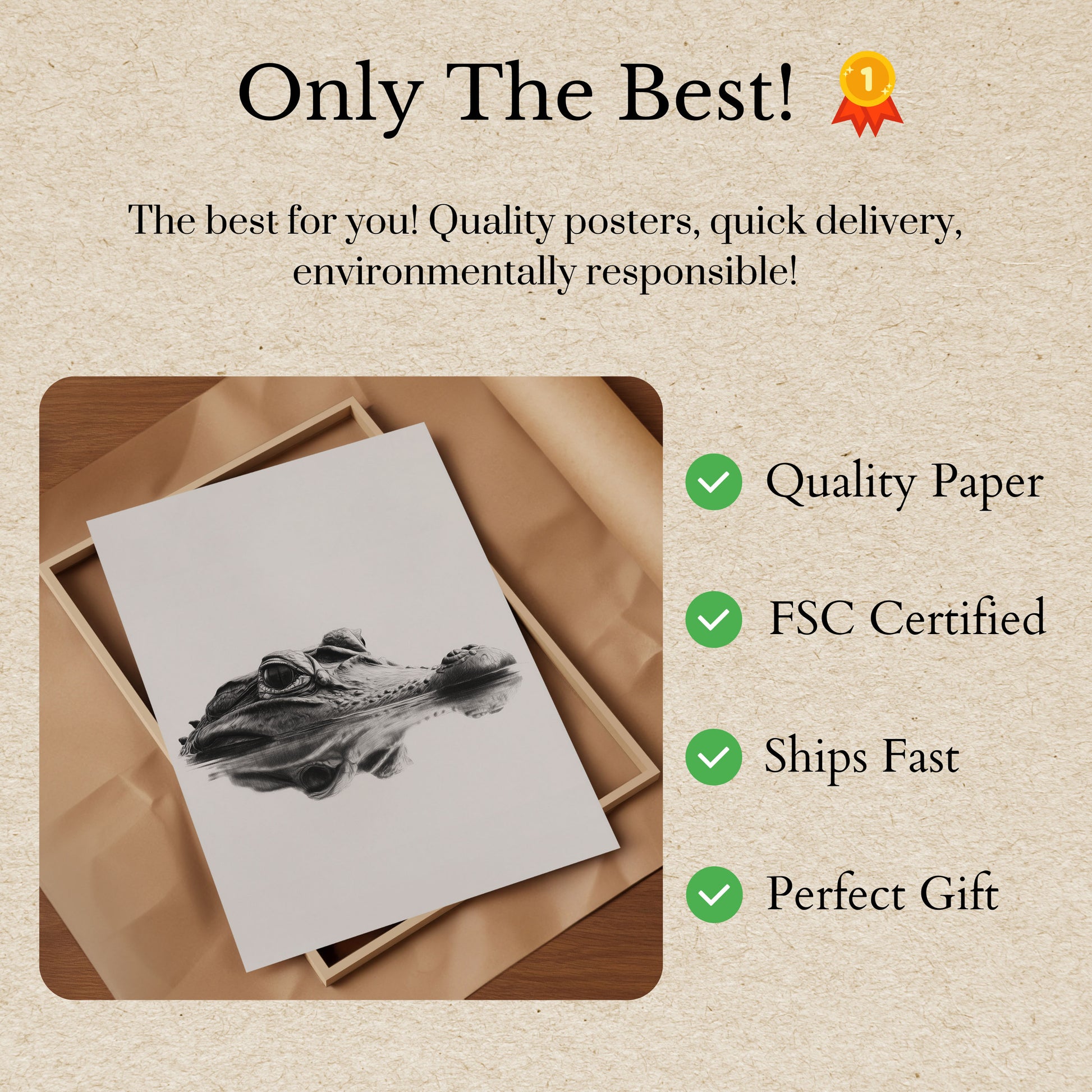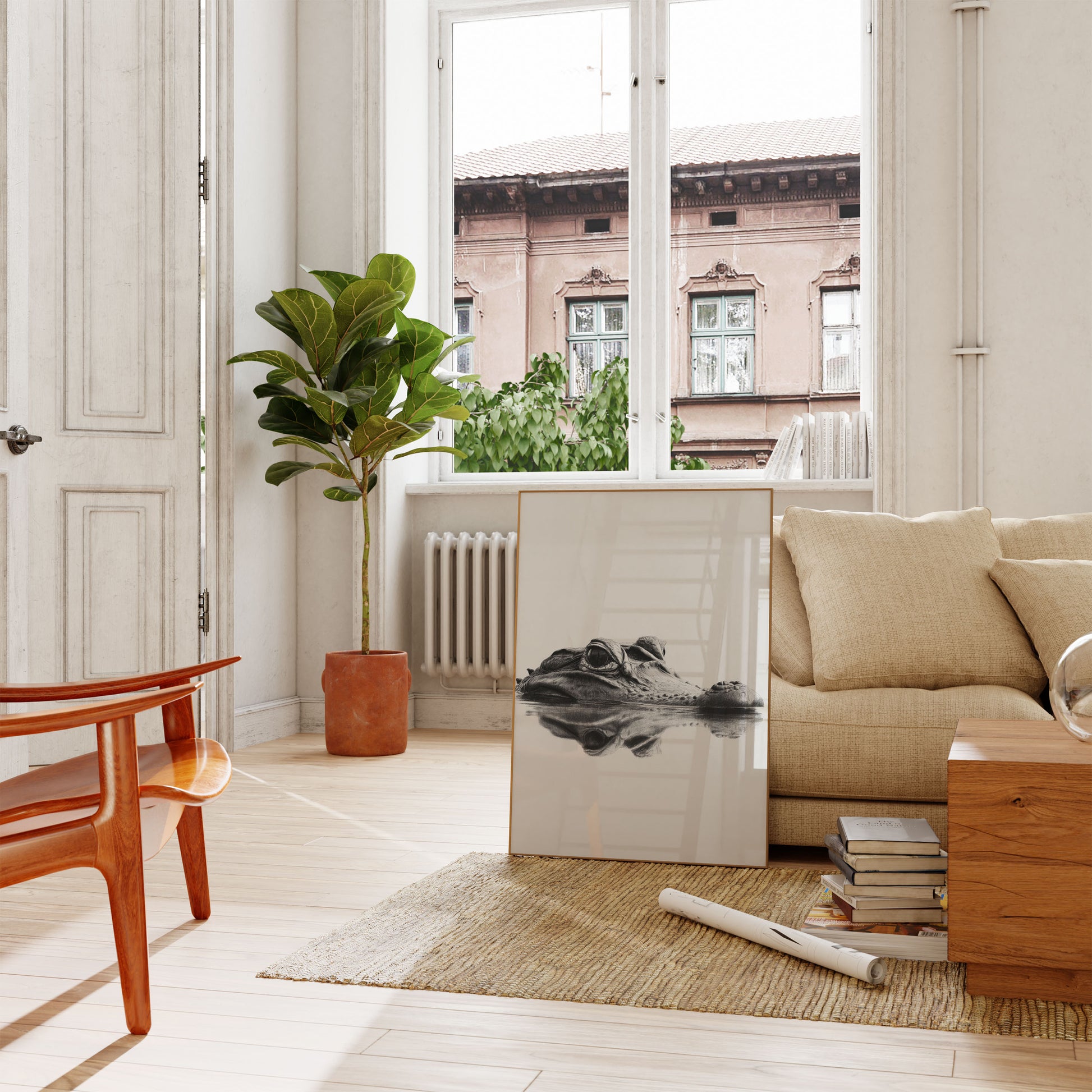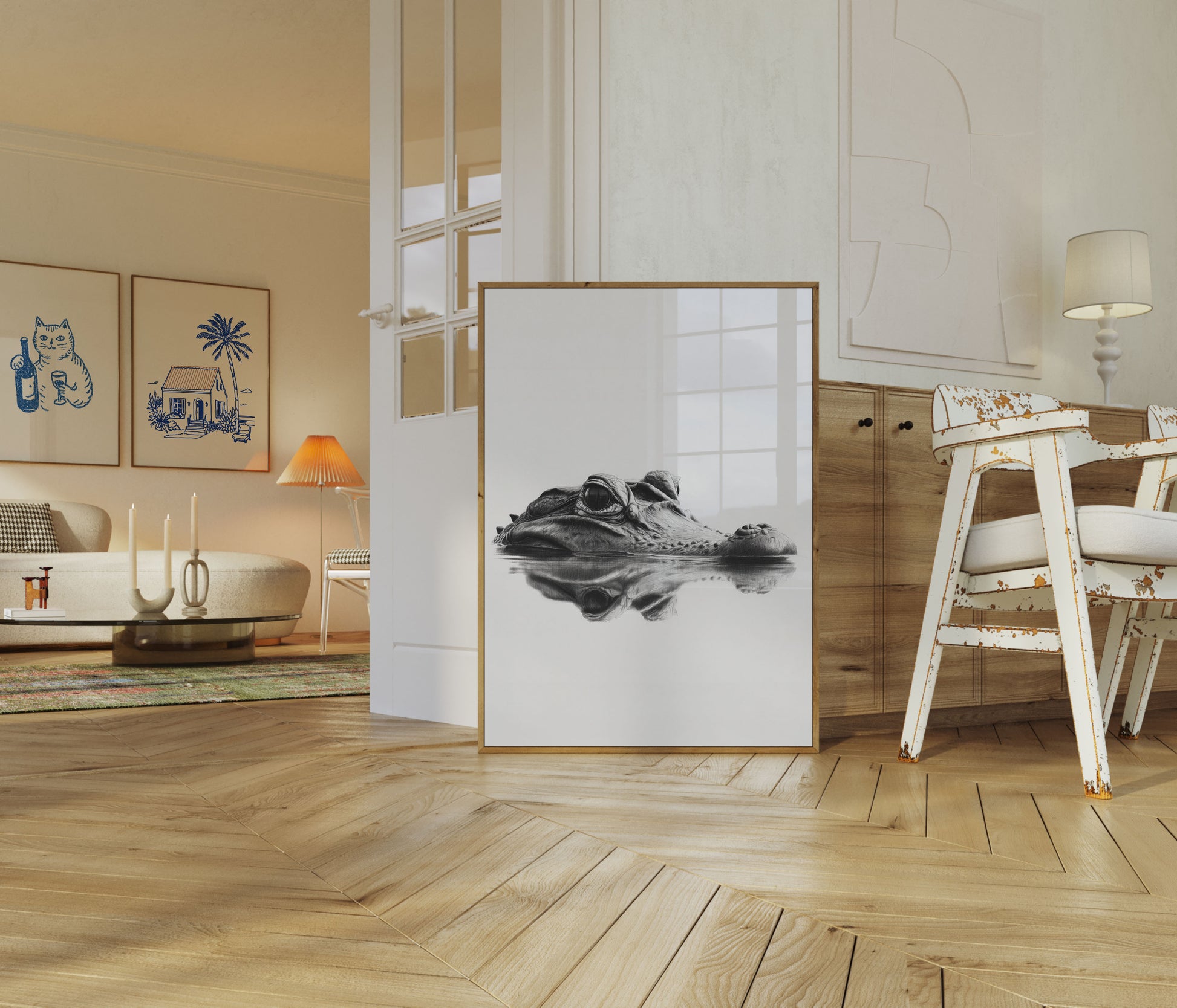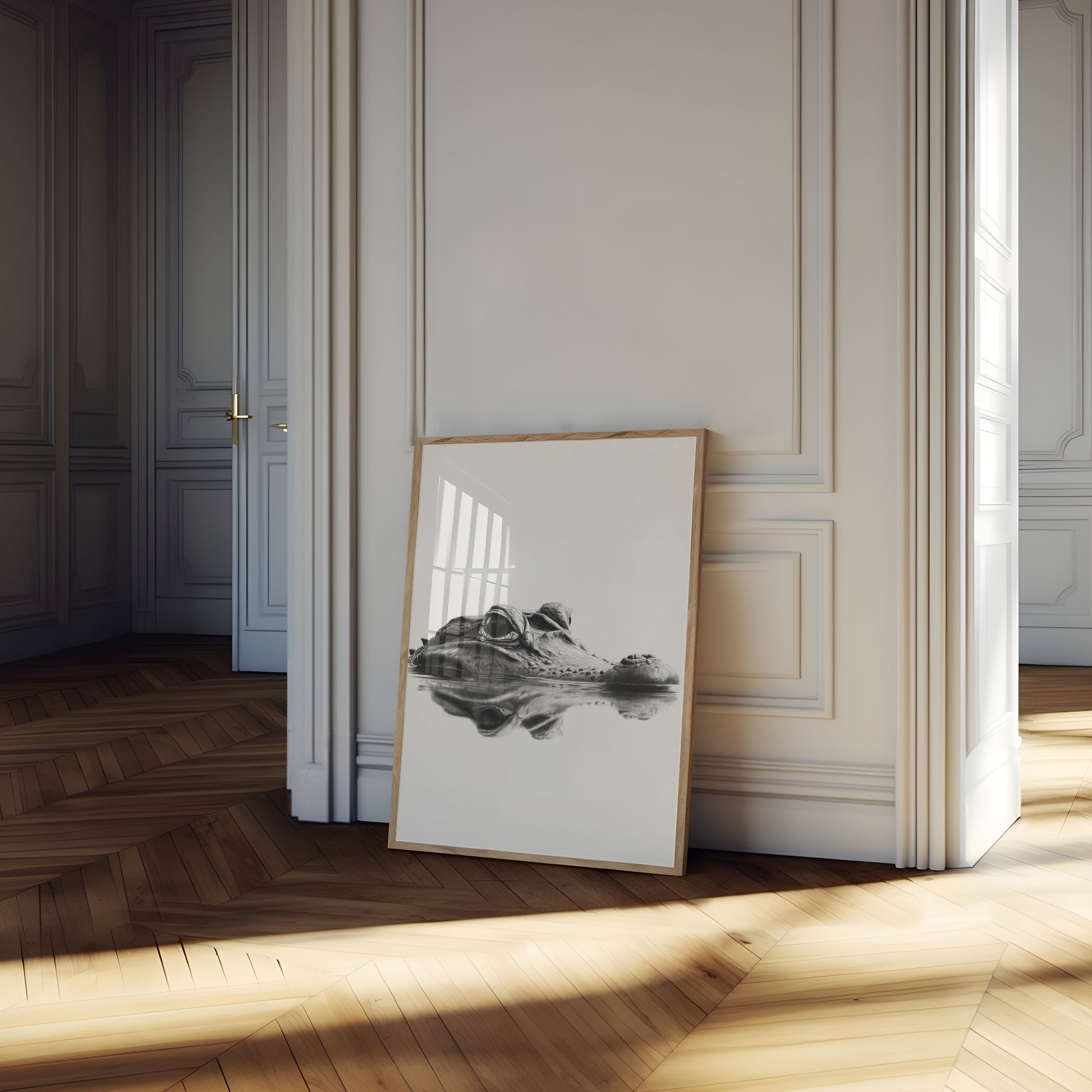 Sumérgete en el fascinante mundo de la intensa mirada de un cocodrilo con este impresionante dibujo fotorrealista en blanco y negro. La obra captura la fuerza bruta y la mística ancestral de este depredador prehistórico, flotando silenciosamente con solo sus ojos y su piel texturizada rompiendo la superficie cristalina del agua. Cada escama detallada y el penetrante ojo de reptil crean una imagen de una belleza cautivadora que te transporta al mundo tranquilo y peligroso del cocodrilo.