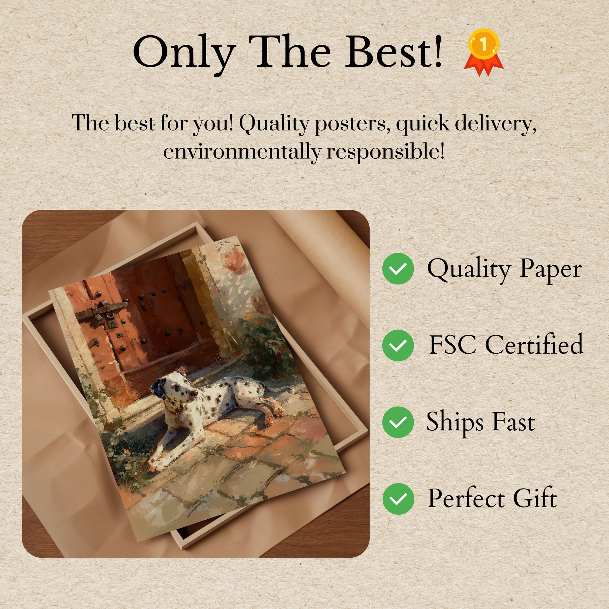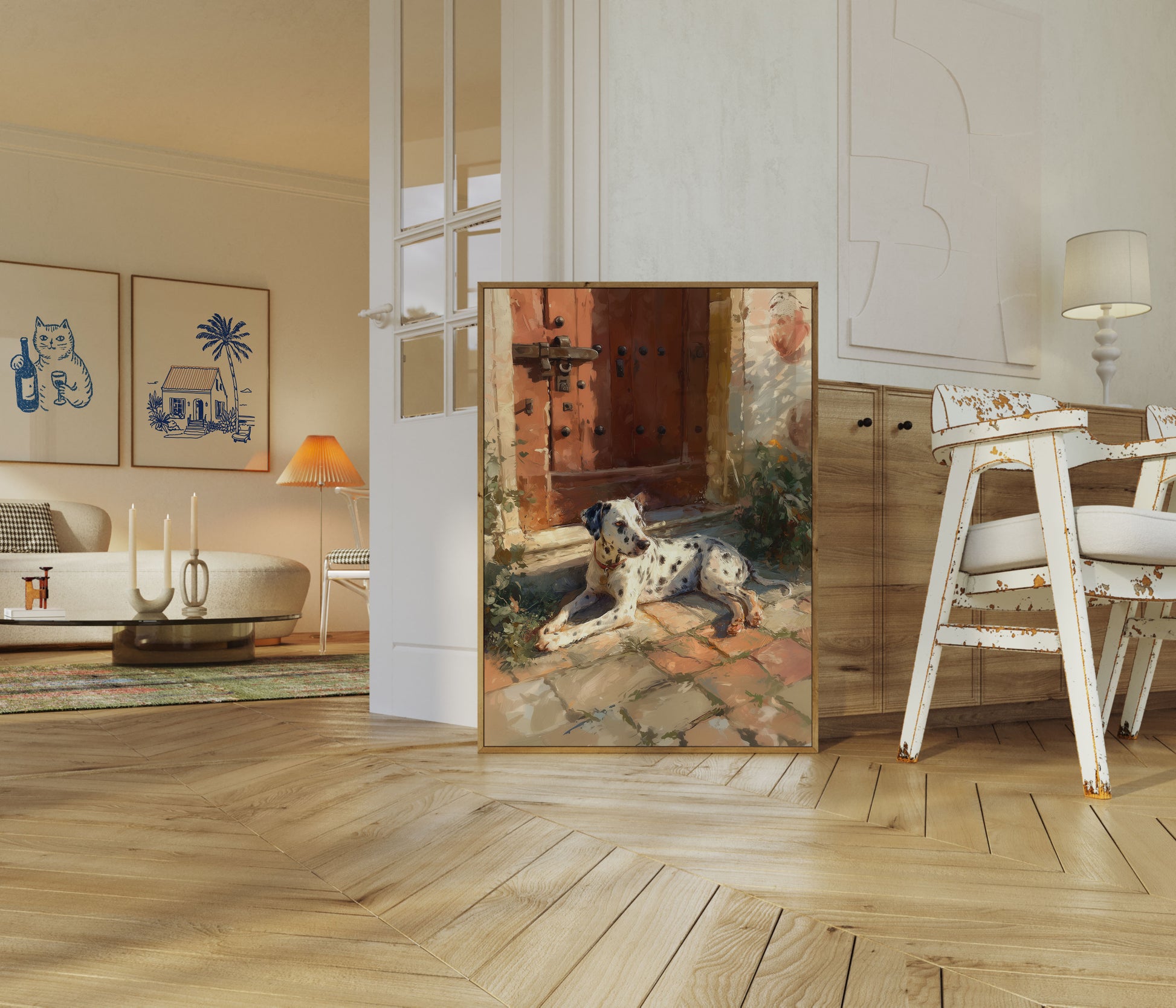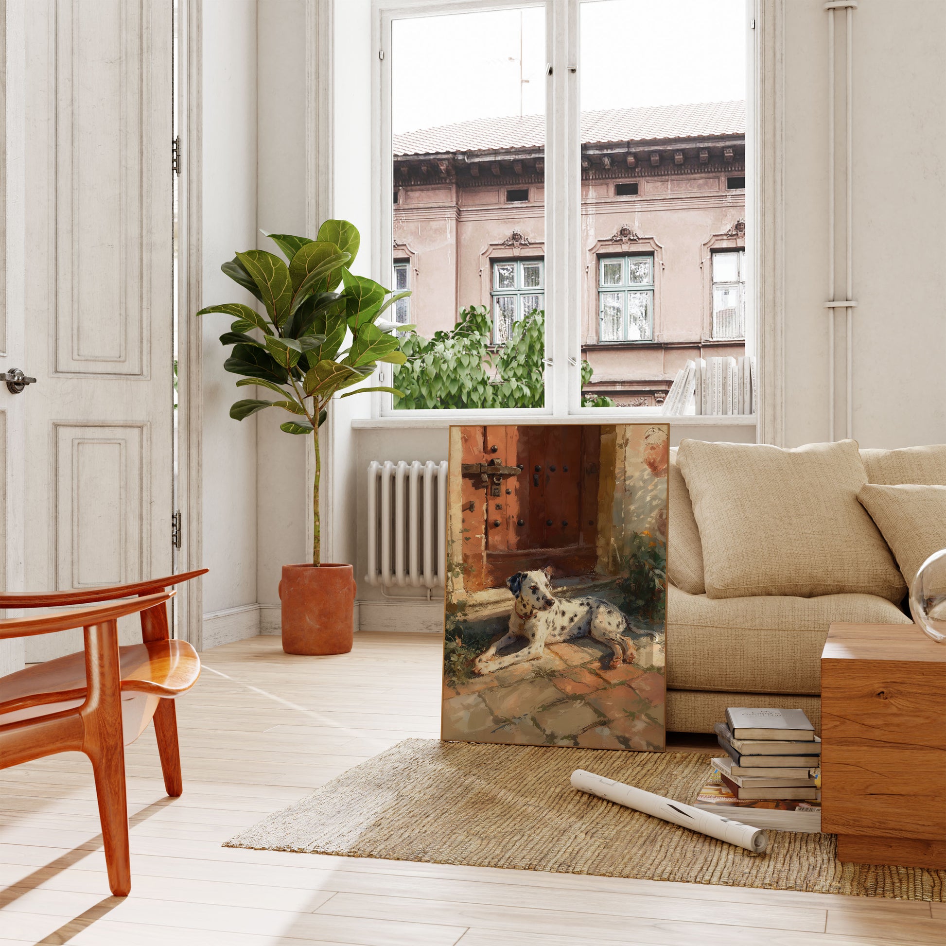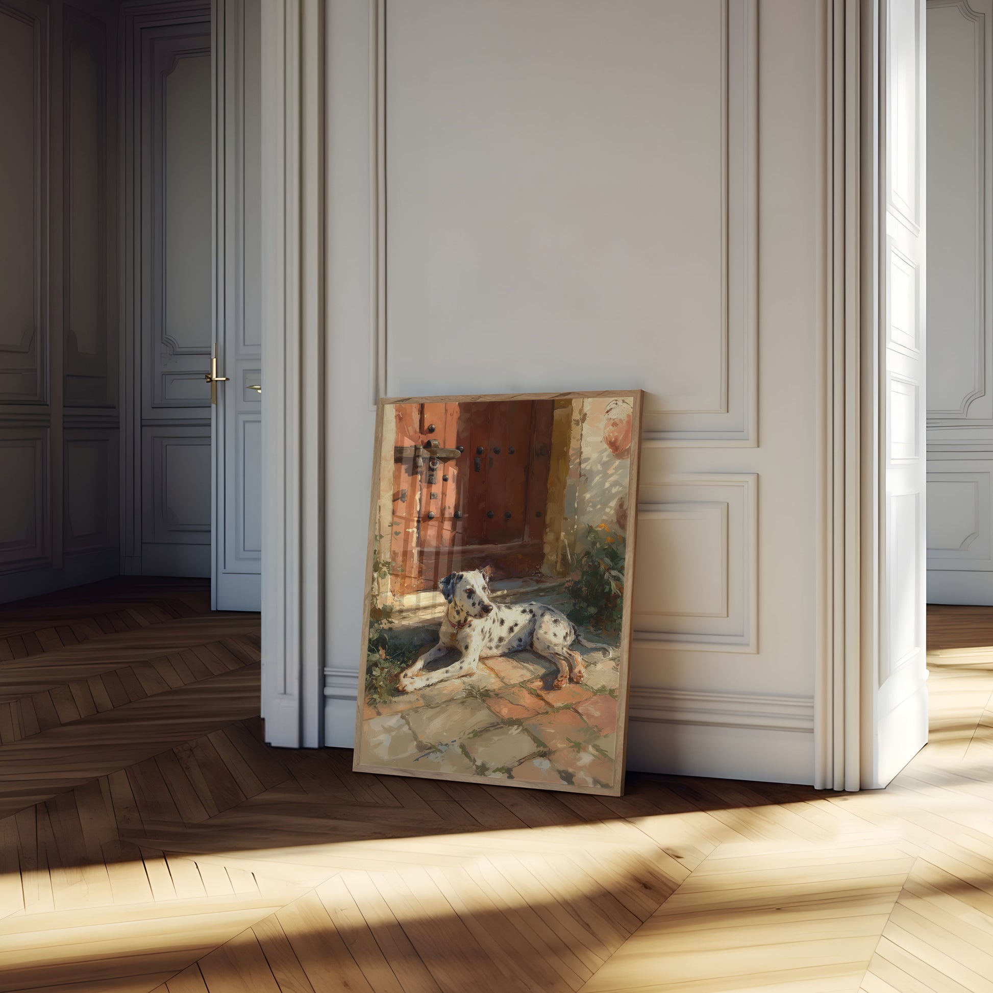 Un dálmata sereno descansa plácidamente junto a una puerta cálida y rústica, bañado por una suave luz dorada. La pintura captura el momento de tranquilidad con delicadas pinceladas, resaltando el distintivo pelaje moteado del perro y las baldosas de terracota texturizadas. Los ricos tonos terrosos y las suaves sombras crean una sensación de calma y compañía en esta impresionante representación artística.