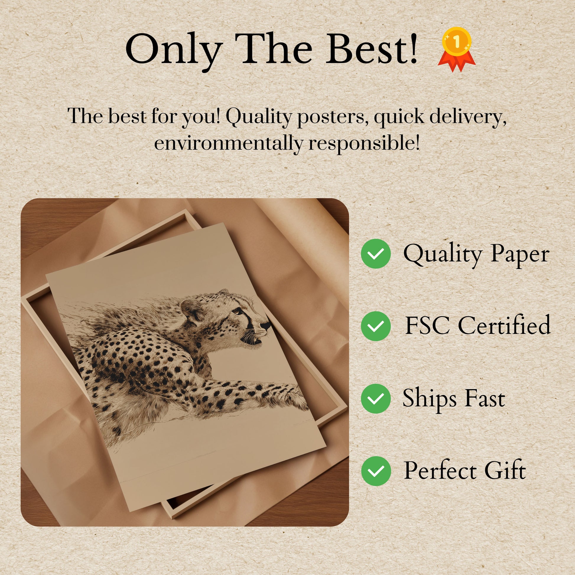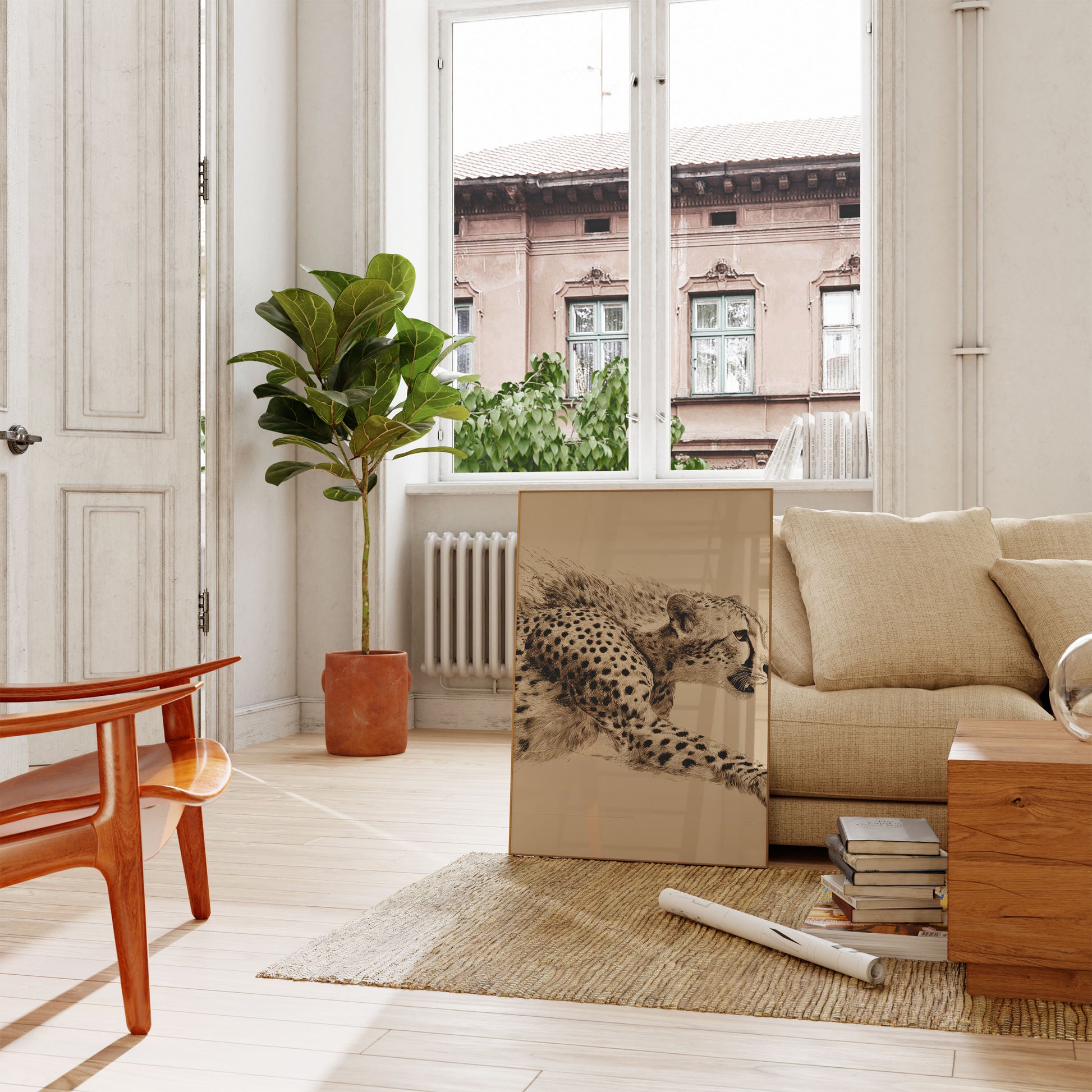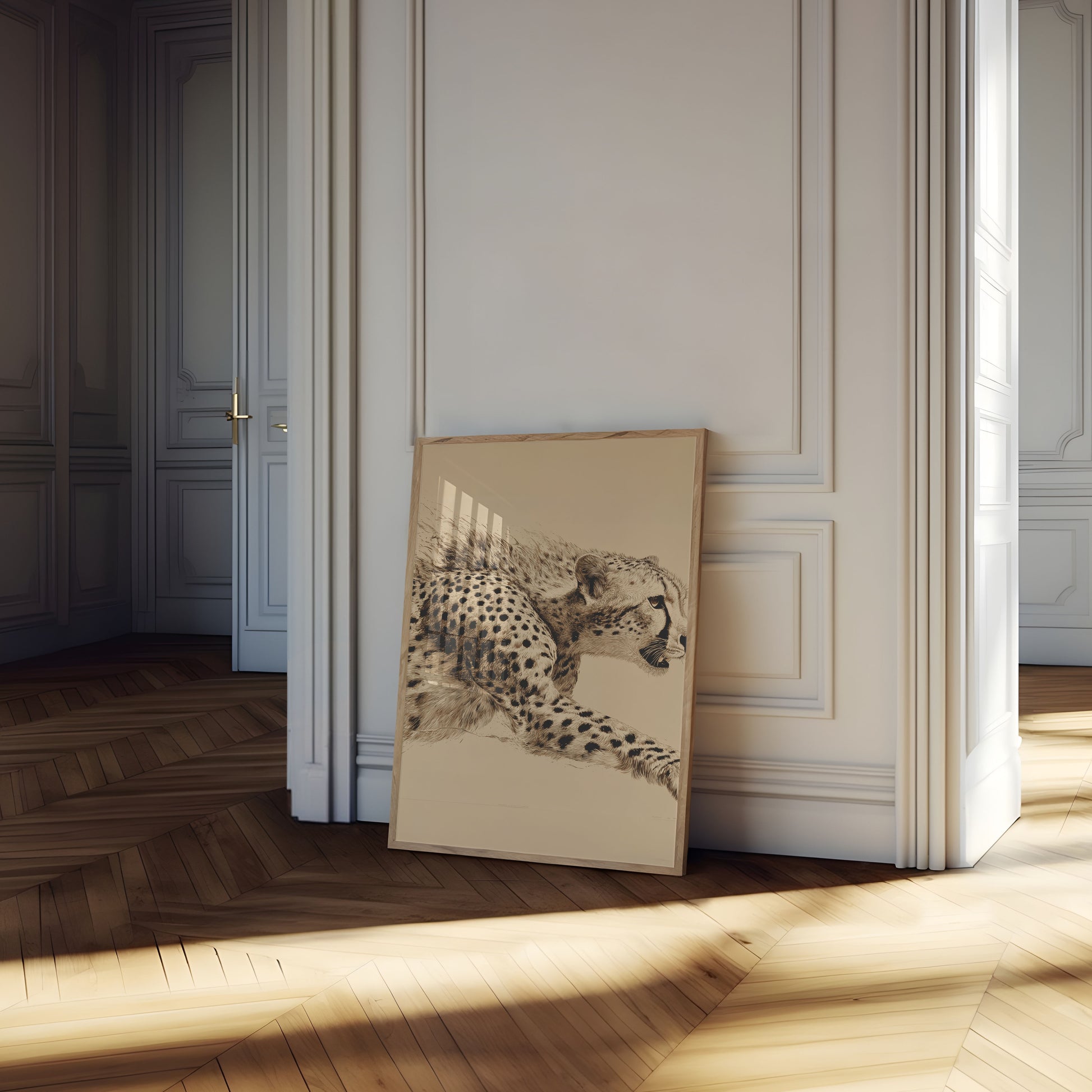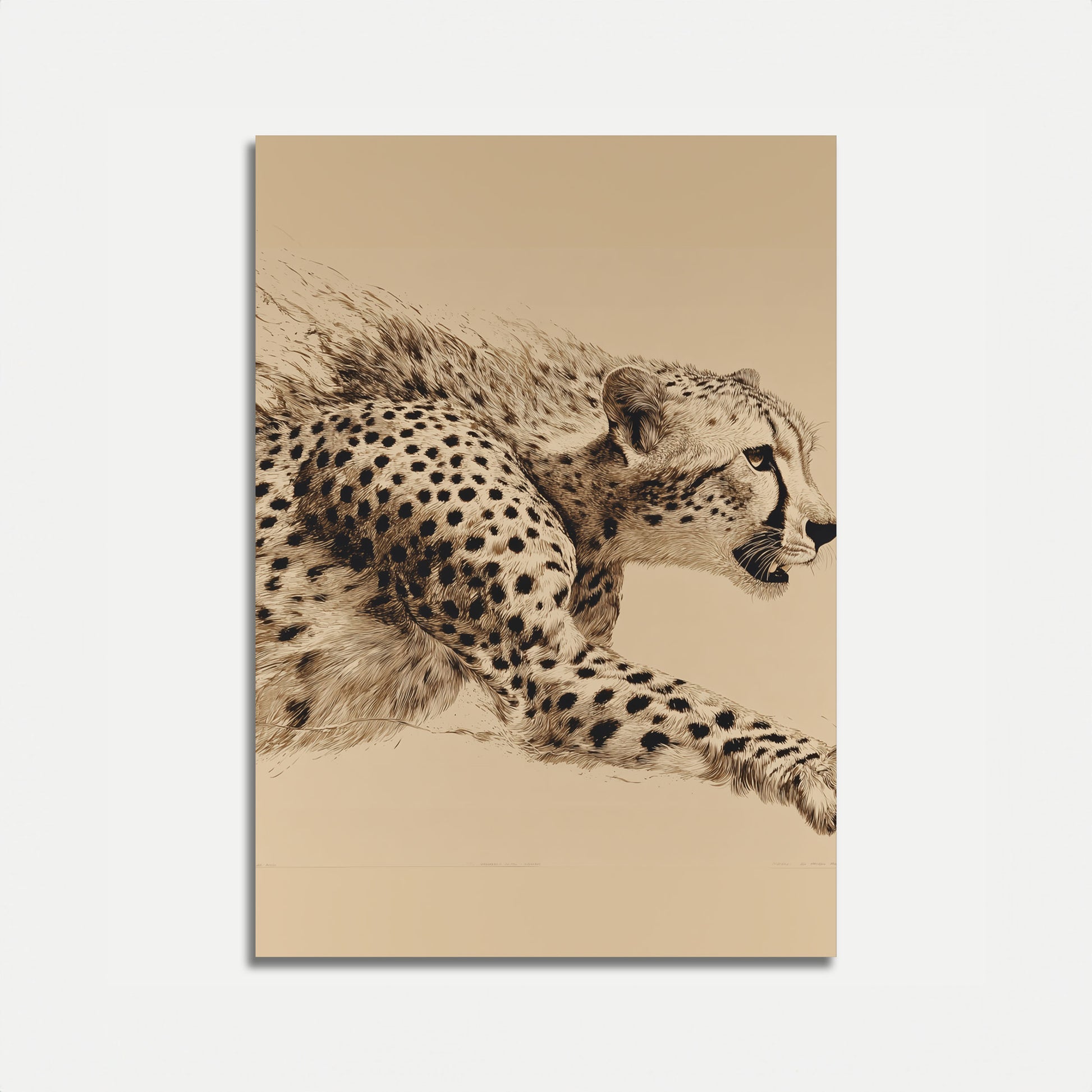 Captura la impresionante esencia de la velocidad pura y la gracia salvaje con esta impresionante obra de arte de guepardo en tonos sepia. La intrincada ilustración revela cada detalle muscular y su patrón moteado, mostrando al magnífico depredador a plena zancada en un momento de movimiento puro y potente. Elegante y sofisticado, este póster lleva el espíritu indómito de la sabana africana directamente a tu hogar.