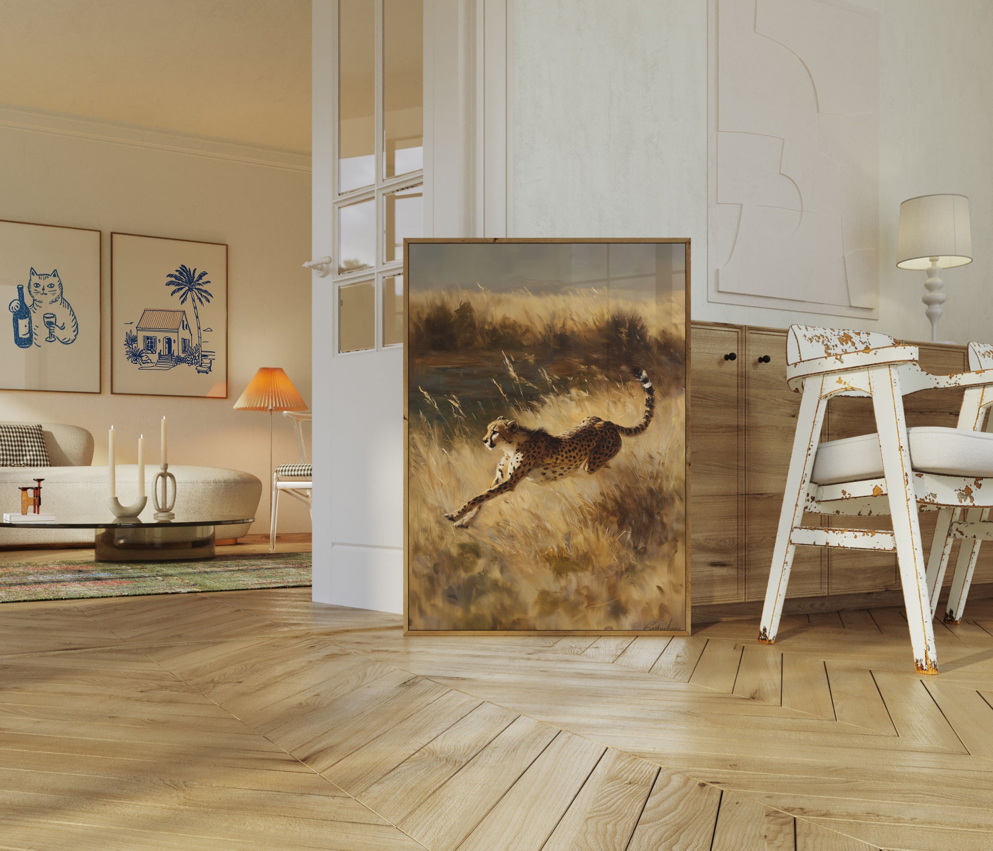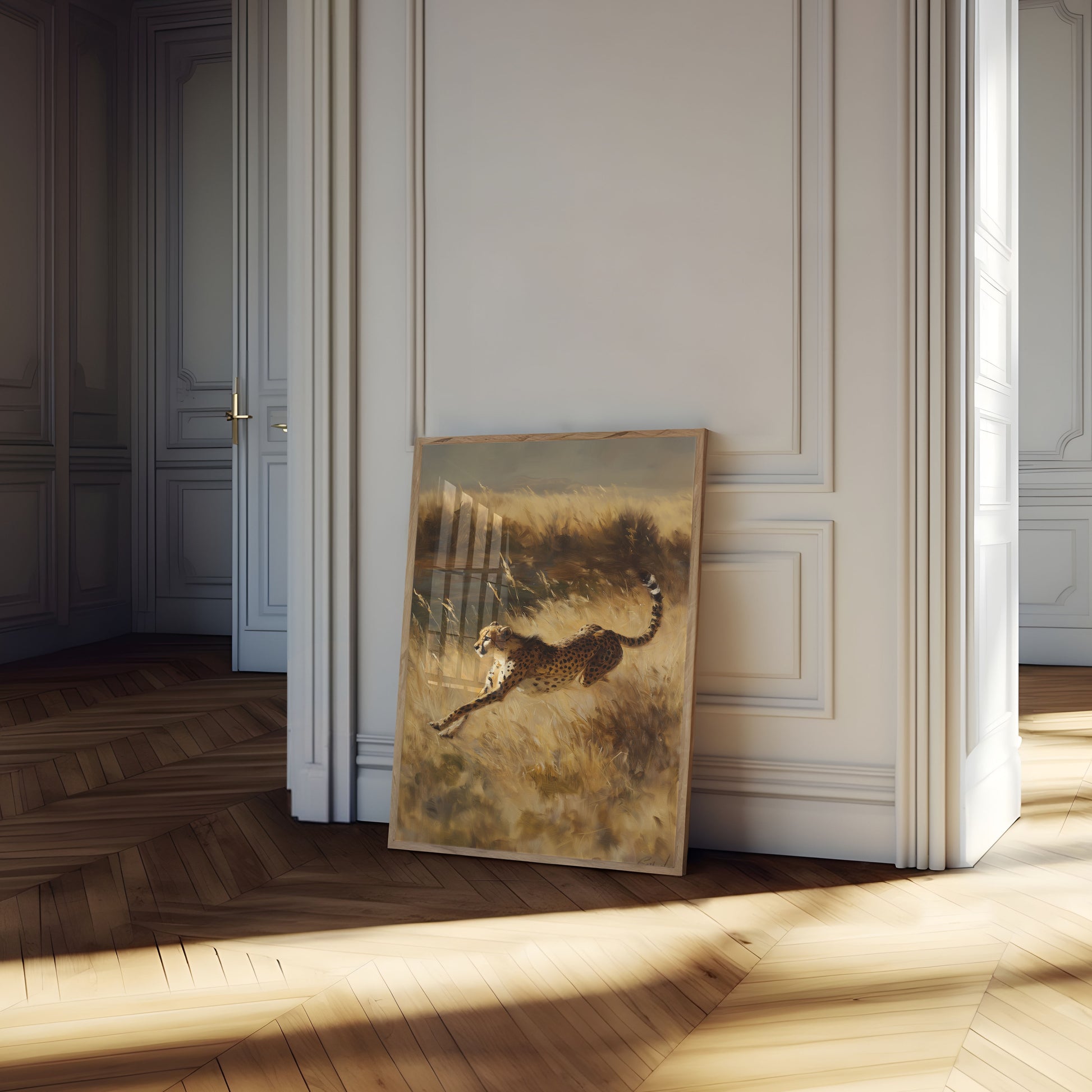 Captura la potencia y la elegancia de un guepardo al galope por praderas doradas en esta impresionante lámina de vida silvestre. La pintura captura con belleza el movimiento explosivo y la gracia muscular del mamífero terrestre más rápido del mundo, con ricas pinceladas en tonos tierra que dan vida a la sabana africana. Cada línea dinámica y cada detalle moteado revelan la increíble fuerza y la fluidez del guepardo en un paisaje evocador y de ensueño.