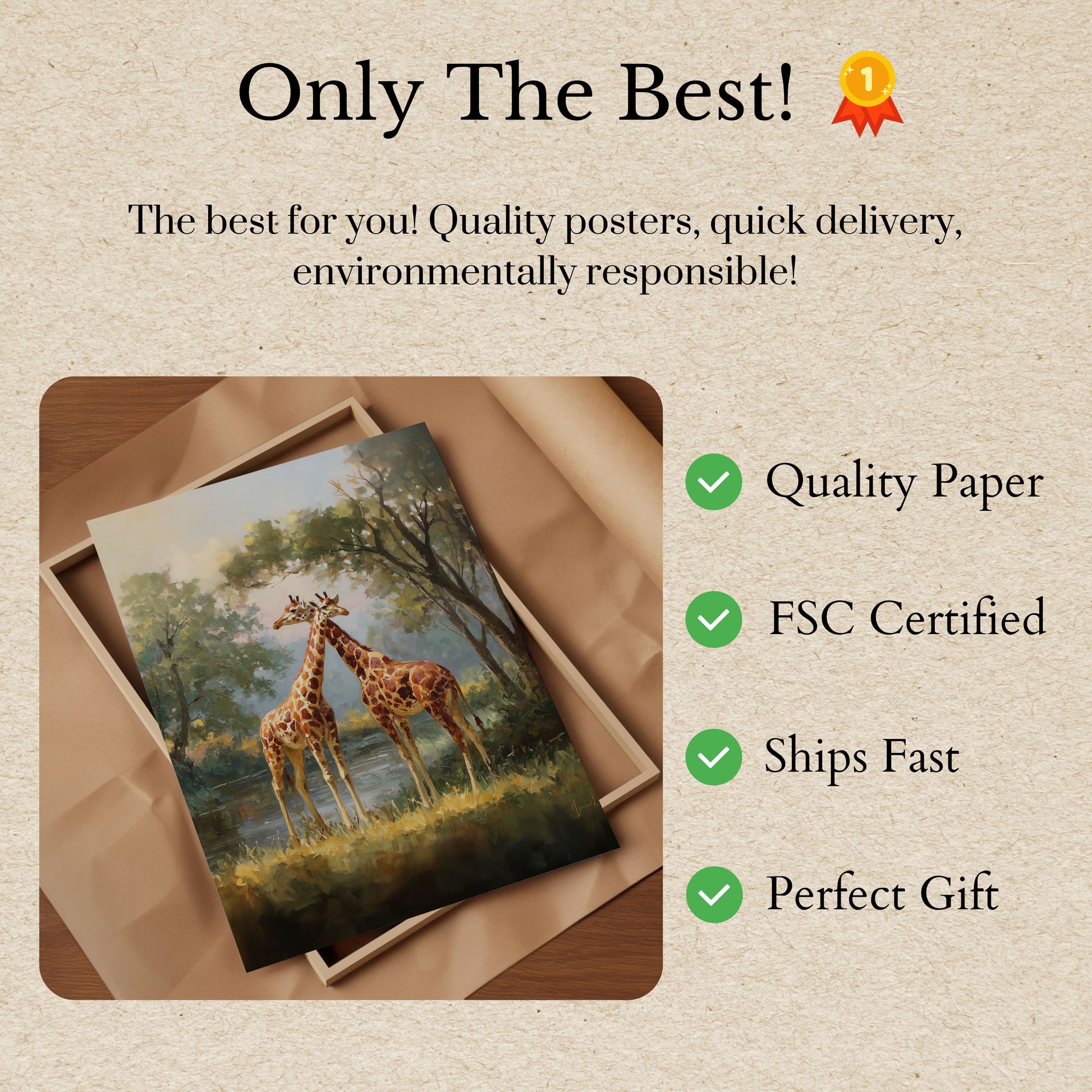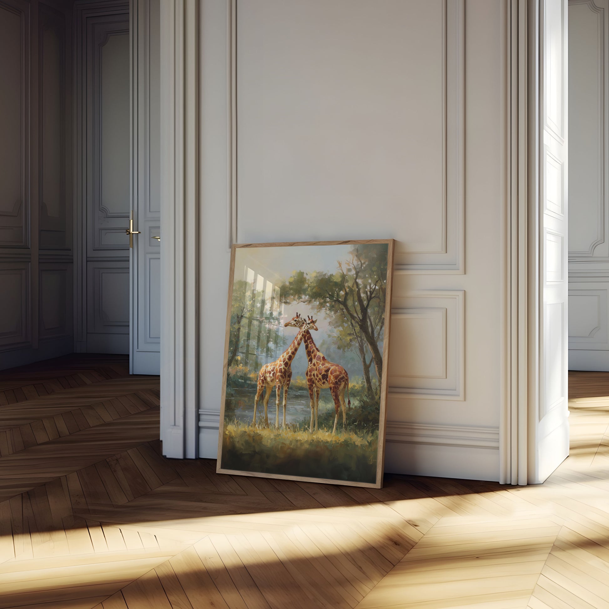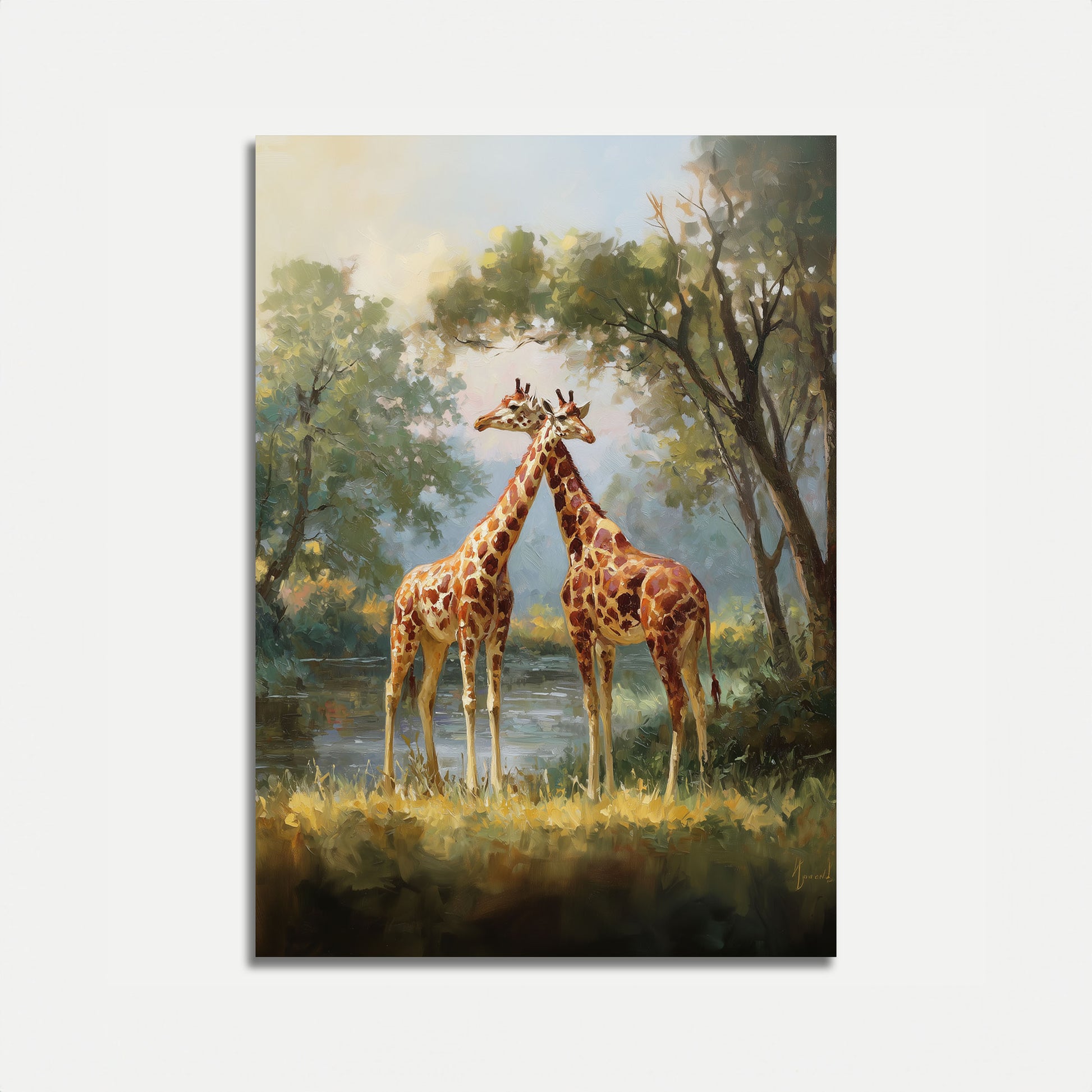 Dos elegantes jirafas comparten un momento íntimo en un paisaje de ensueño y tonos suaves, con sus cuellos delicadamente entrelazados sobre un fondo de árboles brumosos y aguas tranquilas. La obra pictórica captura una escena serena de conexión y gracia, con cálidos tonos dorados y verdes que crean una sensación de paz y naturaleza salvaje. Cada pincelada da vida a la sabana africana con una profundidad emocional y una belleza natural extraordinarias.