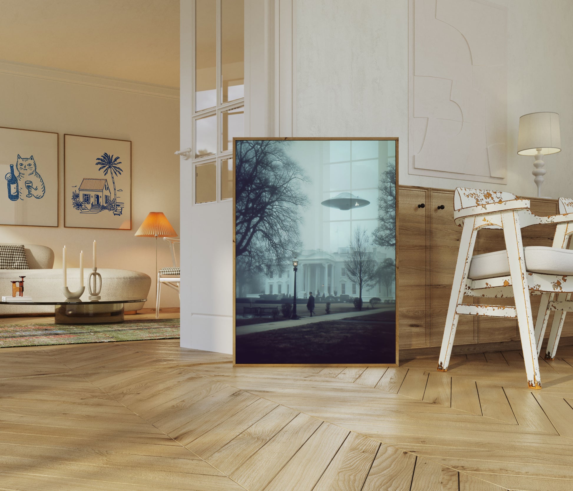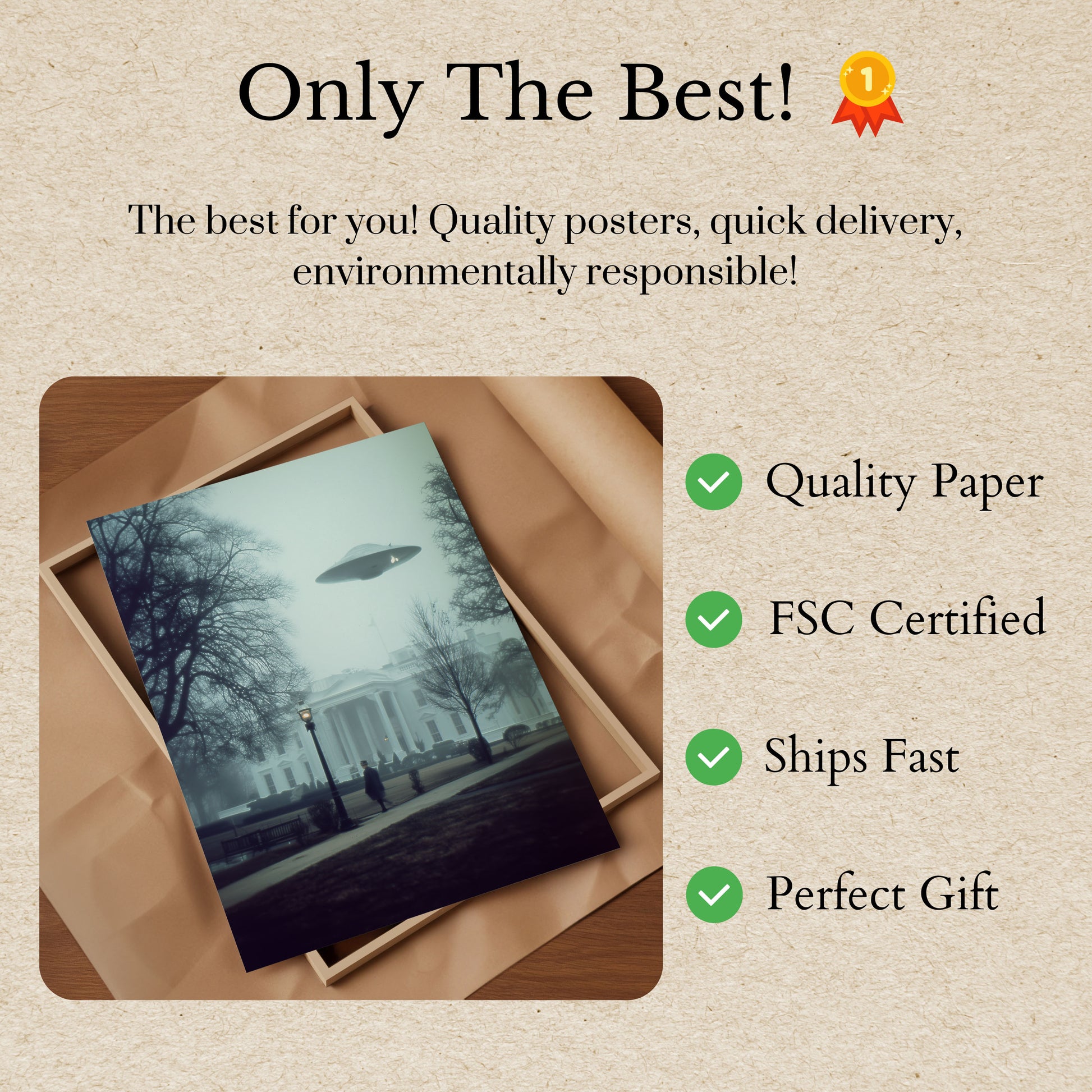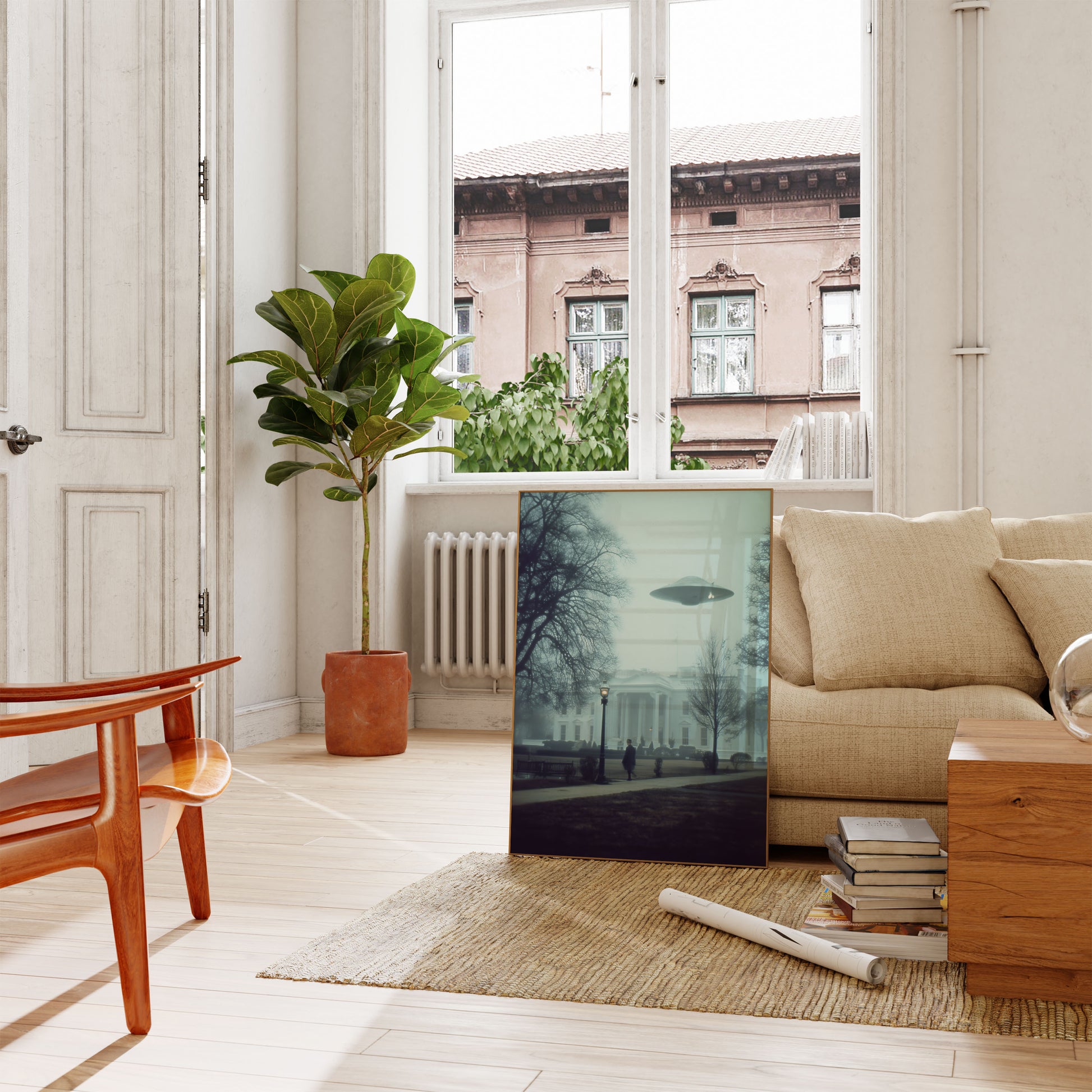 Step into a mysterious foggy scene where an otherworldly flying saucer hovers near the iconic White House, creating an eerie and surreal atmosphere. The misty green-gray tones and silhouetted trees frame a classic UFO suspended in the cold winter air, inviting viewers to imagine extraordinary possibilities of extraterrestrial visitation. This atmospheric poster captures the tension and wonder of an unexpected cosmic encounter in the heart of political power.