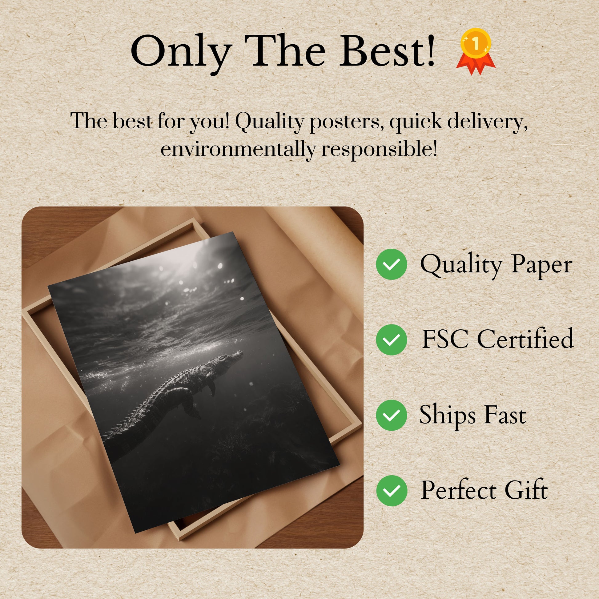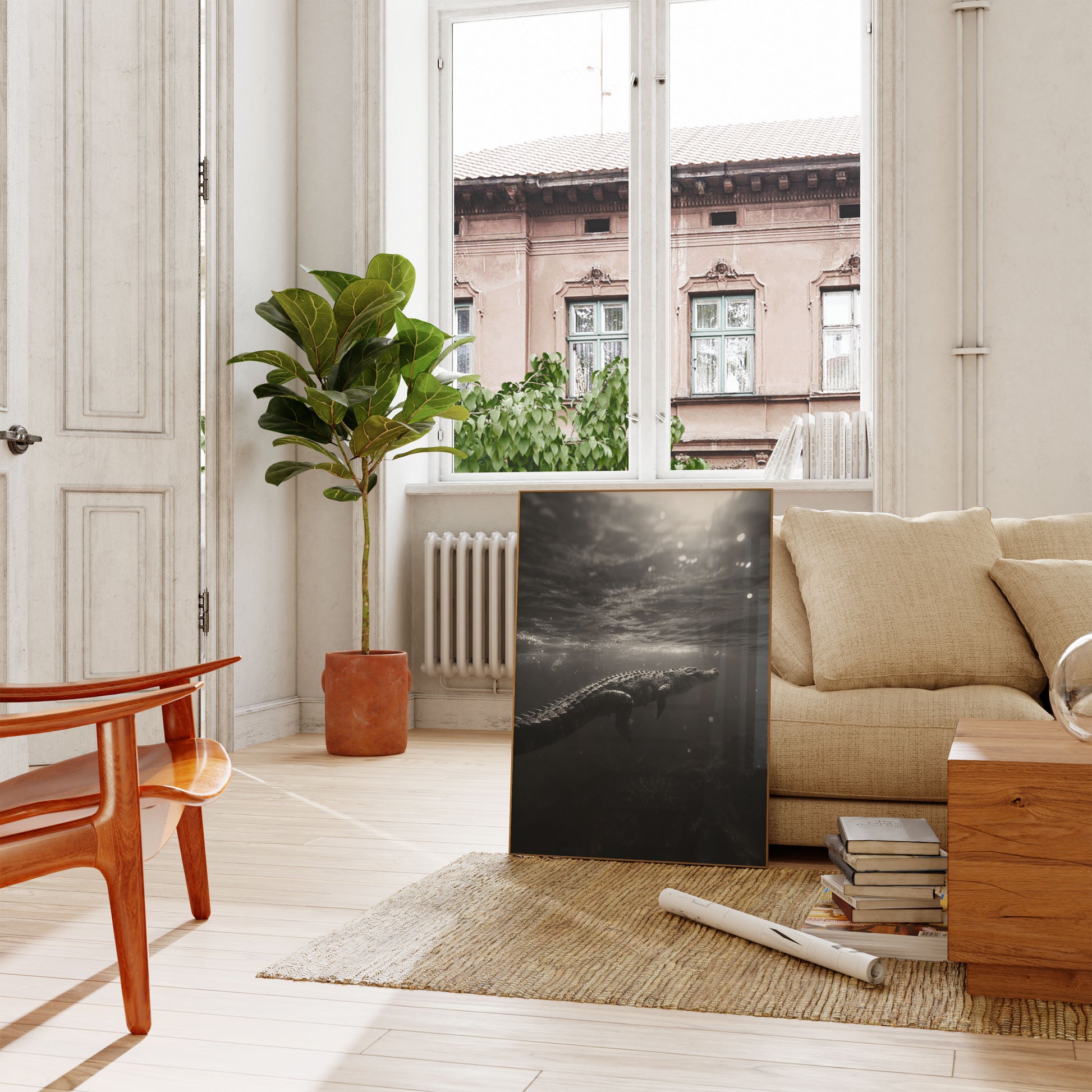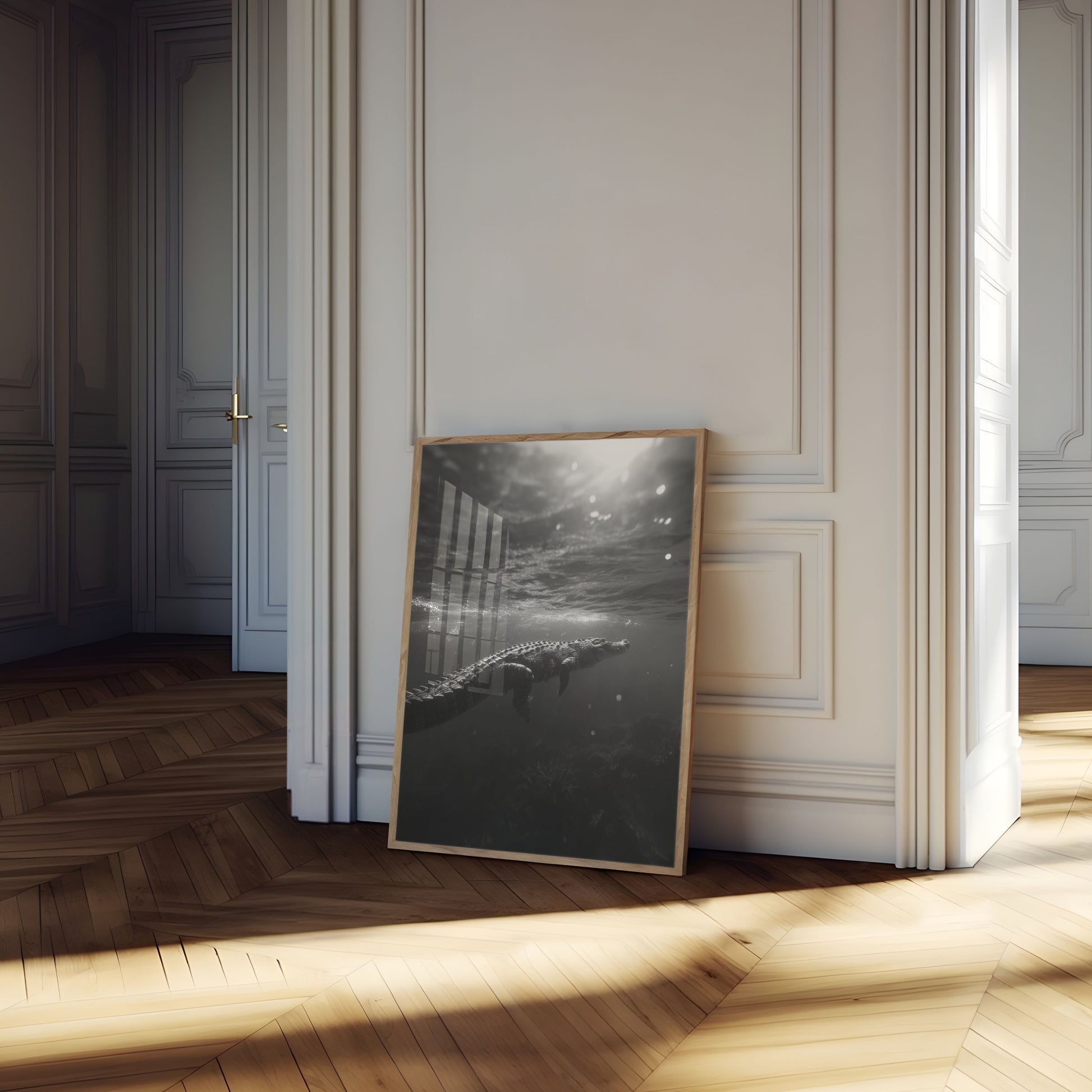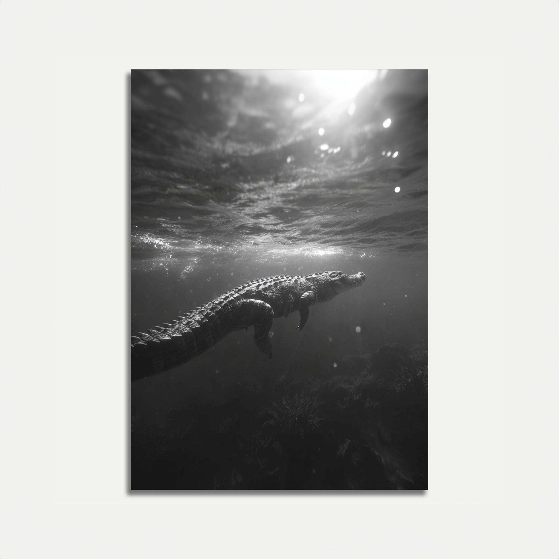 Sumérgete en el fascinante mundo de un cazador prehistórico deslizándose por aguas turbias. Esta impresionante fotografía submarina en blanco y negro captura un cocodrilo suspendido en un etéreo reino acuático, con la luz filtrándose a través de la superficie ondulante, creando una atmósfera dramática e inquietante. Los intrincados detalles de la piel acorazada del reptil y su imponente silueta crean una experiencia visual intensa y primitiva que sumerge al espectador en las misteriosas profundidades.