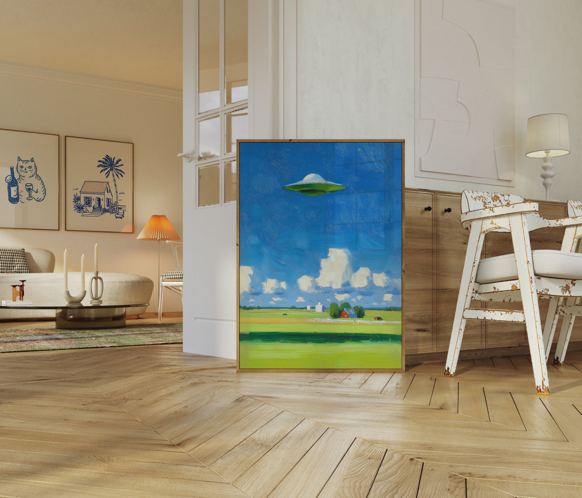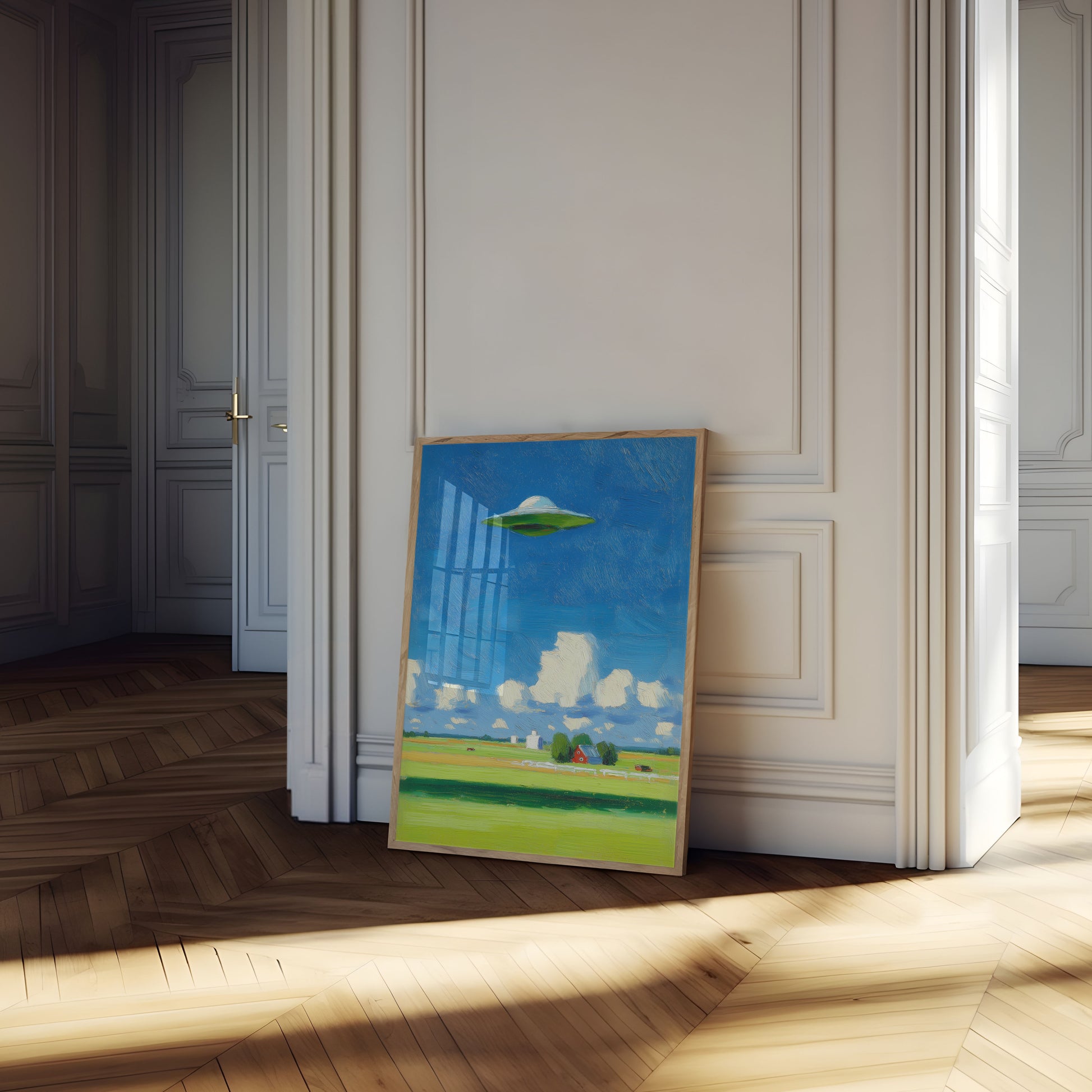 Un paisaje surrealista captura un clásico platillo volador flotando sobre una apacible escena rural, donde una brillante casa de campo roja se encuentra entre campos verdes y esponjosas nubes blancas. El intenso cielo azul y el OVNI perfectamente posicionado crean un momento onírico de intersección sobrenatural con la vida cotidiana en la granja. Esta obra de arte fusiona lo cotidiano con lo extraordinario en una narrativa visual deliciosamente inesperada.