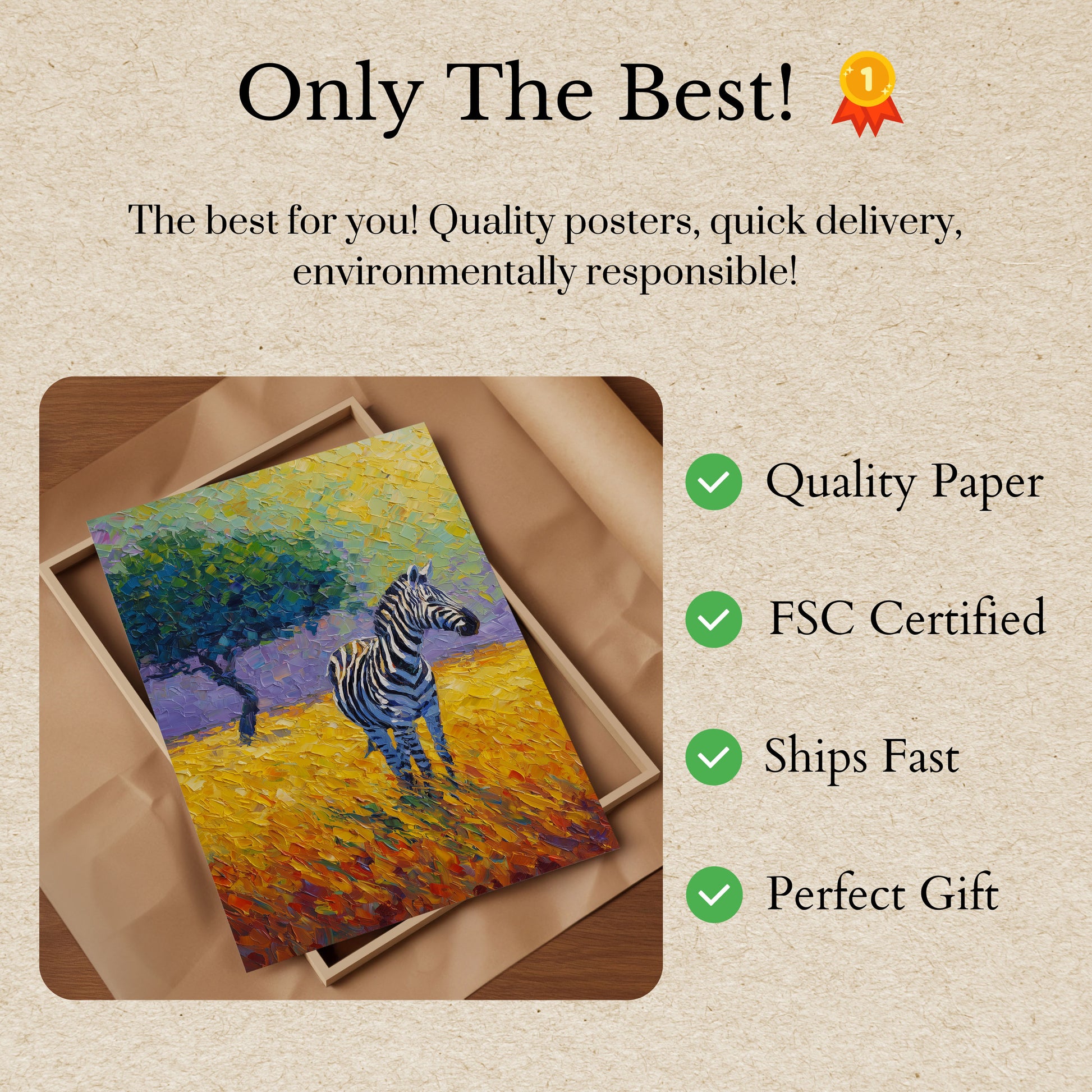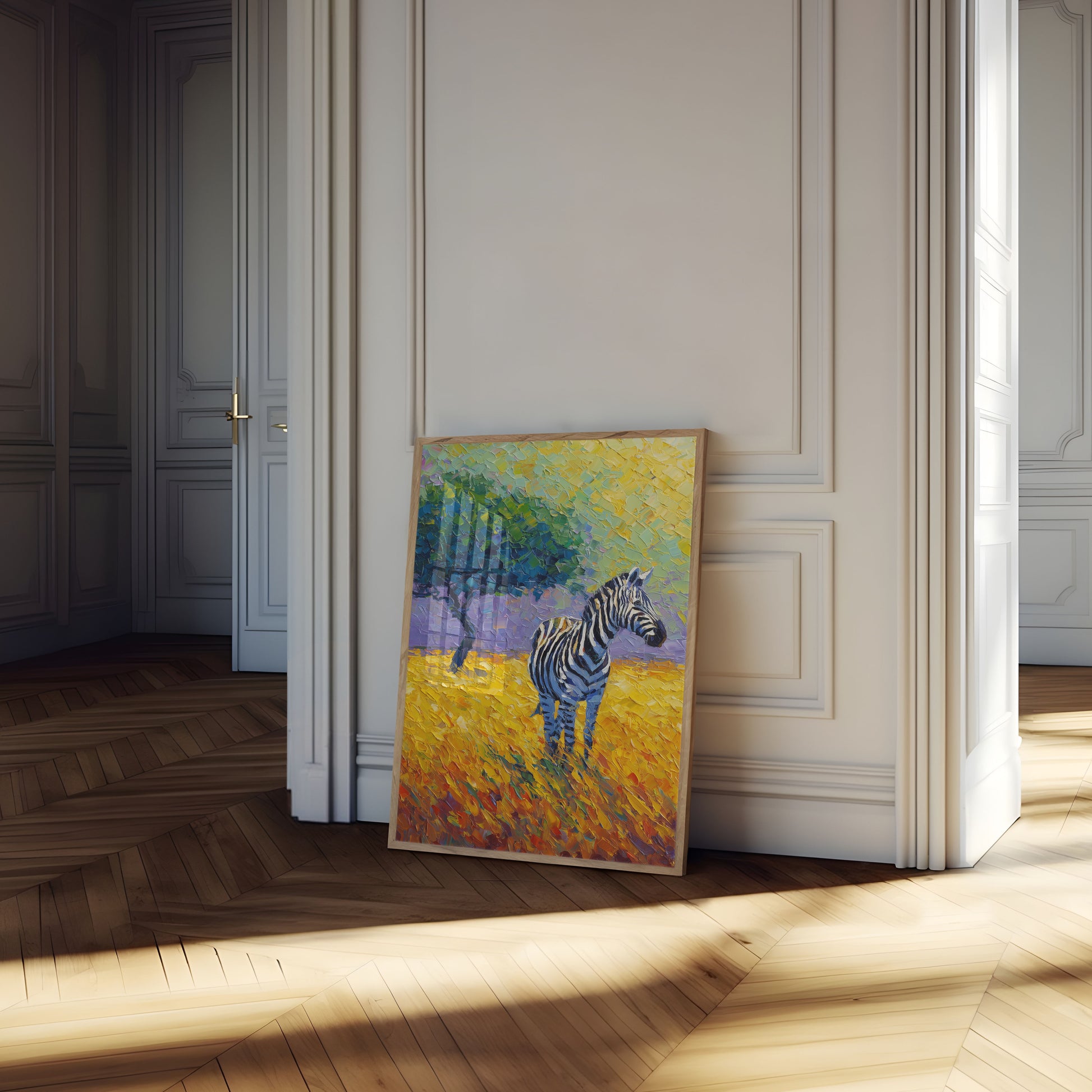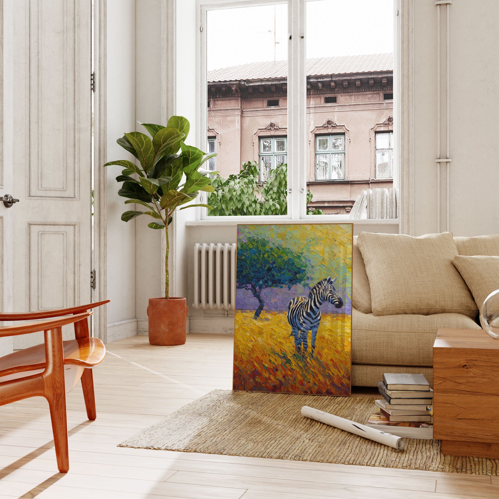 Sumérgete en un caleidoscopio de color con esta impresionante pintura al óleo que presenta una cebra solitaria en medio de una pradera dorada y un exuberante paisaje impresionista. Pinceladas ricas y texturizadas en amarillos, verdes, azules y morados crean una escena cautivadora que captura el espíritu salvaje y la belleza etérea de la sabana africana. Las icónicas rayas blancas y negras de la cebra contrastan marcadamente con el fondo cálido y dinámico, invitando al espectador a una experiencia de ensueño en la naturaleza.