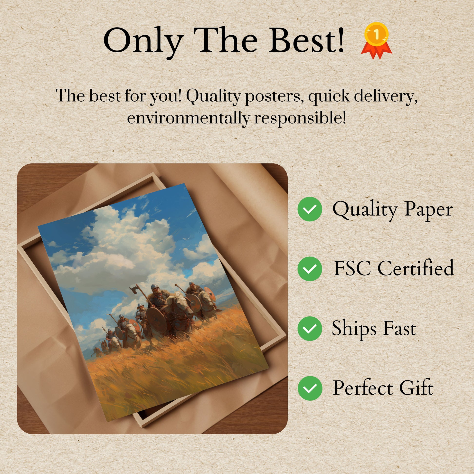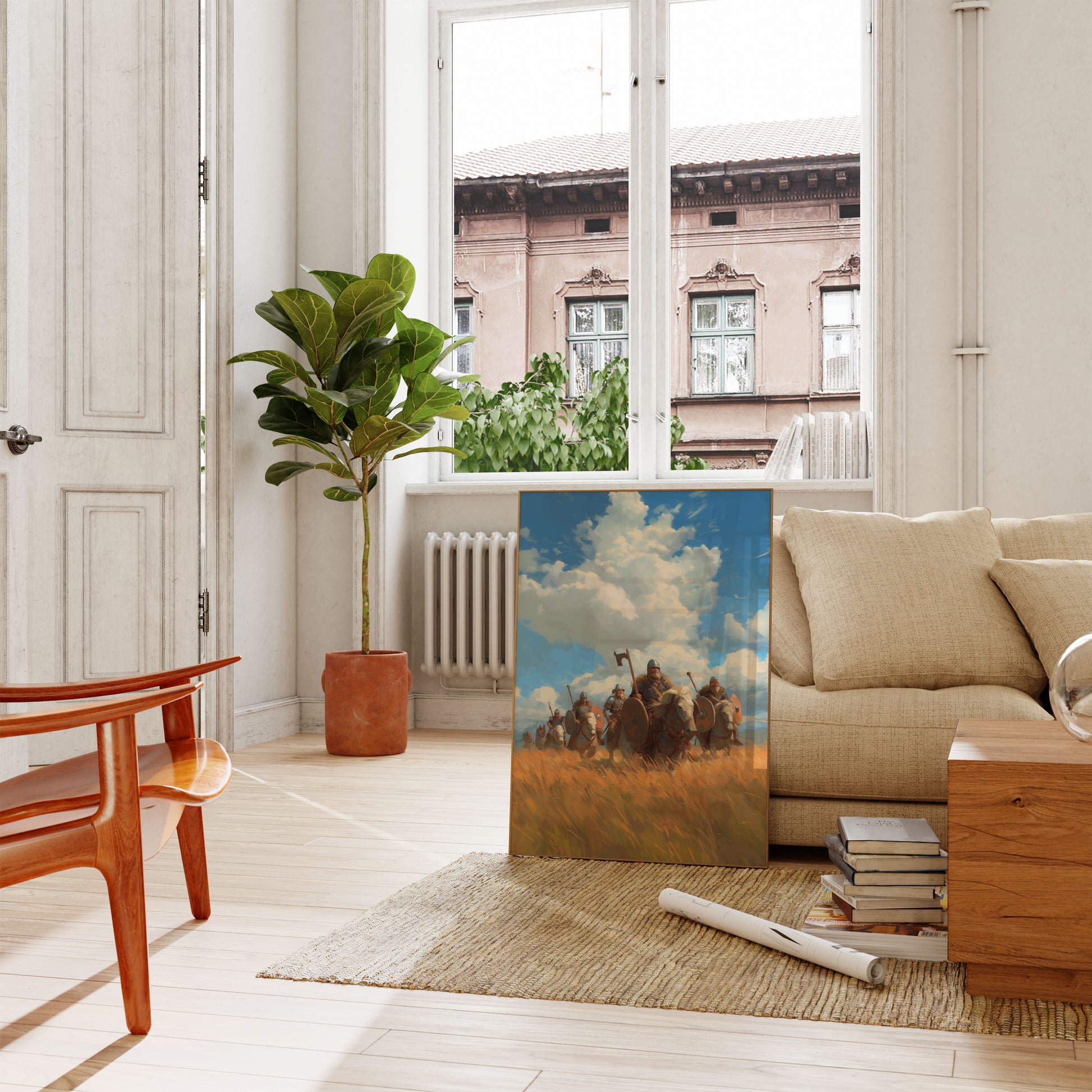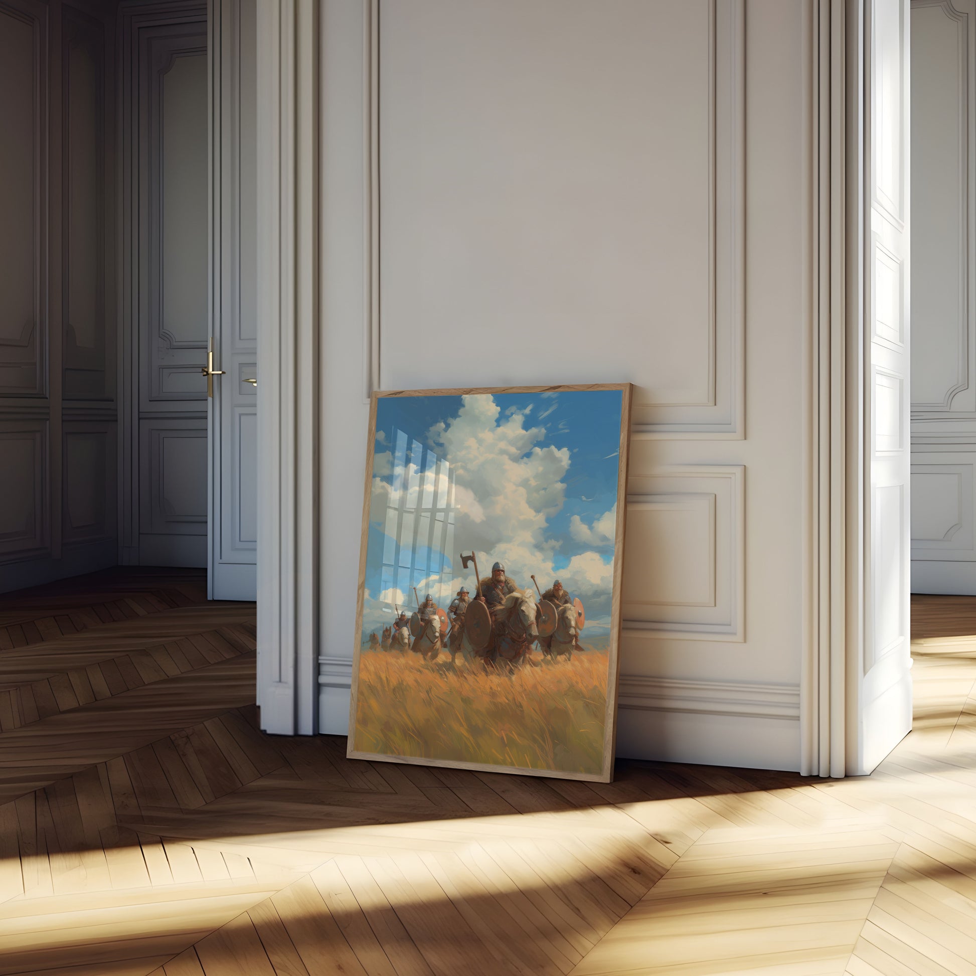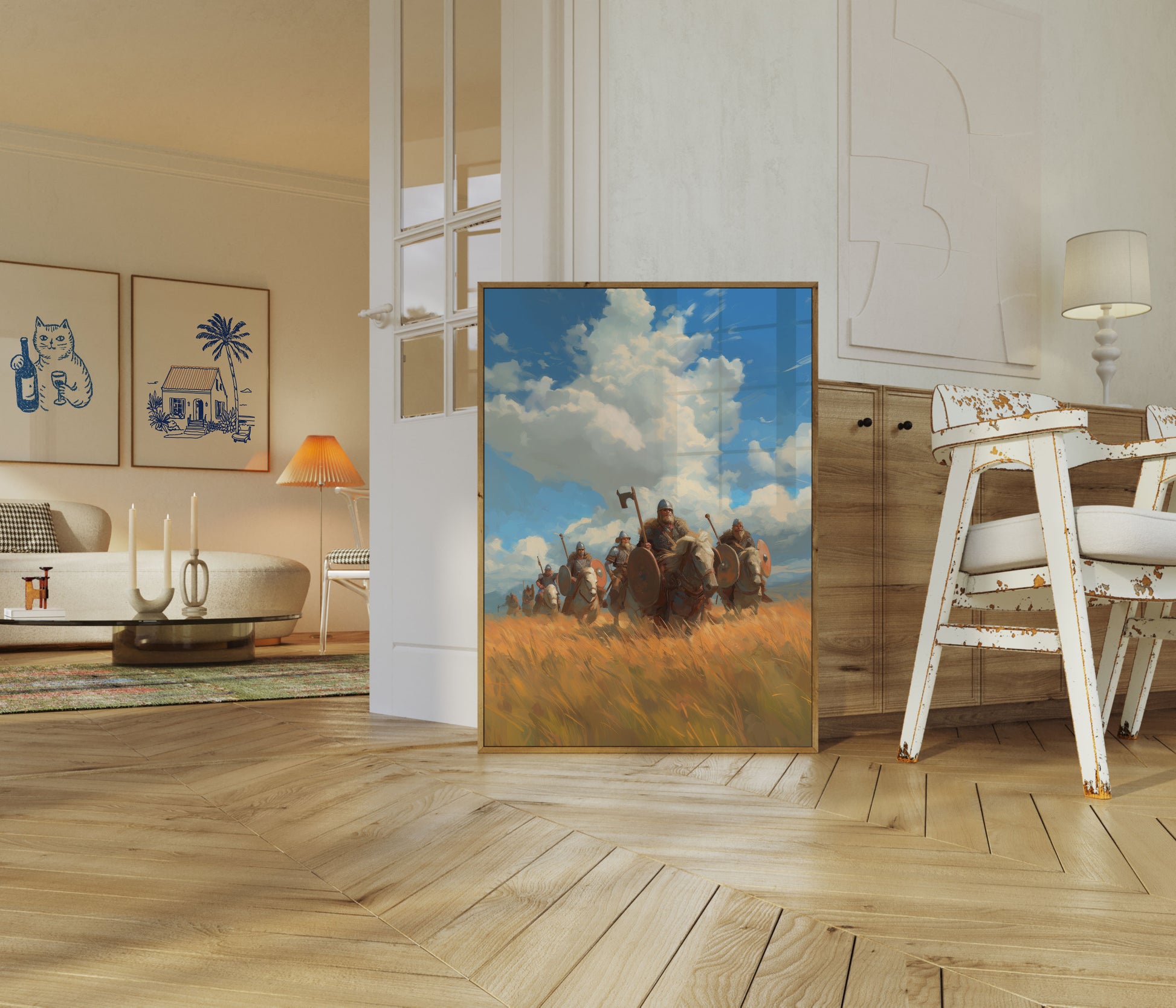 Retumbando sobre praderas doradas bajo imponentes cúmulos, un grupo de guerreros vikingos cabalga con férrea determinación. Sus caballos blancos surcan las olas ambarinas del grano, con escudos redondos relucientes y hachas de guerra listas. Esta impresionante obra de arte captura la energía pura y el espíritu aventurero de los guerreros nórdicos en la cúspide de sus legendarios viajes.