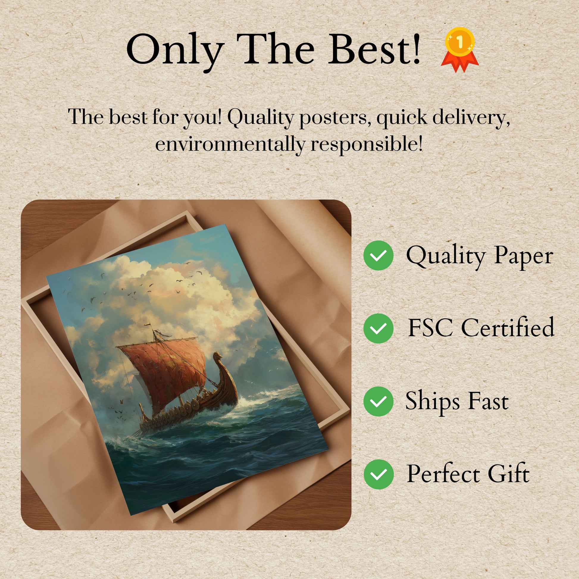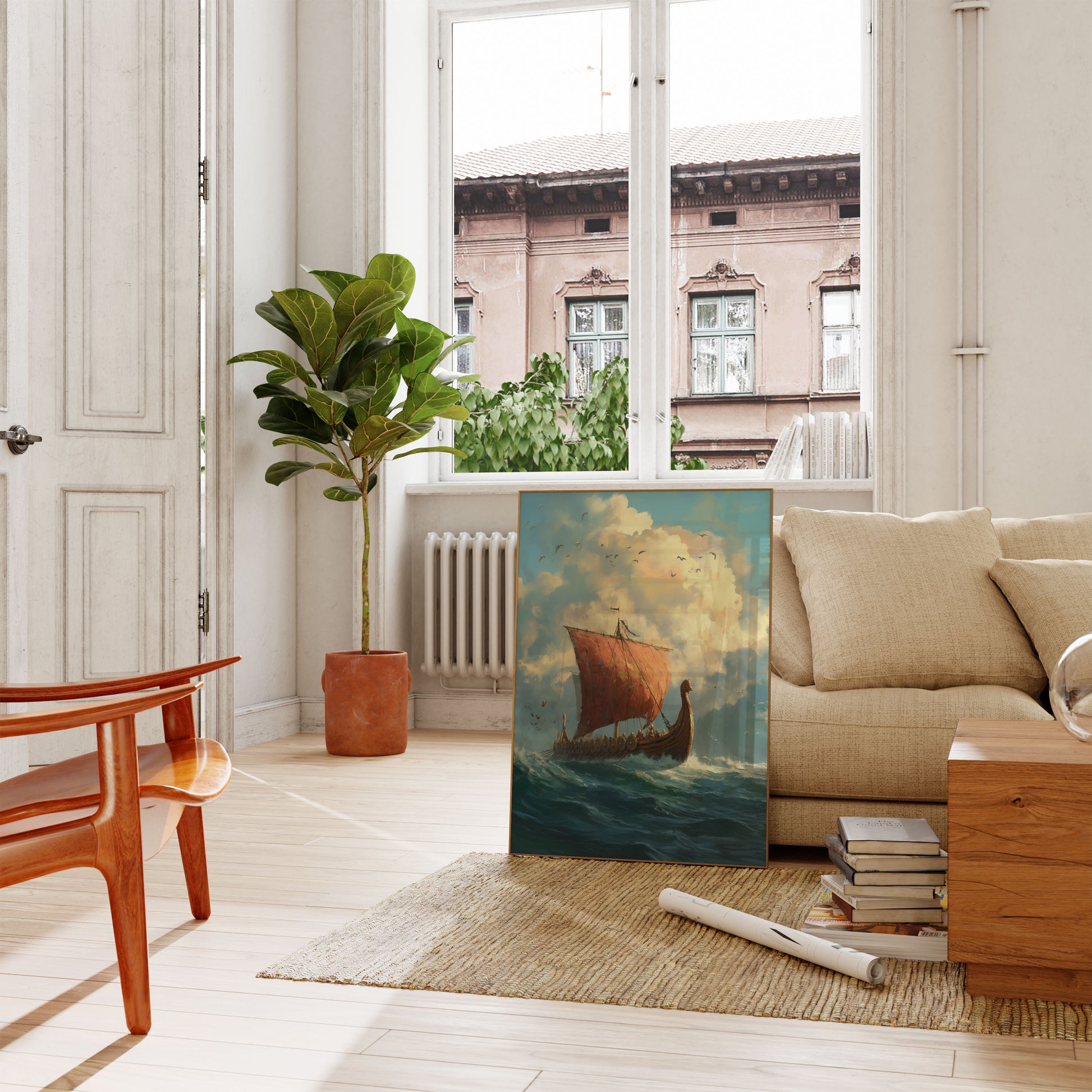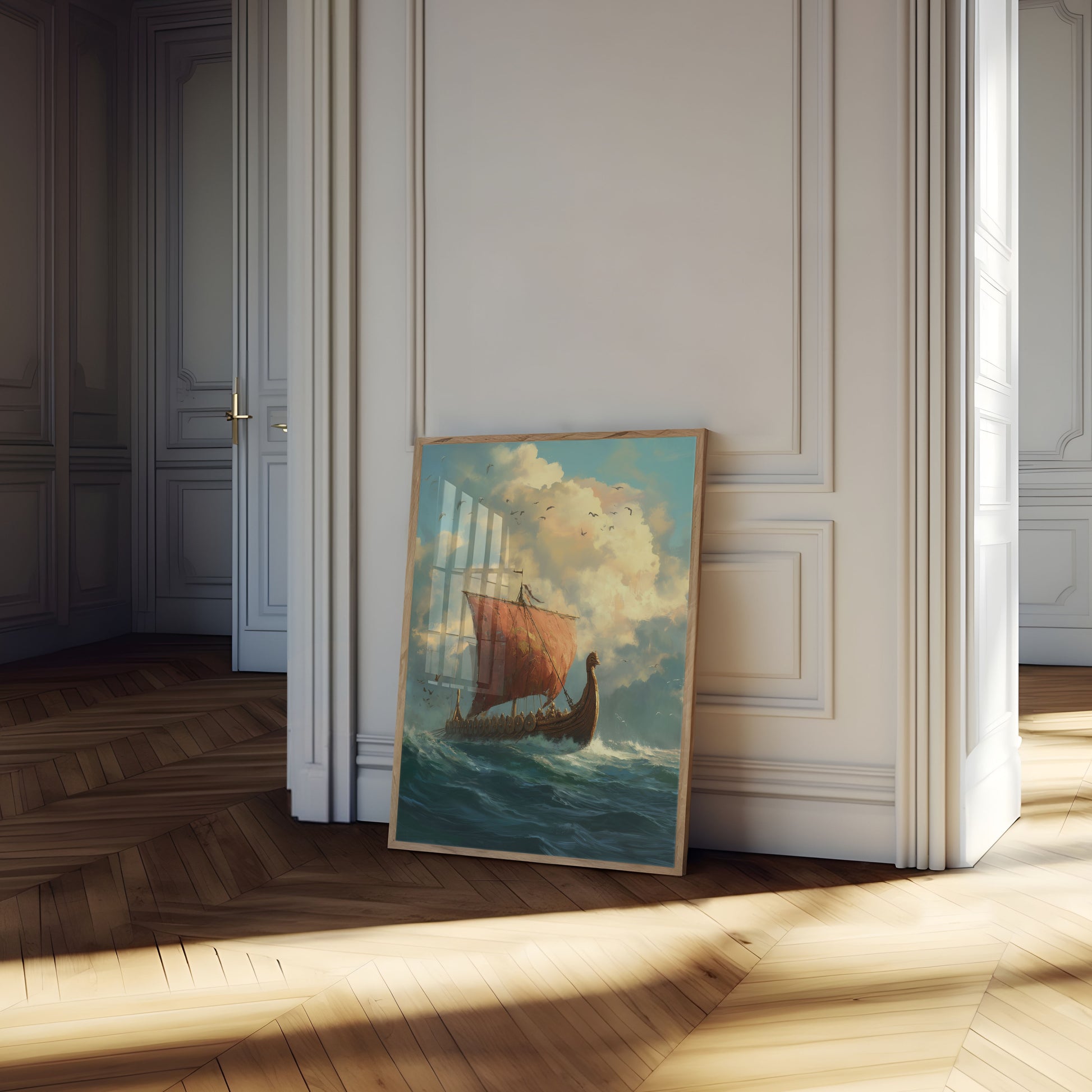 Embárcate en una impresionante aventura marítima con esta impresionante obra de arte de un drakkar vikingo. Capturando la fuerza bruta del mar y el espíritu indomable de los exploradores nórdicos, la pintura muestra un majestuoso navío de vela roja surcando turbulentas olas esmeralda bajo un espectacular paisaje de nubes. Las aves marinas vuelan en círculos, aportando movimiento y profundidad a esta épica escena marítima que evoca el romance y el peligro de la navegación antigua.