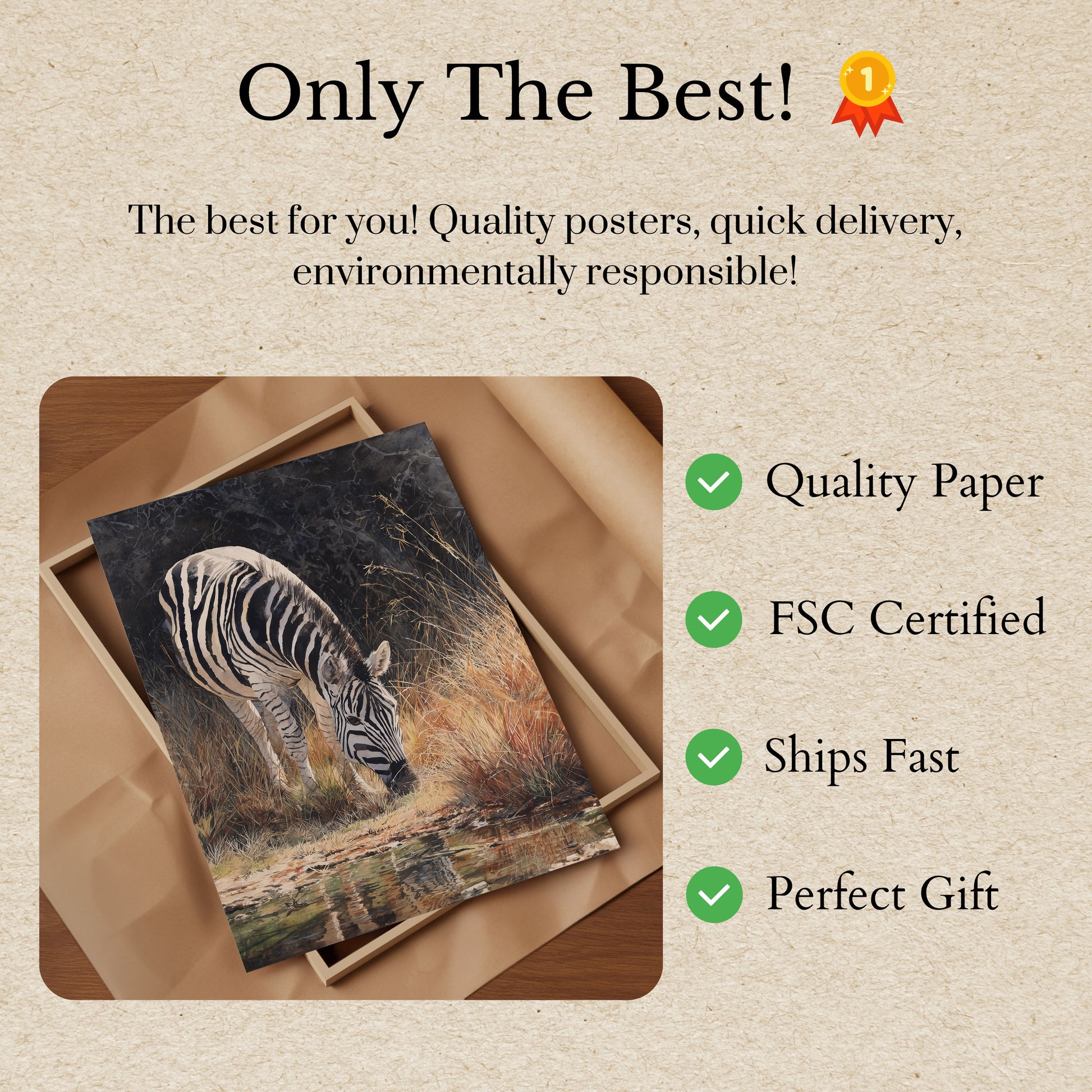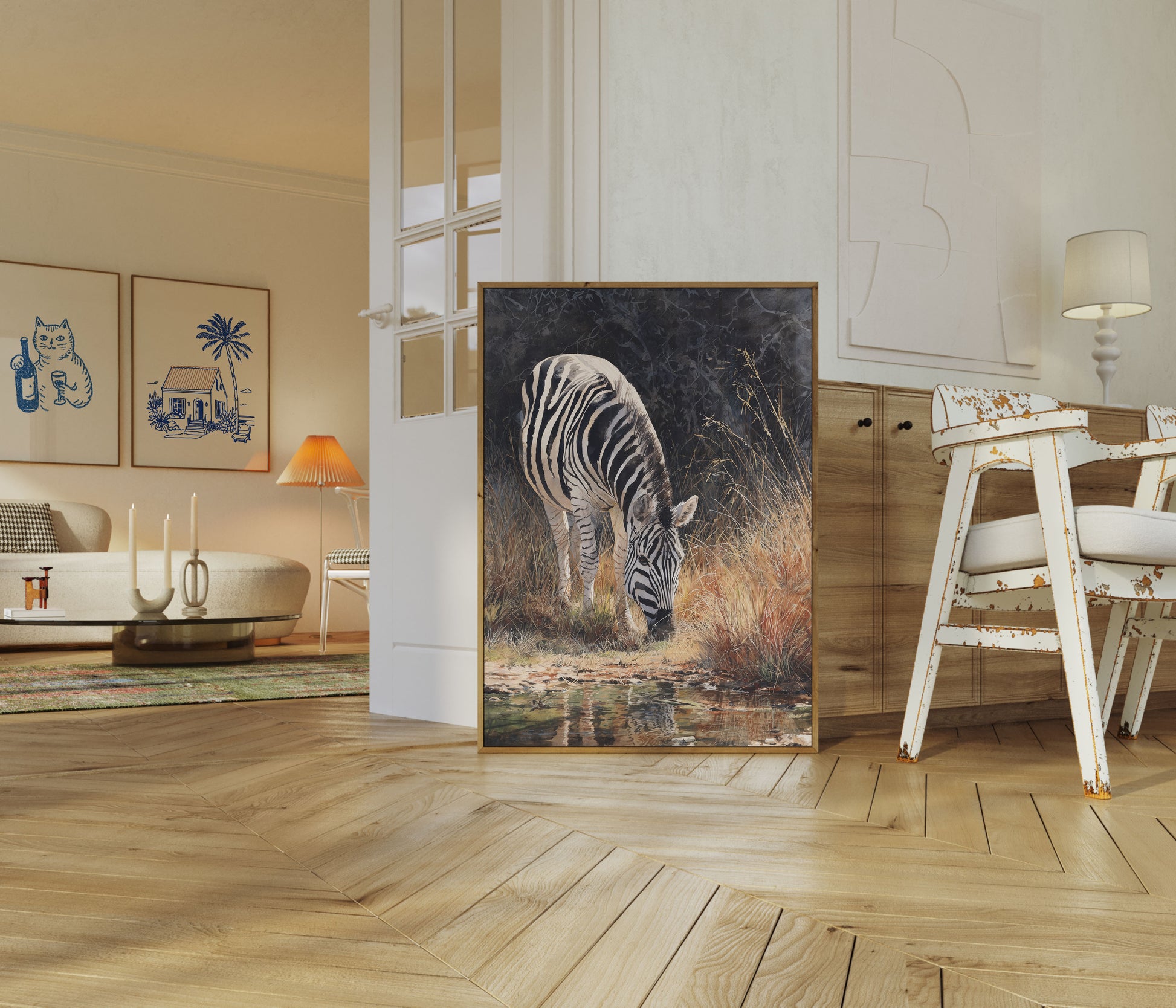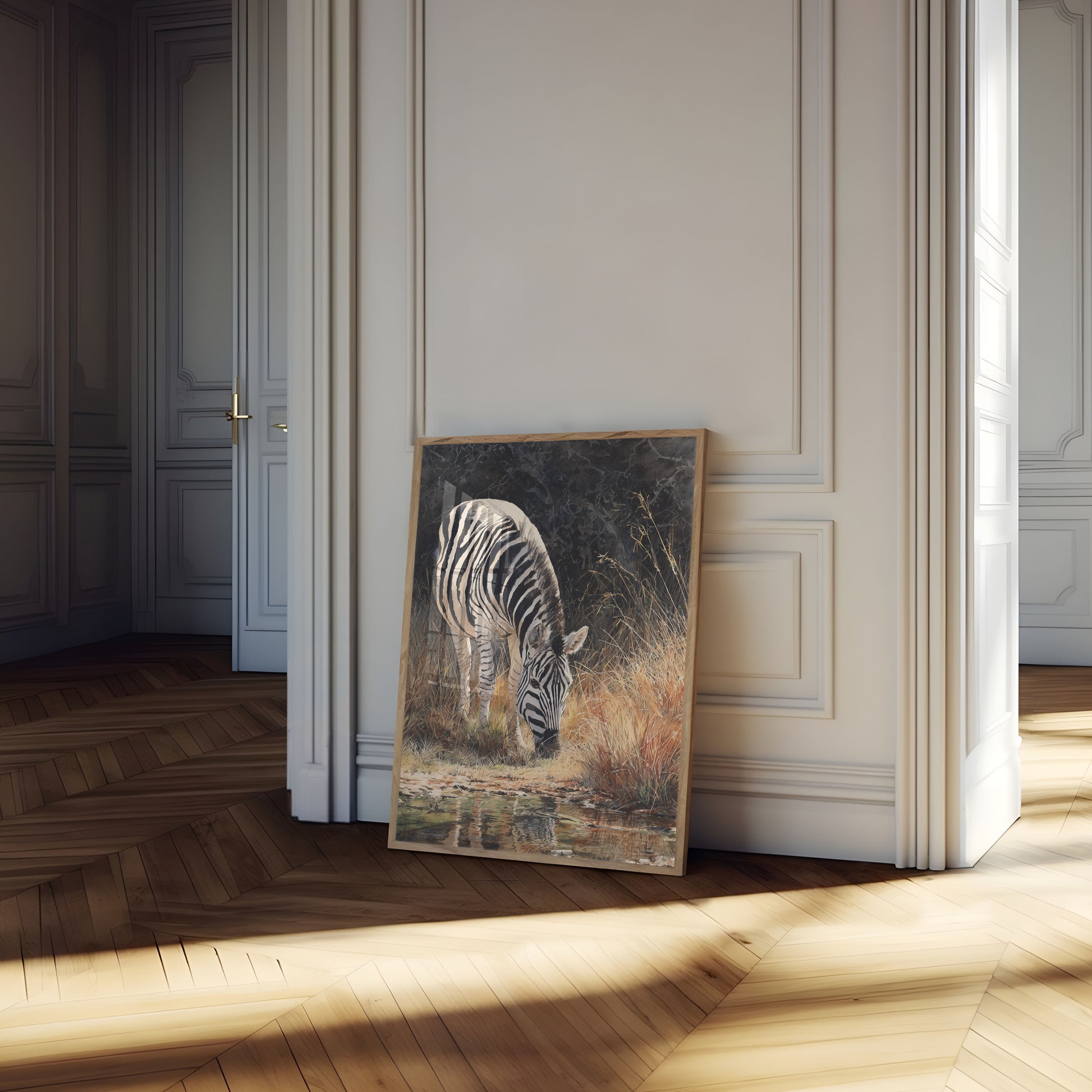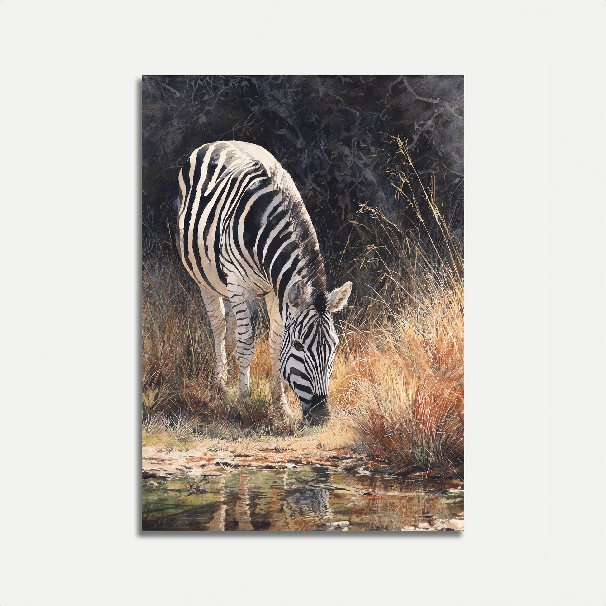 Sumérgete en la impresionante belleza de esta impresionante acuarela de cebra, que captura la serenidad de una cebra bebiendo en un tranquilo abrevadero. Los intrincados detalles de las distintivas rayas blancas y negras del animal contrastan a la perfección con la cálida hierba dorada y el sombrío fondo oscuro. Esta obra de arte de la vida silvestre lleva la esencia pura de la sabana africana directamente a tu hogar.