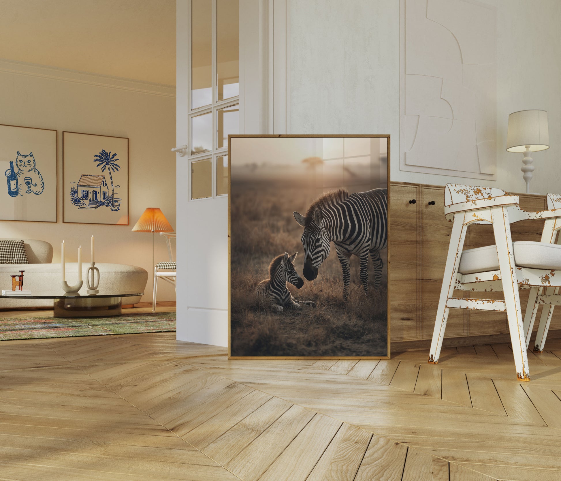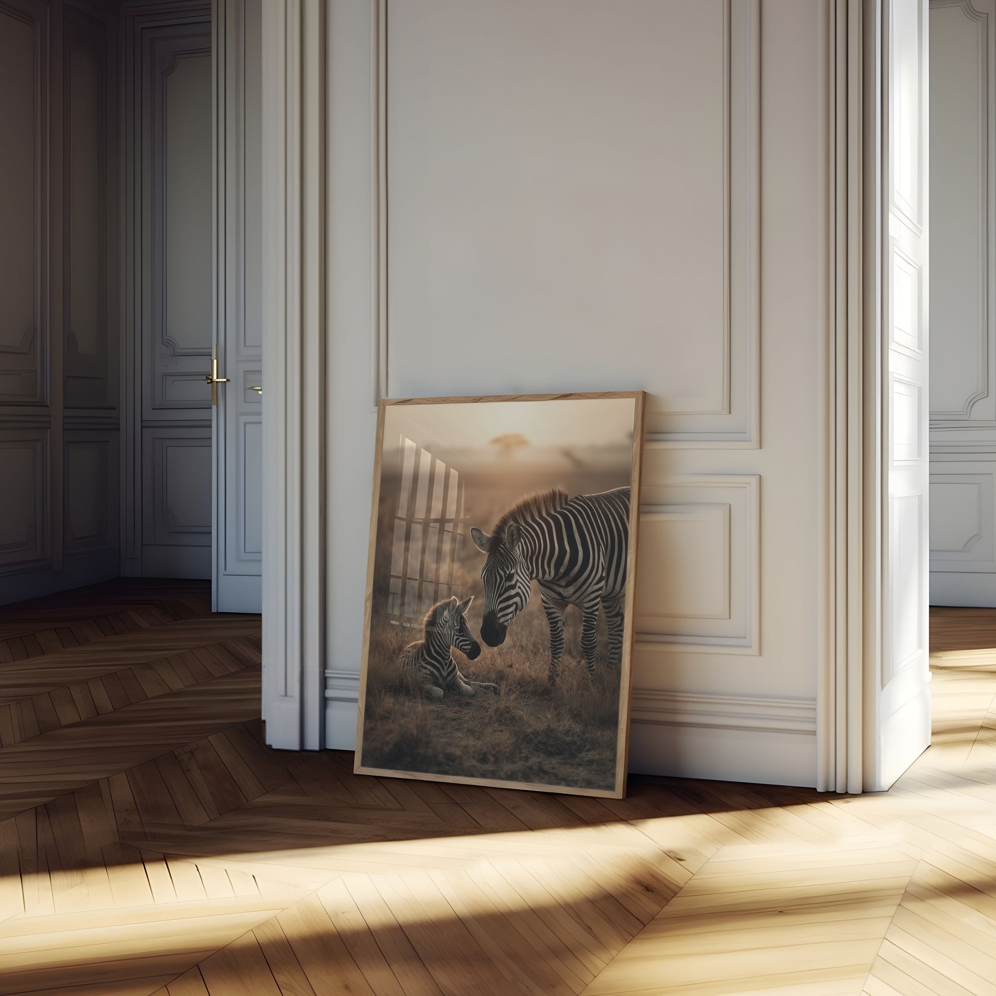 Captura el tierno vínculo de la naturaleza con esta impresionante escena de vida silvestre que presenta a una cebra madre y su cría. Con el suave y dorado amanecer de la sabana africana como fondo, la imagen irradia calidez e intimidad, con una delicada iluminación de fondo que ilumina sus distintivas rayas blancas y negras. La delicada interacción entre la cebra adulta de pie y la cría en reposo crea un poderoso momento de protección y amor maternal.