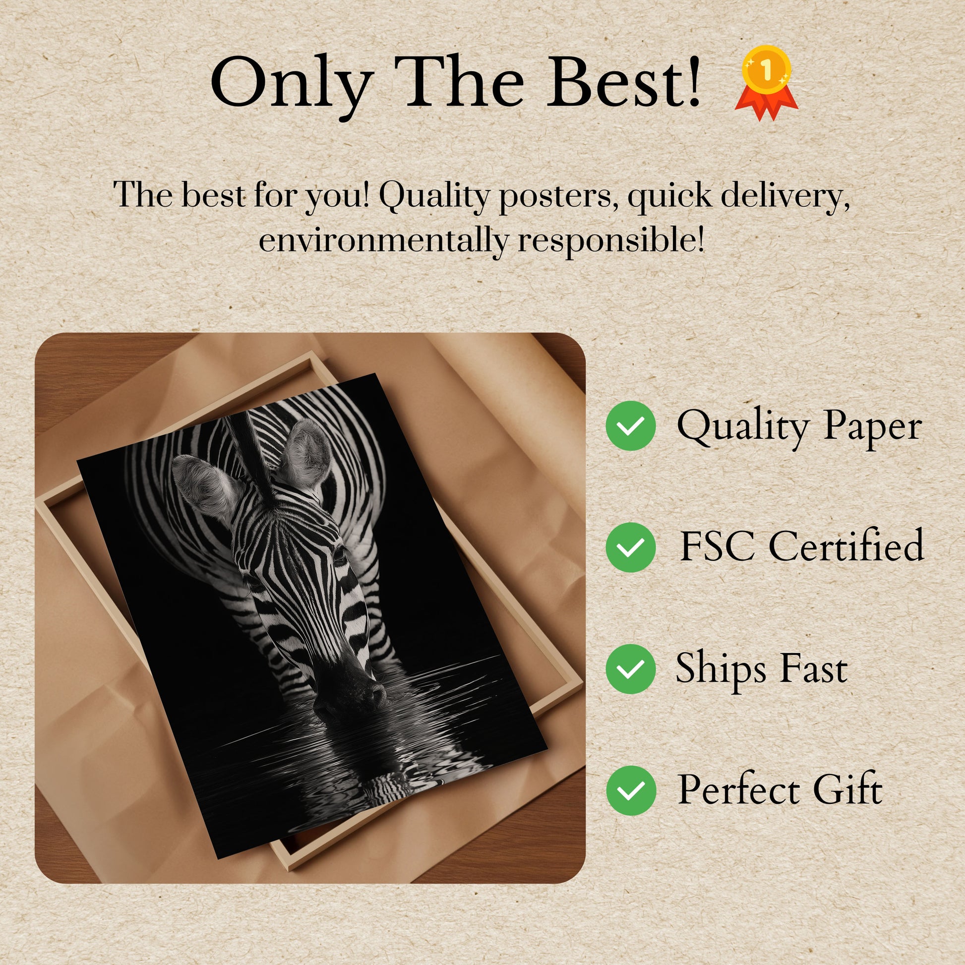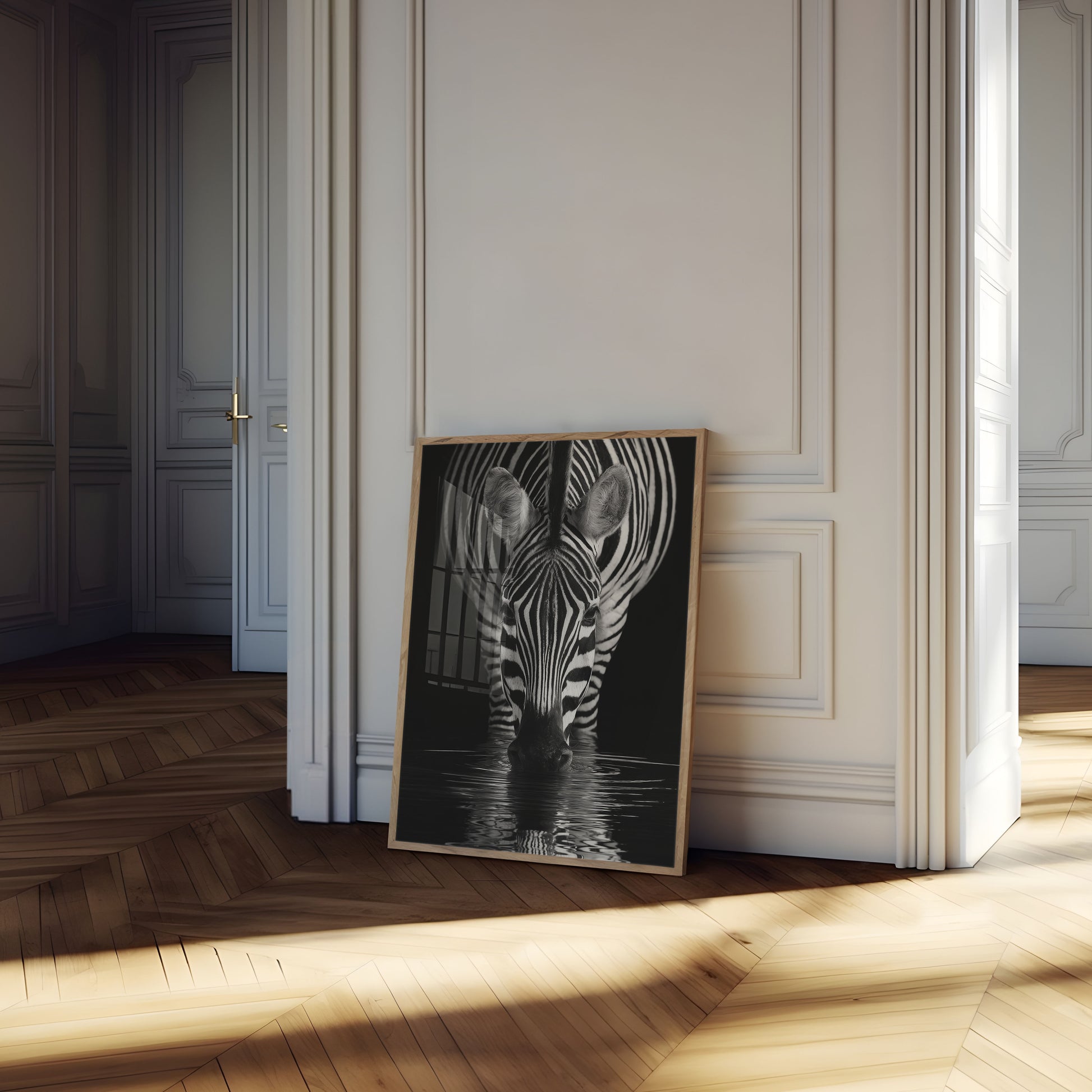 Sumérgete en el fascinante mundo de la impactante silueta en blanco y negro de una cebra, capturada en esta impresionante obra monocromática. La imagen revela la elegante silueta del animal reflejada en el agua quieta, creando una hipnótica sinfonía visual de rayas y ondas. Cada detalle, desde las atentas orejas de la cebra hasta su brillante hocico, cobra vida sobre un dramático fondo oscuro, invitando al espectador a un momento de profunda belleza natural.