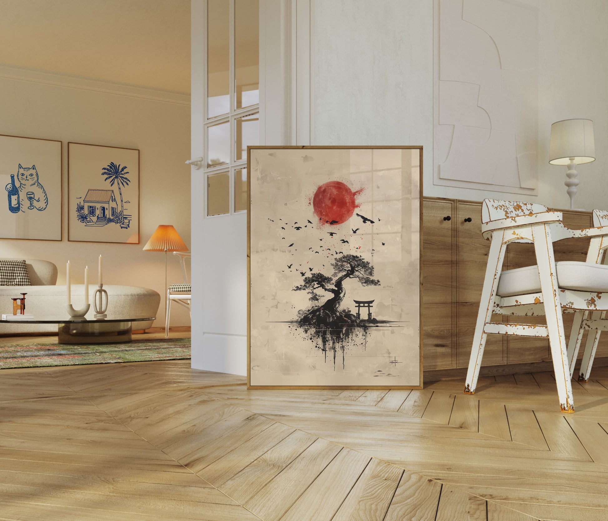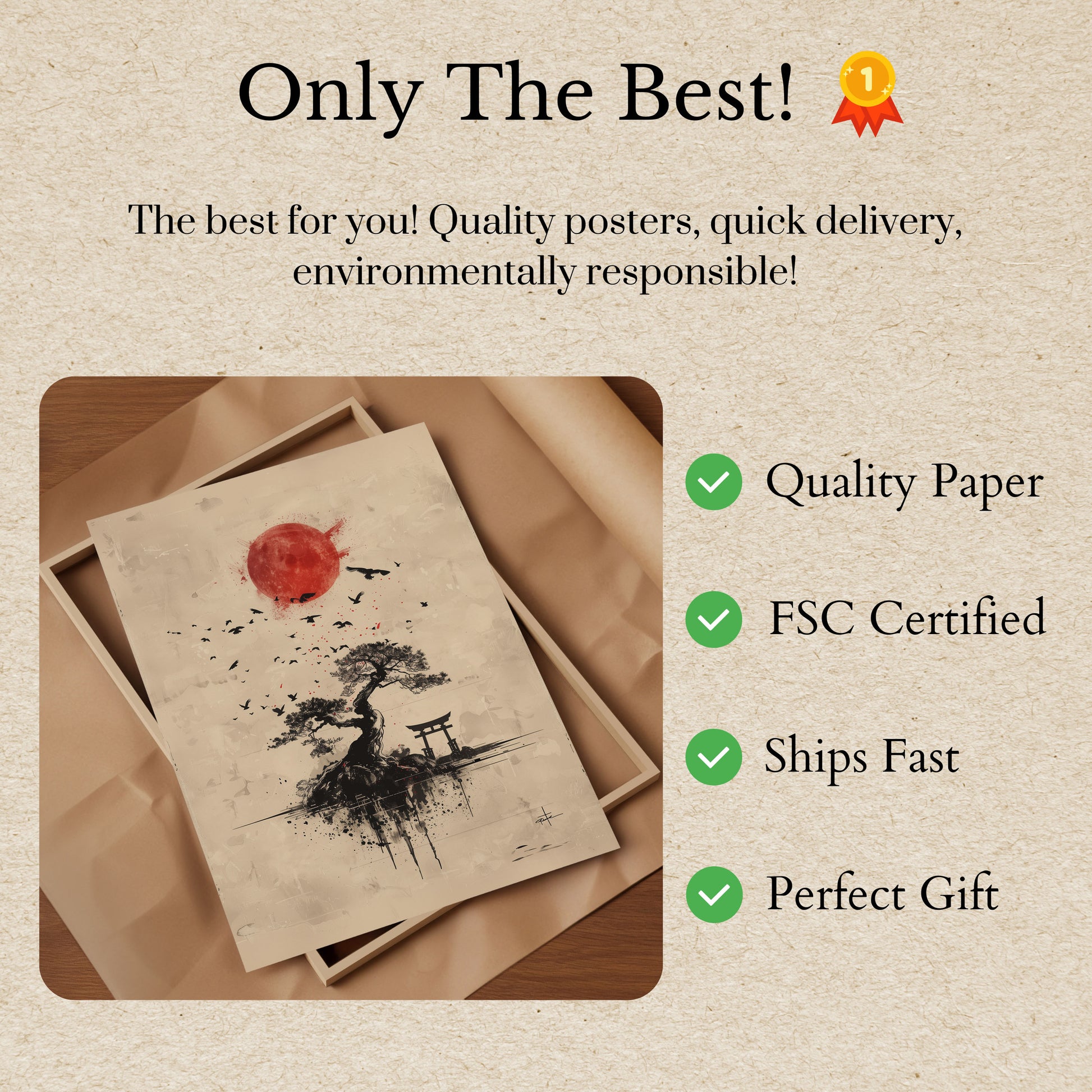 Experimente la serena belleza del arte japonés con este impresionante póster de paisaje que presenta un bonsái retorcido, un vibrante sol rojo y una puerta torii tradicional. El diseño monocromático con toques carmesí captura el delicado equilibrio entre naturaleza, espiritualidad y tranquilidad, creando un fascinante viaje visual que le transporta al corazón de la filosofía estética japonesa.