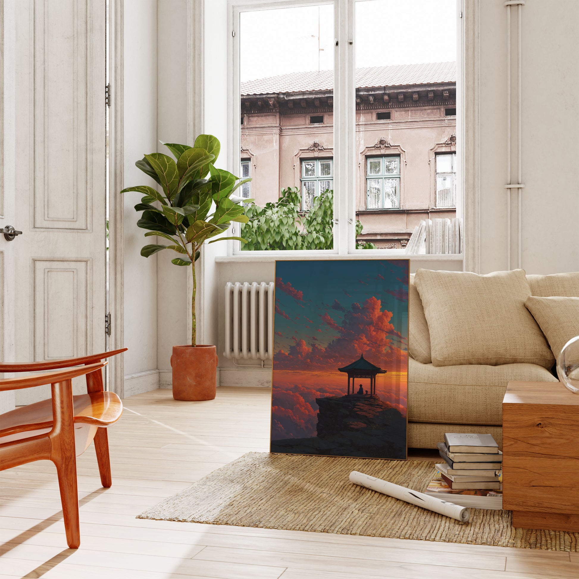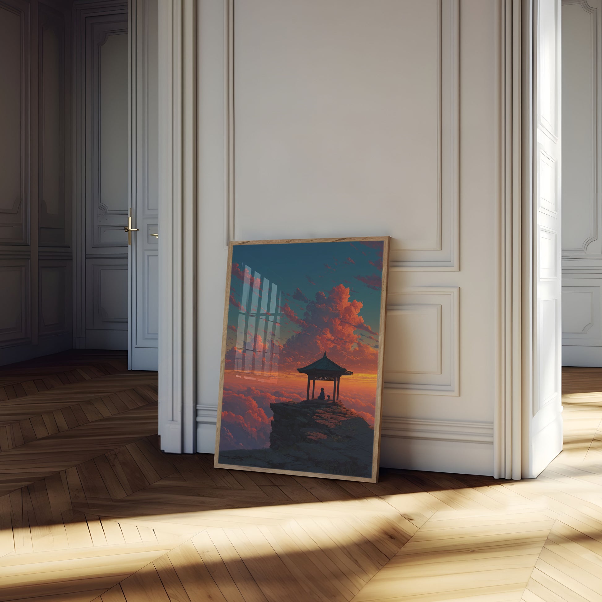 Sumérgete en la imponente serenidad de este impresionante paisaje donde una figura solitaria medita tranquilamente en un pabellón tradicional de estilo asiático, encaramado dramáticamente sobre un afloramiento rocoso, sobre un mar de vibrantes nubes color atardecer. La imagen captura un momento de profunda tranquilidad, con ondulantes nubes anaranjadas y carmesí que crean un fondo cautivador contra un cielo verde azulado intenso, simbolizando la paz interior y la elevación espiritual.