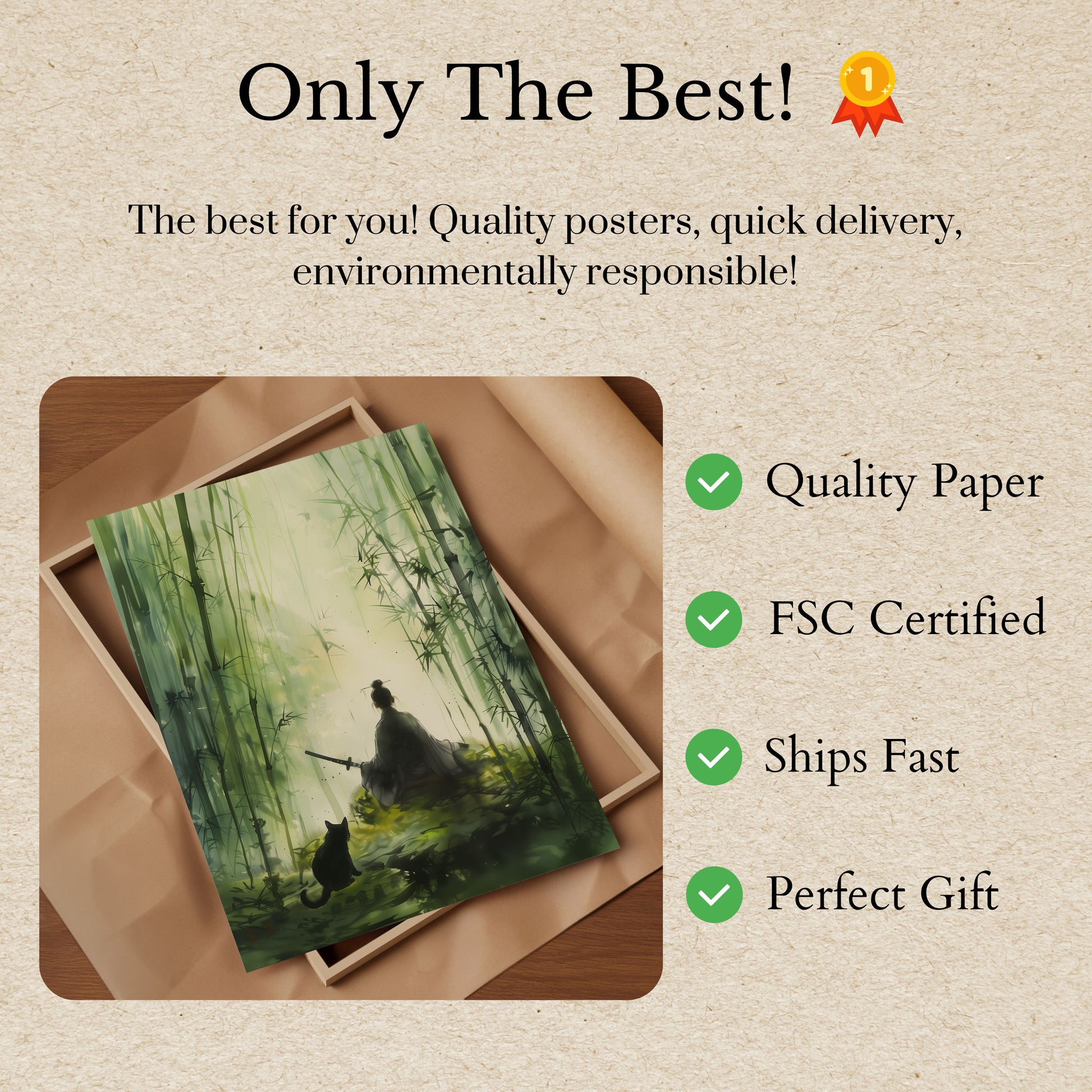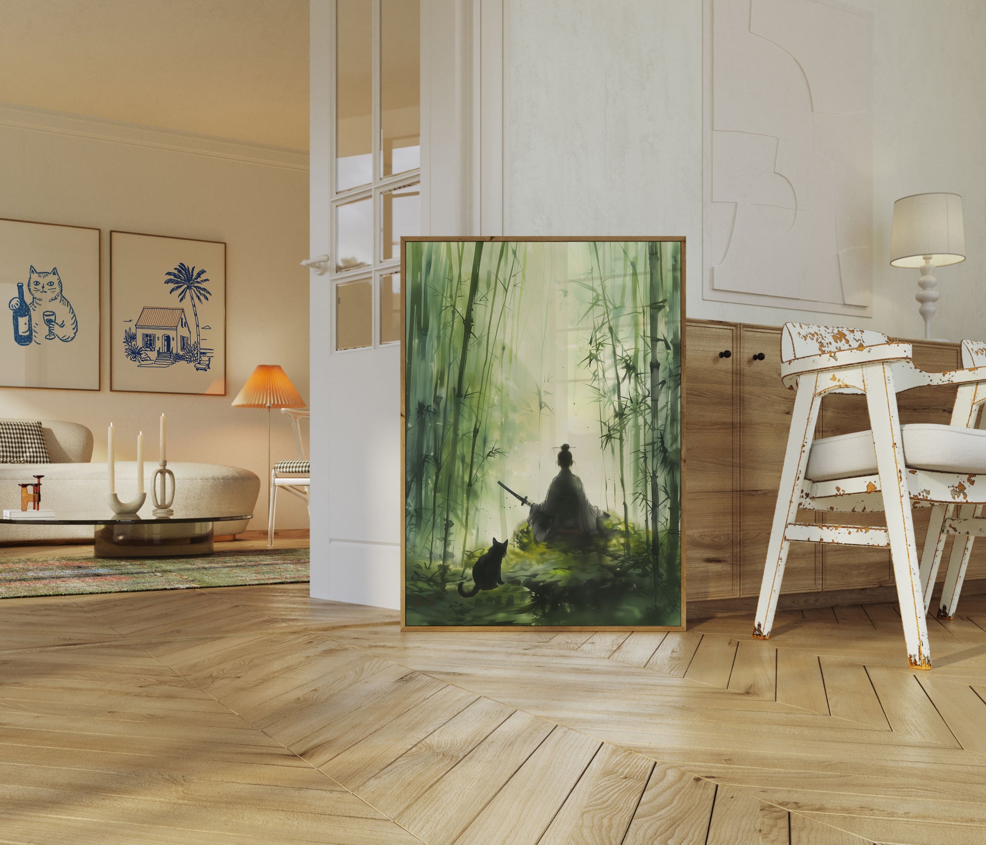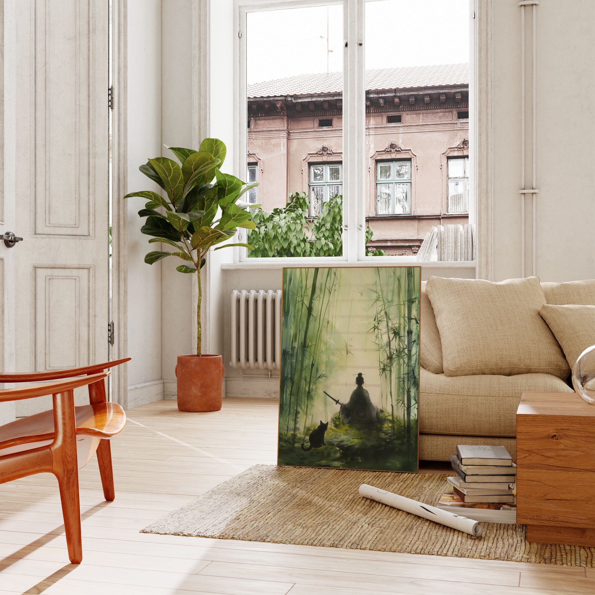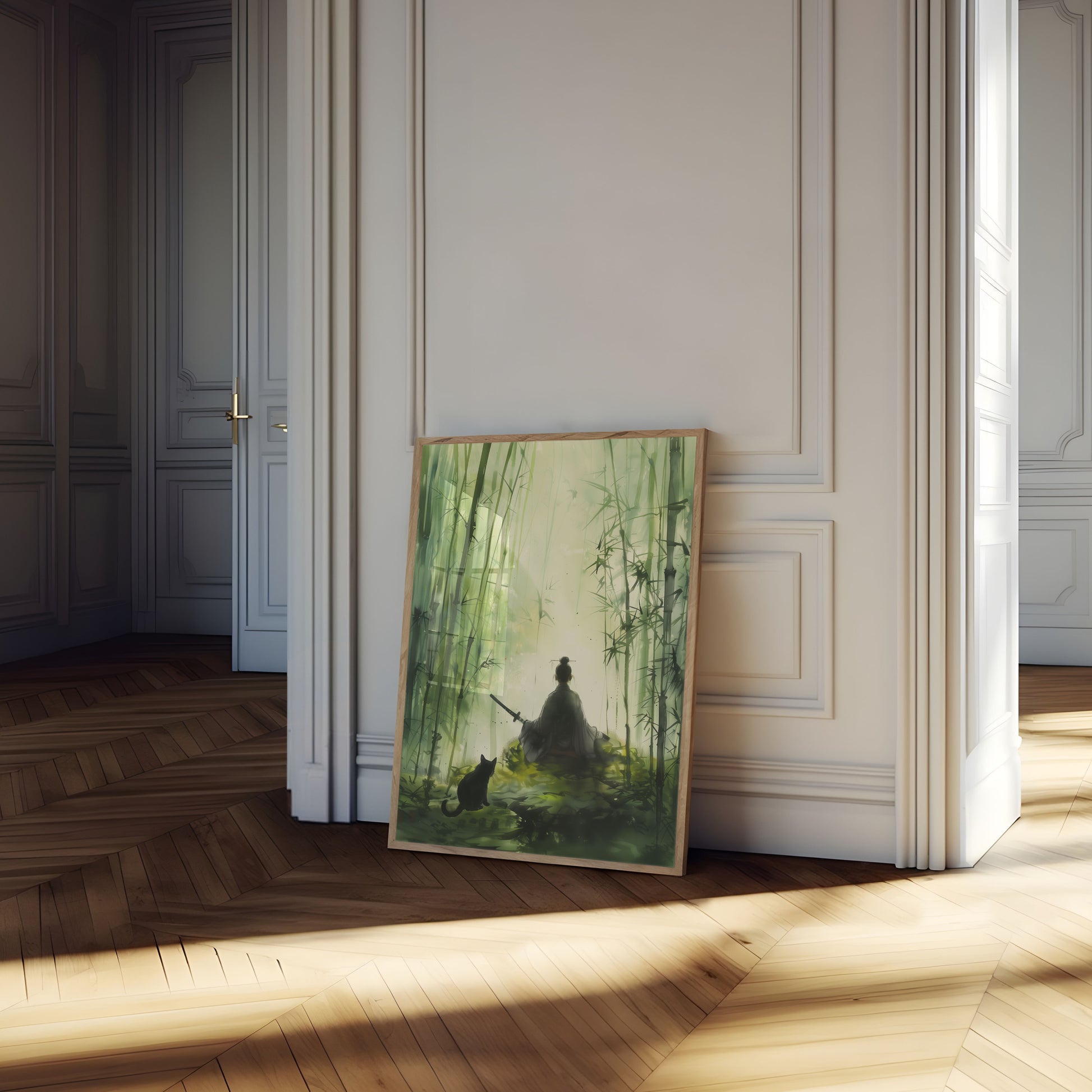 Adéntrese en un mundo sereno y místico donde una figura solitaria medita en medio de un exuberante y brumoso bosque de bambú. Los suaves tonos verdes se combinan a la perfección, creando una atmósfera etérea de calma e introspección. Un gato negro se sienta cerca, aportando un toque de silenciosa compañía a esta tranquila escena que evoca antiguas tradiciones espirituales japonesas.