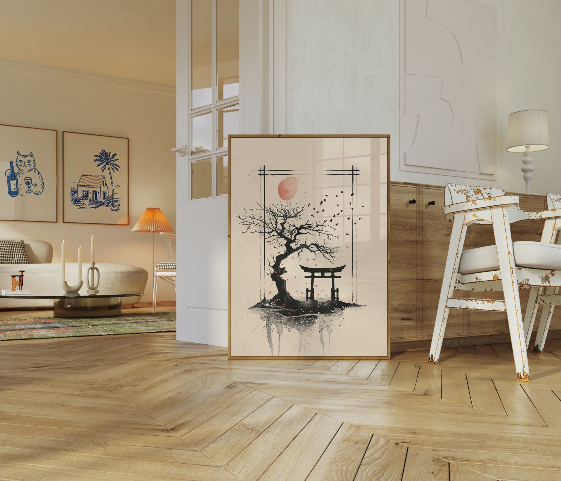 Sumérgete en la serena belleza de esta acuarela de inspiración japonesa, donde un árbol nudoso se yergue como centinela junto a una puerta torii tradicional. Delicados pétalos rojos se deslizan contra un suave atardecer color salmón, mientras una bandada de pájaros alza el vuelo, simbolizando la libertad y el despertar espiritual. El diseño minimalista captura la esencia de la meditación japonesa y la armonía natural.