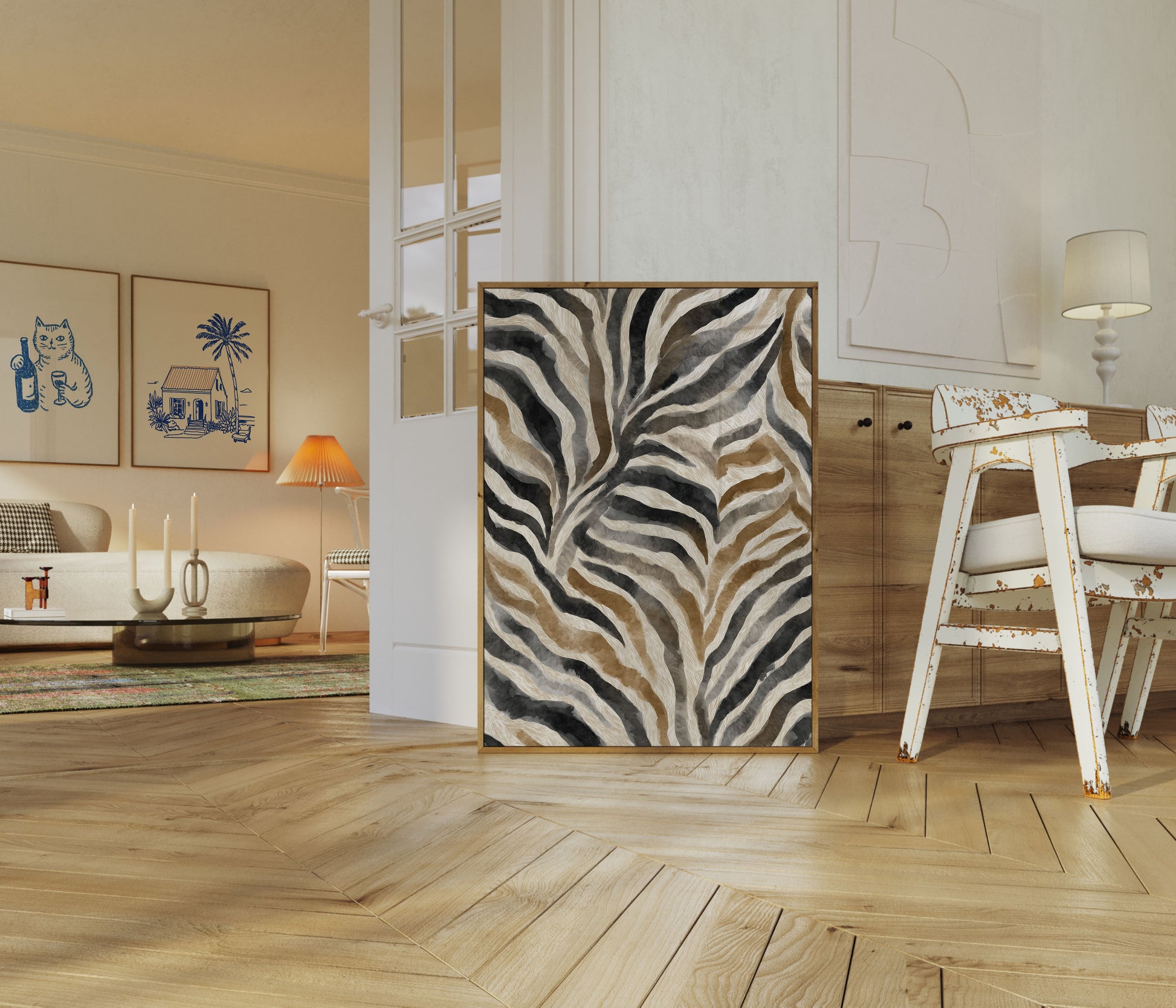 Immerse yourself in the mesmerizing world of organic patterns with this stunning zebra-inspired abstract artwork. Soft earth tones of beige, black, and golden brown flow together in sinuous, wave-like stripes that create a sense of fluid movement and natural rhythm. The watercolor-like texture adds depth and sophistication, transforming the classic zebra stripe motif into a contemporary artistic statement.